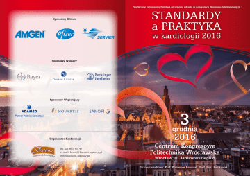 Serdecznie zapraszamy Państwa do wzięcia udziału w Konferencji Naukowo-Szkoleniowej pt.: Sponsorzy Główni Standardy a praktyka w kardiologii 2016 Sponsorzy Wiodący Sponsorzy Wspierający 3 grudnia Organizator Konferencji: tel. 22 885 89 47 e-mail: [email protected] www.batumi-agency.pl 2016 Centrum Kongresowe Politechnika Wrocławska Wrocław ul. Janiszewskiego 8 Patronat naukowy: Prof. Waldemar Banasiak, Prof. Piotr Ponikowski Standardy a praktyka w kardiologii 2016 3grudnia 2016 Szanowni Państwo Z przyjemnością zapraszamy na kolejne sobotnie spotkanie, w trakcie którego będziemy chcieli przedstawić najnowsze wytyczne Europejskiego Towarzystwa Kardiologicznego. Tym razem dotyczą one najczęstszych problemów klinicznych, z którymi spotyka się lekarz rodzinny, internista czy kardiolog w swojej praktyce tj. nadciśnienie tętnicze, prewencja wtórna, dyslipidemie, migotanie przedsionków, niewydolność serca oraz choroby strukturalne serca. Naszym zamysłem jest zaprezentowanie i omówienie tych wytycznych w kontekście praktycznego ich wykorzystania. Serdecznie zapraszamy do udziału w konferencji. Prof. Waldemar Banasiak Prof. Piotr Ponikowski Uczestnicy Konferencji otrzymają certyfikaty potwierdzające punkty edukacyjne Okręgowej Izby Lekarskiej we Wrocławiu – na podstawie Rozporządzenia Ministra Zdrowia z dn. 6 października 2004 r. (Dz. U. Nr 231, poz. 2326). Konferencja skierowana jest do osób uprawnionych do wystawiania recept lub osób prowadzących obrót produktami leczniczymi – podstawa prawna Ustawa z dn. 6 września 2001 r. Prawo farmaceutyczne (Dz. U. z 2008, nr 234, poz. 1570). Dla zainteresowanych zapewniamy bezpłatny parking w PASAŻU GRUNWALDZKIM, wjazd od ul. Skłodowskiej-Curie (przy stacji ORLEN). Bilet parkingowy należy podstemplować w Rejestracji Konferencji u organizatora – Agencji Batumi. Udział lekarzy w Konferencji jest bezpłatny. Program Konferencji Naukowo-Szkoleniowej pt. „Standardy a praktyka w kardiologii 2016” 09.00Otwarcie Konferencji Przewodniczący: Prof. Waldemar Banasiak, Prof. Piotr Ponikowski, Dr med. Jacek Skiba 09.00-10.40I Sesja 9.00-9.25 Nadciśnienie tętnicze – co nowego w 2016 roku? Dr med. Jolanta Petruk-Kowalczyk 9.25-9.55Prewencja wtórna i dyslipidemia – zastosowanie nowych zasad w różnych sytuacjach klinicznych Prof. Piotr Ponikowski 9.55-10.20 Problemy kardiologiczne u chorych onkologicznych Dr med. Robert Zymliński 10.20-10.40 Panel dyskusyjny 10.40-11.00 Przerwa kawowa 11.00-12.20 II Sesja 11.00-11.30 Migotanie przedsionków. Prewencja udaru mózgu – czy rzeczywiście najważniejszy cel terapeutyczny. Prof. Waldemar Banasiak 11.30-12.00 Strategia kontroli vs rytmu – komu, kiedy i jak? Dr med. Dariusz Jagielski 12.00-12.20 Panel dyskusyjny 12.20-12.40 Przerwa kawowa 12.40-14.30 III Sesja 12.40-13.10 Niewydolność serca Leczenie niewydolności serca w różnych scenariuszach klinicznych. Prof. Ewa Jankowska 13.10-13.30Przewlekła niewydolność serca – kiedy i jak leczyć w opinii kardiologa interwencyjnego? Prof. Krzysztof Reczuch 13.30-13.50Przewlekła niewydolność serca – kiedy i jak leczyć w opinii kardiochirurga? Dr med. Jacek Skiba 13.50-14.05 Panel dyskusyjny 14.05-14.30Choroby strukturalne serca – co może zaproponować współczesna kardiologia? Dr med. Dorota Kustrzycka-Kratochwil 14.30 Lunch