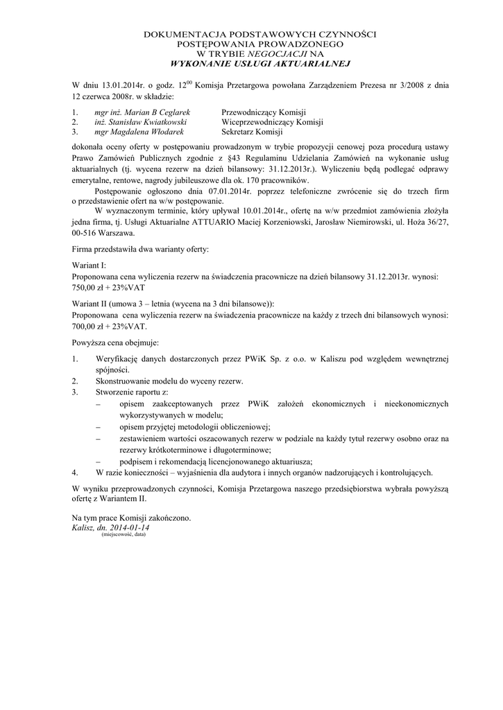 DOKUMENTACJA PODSTAWOWYCH CZYNNOŚCI POSTĘPOWANIA PROWADZONEGO W TRYBIE NEGOCJACJI NA WYKONANIE USŁUGI AKTUARIALNEJ W dniu 13.01.2014r. o godz. 1200 Komisja Przetargowa powołana Zarządzeniem Prezesa nr 3/2008 z dnia 12 czerwca 2008r. w składzie: 1. 2. 3. mgr inż. Marian B Ceglarek inż. Stanisław Kwiatkowski mgr Magdalena Włodarek Przewodniczący Komisji Wiceprzewodniczący Komisji Sekretarz Komisji dokonała oceny oferty w postępowaniu prowadzonym w trybie propozycji cenowej poza procedurą ustawy Prawo Zamówień Publicznych zgodnie z §43 Regulaminu Udzielania Zamówień na wykonanie usług aktuarialnych (tj. wycena rezerw na dzień bilansowy: 31.12.2013r.). Wyliczeniu będą podlegać odprawy emerytalne, rentowe, nagrody jubileuszowe dla ok. 170 pracowników. Postępowanie ogłoszono dnia 07.01.2014r. poprzez telefoniczne zwrócenie się do trzech firm o przedstawienie ofert na w/w postępowanie. W wyznaczonym terminie, który upływał 10.01.2014r., ofertę na w/w przedmiot zamówienia złożyła jedna firma, tj. Usługi Aktuarialne ATTUARIO Maciej Korzeniowski, Jarosław Niemirowski, ul. Hoża 36/27, 00-516 Warszawa. Firma przedstawiła dwa warianty oferty: Wariant I: Proponowana cena wyliczenia rezerw na świadczenia pracownicze na dzień bilansowy 31.12.2013r. wynosi: 750,00 zł + 23%VAT Wariant II (umowa 3 – letnia (wycena na 3 dni bilansowe)): Proponowana cena wyliczenia rezerw na świadczenia pracownicze na każdy z trzech dni bilansowych wynosi: 700,00 zł + 23%VAT. Powyższa cena obejmuje: 1. 2. 3. 4. Weryfikację danych dostarczonych przez PWiK Sp. z o.o. w Kaliszu pod względem wewnętrznej spójności. Skonstruowanie modelu do wyceny rezerw. Stworzenie raportu z: opisem zaakceptowanych przez PWiK założeń ekonomicznych i nieekonomicznych wykorzystywanych w modelu; opisem przyjętej metodologii obliczeniowej; zestawieniem wartości oszacowanych rezerw w podziale na każdy tytuł rezerwy osobno oraz na rezerwy krótkoterminowe i długoterminowe; podpisem i rekomendacją licencjonowanego aktuariusza; W razie konieczności – wyjaśnienia dla audytora i innych organów nadzorujących i kontrolujących. W wyniku przeprowadzonych czynności, Komisja Przetargowa naszego przedsiębiorstwa wybrała powyższą ofertę z Wariantem II. Na tym prace Komisji zakończono. Kalisz, dn. 2014-01-14 (miejscowość, data)