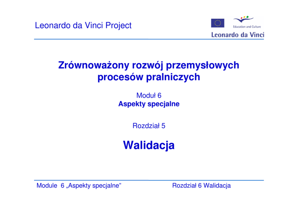 Leonardo da Vinci Project Zrównoważony rozwój przemysłowych procesów pralniczych Moduł 6 Aspekty specjalne Rozdział 5 Walidacja Module 6 „Aspekty specjalne” Rozdział 6 Walidacja Treść Walidacja, definicja - Dlaczego proces walidacji w pralniach przemysłowych? Efekty pierwotne Efekty wtórne Wpływ parametrów procesu prania Kryteria testu Tkaniny testowe Tkanina kontrolna procesu prania (bawełniana standardowa zgodnie z DIN 53919) Module 6 „Aspekty specjalne” Rozdział 6 Walidacja Cele nauczania Po ukończeniu tego rozdziału będziesz Znał definicję walidacji Znał funkcję i cel procesów walidacji w pralniach przemysłowych i będziesz w stanie ustalić korelację z zagadnieniem zrównoważonego rozwoju Znał pierwotne efekty procesu prania Znał wtórne efekty procesu prania Znał wpływ parametrów procesu prania Znał kryteria testu Module 6 „Aspekty specjalne” Rozdział 6 Walidacja Walidacja: Definicja Walidacja oznacza testowanie specjalnej procedury w odniesieniu do jej skuteczności - Oznacza sprawdzenie czy zakładane cele będą rzeczywiście osiągnięte przez zastosowanie procedury W odniesieniu do procesu prania oznacza to Sprawdzenie czy zakładane cele jakości zostaną osiągnięte przez zastosowanie odpowiedniego procesu prania Module 6 „Aspekty specjalne” Rozdział 6 Walidacja Dlaczego proces walidacji w pralniach przemysłowych? Stała kontrola procesu prania zapewnia stałą jakość rezultatów i odsłania odpowiednio pojawiający się spadek jakości Dlatego można wpływać na proces z wyprzedzeniem Mogą być zidentyfikowane potencjalne oszczędności podczas zachowania niezbędnej jakości Brak kosztów ogólnych, energii i zasobów w wyniku dodatkowych procesów prania w przypadkach niezadowalających wyników Module 6 „Aspekty specjalne” Rozdział 6 Walidacja Efekty pierwotne Efekty pierwotne to: • Optymalne usuwanie zabrudzeń • Usuwanie zapachu • Przywrócenie tekstyliom pożądanych właściwości efekty pierwotne procesu prania są rozpoznawalne natychmiast po zakończeniu procesu Module 6 „Aspekty specjalne” Rozdział 6 Walidacja Efekty pierwotne Są efektami pożądanymi Przywracają tekstyliom jakość Przywracają cechy użytkowe tekstyliom Module 6 „Aspekty specjalne” Rozdział 6 Walidacja Kryteria testu efekty pierwotne procesu prania Efektywność procesu prania Usuwanie tłuszczu i oleju Skuteczność procesu bielenia Enzymatyczne usuwanie plam Module 6 „Aspekty specjalne” Rozdział 6 Walidacja Kryteria testu efekty pierwotne procesu prania Podane kryteria reprezentują wymagania ogólne Ważne dla wszystkich rodzajów zabrudzeń i tkanin, które można spotkać w praktyce pralniczej Materiał testowy musi być dobrany w odniesieniu do specyficznych wymagań odpowiedniego procesu prania Module 6 „Aspekty specjalne” Rozdział 6 Walidacja Einsatz | Use [1] DET BL ENZ Anschmutzung | Soil 010 C Pigment/Wollfett | Pigment/Lanolin 011 B Pigment/Olivenöl | Pigment/Olive Oil 012 D Pigment/Hautfett | Pigment/Sebum 013 PF Pigment/Pflanzenfett | Pigment/Vegetable Fat 014 PPM Pigment/Pflanzenöl/Milch | Pigment/Veget. Oil/Milk 015 F Kakao/Hautfett | Cocoa/Lanolin 016 Z Schokolade | Chocolate 017 MF Milchkakao, gealtert | Milk Cocoa, aged 018 S Schuhcreme | Shoe Polish 020 J Tee | Tea 021 JE Eiweiß/Tee | Proteine/Tea 025 K Kaffee | Coffee 030 L Rotwein | Red Wine, W Standard 031 LI Rotwein, gealtert | Red Wine, aged, IEC 60456 035 H Coca-Cola 040 O Möhrensaft | Carrot Juice 041 BB Brombeersaft | Backberry Juice 042 WB Heidelbeersaft | Blueberry Juice 043 JB Johannisbeersaft, schwarz | Black Currant Juice 045 LS Lippenstift | Lip Stick 047 MU Make-up 050 M Motoröl/Pigment | Motor Oil/Pigment 052 GM gebr. Motoröl | Used Motor Oil 053 RM Ruß Mineralöl | Soot/Mineral Oil 055 TE Tonerde | Clay 060 N Vollei/Pigment | Egg/Pigment 061 EG Eigelb, gealtert | Egg Yolk, aged 062 R Stärke/Pigment | Starch/Pigment 063 PB Blut, gealtert | Blood, aged, IEC 60456 065 T Ketchup 070 P Paprika | Red Pepper 075 U Curry 080 V Sojasoße | Soy Sauce 085 SP Spinat | Spinach 090 SG Tomaten-Rindfleischsauce | Tomato Beef Sauce Verfügbar | Available [1] Einsatz | Use : DET: BL: ENZ: Allgemeine Waschkraft | Detergency Bleiche | Bleach Enzymaktivität | Enzyme Activity: P: Protease A: Amylase L: Lipase x x x x x x P, A P P, L P x x x x x x x P x x x x x x x x x x x x L L x x x x x P P A P x x x P P, A Gewebesubstrate | Fabric Subtrates [2] CO/ PA CO PES PAN WO SE PES 6.6 90 A 10 A 90 A A u f A n f r a g e - O n R e q u e s t dostępne tkaniny testowe (wfk) Verfügbar, Farbton wenig intensiv | Available, but only light tinting [2] Gewebesubstrate | Fabric Substrates : CO: CO/PES: PES: PA 6.6: PAN: WO: SE: Baumwolle | Cotton (10 A, 90 A) Polyester/Baumwolle 65/35 | Polyester/Cotton 65/35 (20 A) Polyester (30 A) Polyamid 6.6 (Nylon) | Polyamide 6.6 (Nylon) (40 A) Polyacryl | Acrylics (50 A) Wolle | Wool (60 A) Seide | Silk (70 A) Module 6 „Aspekty specjalne” Rozdział 6 Walidacja PRODUKTIONSPROTOKOLL PES/CO-MONITORE Produktname: PCMS55_1 Anmerkung: Wäschereimonitor, Entwicklungstyp 01 Kunde: ~~~~~~~~~~~~~~~~~~~~~~~~~~~~~~~~~~~~~~~~~~~~~~~ Auftrag Nr.: ~~~~~~~~~~~~~~~~~~~~~~~~~~~~~~~~~~~~~~~~~~~~~~~ Auftragsdatum: ~~~~~~~~~~~~~~~~~~~~~~~~~~~~~~~~~~~~~~~~~~~~~~~ Menge, Menge/Tüte: 150 Stk., 10 Stk./Tüte Datum: 24.08.2000 Trägergewebe: PES/CO-Trägergewebe 21 A 10C 20C 90LI 10D 20D 10U 10M 90RM 90PB 10N 10R 10PPM Trägergröße: 65 cm x 45 cm Läppchengröße: 10 cm x 10 cm TütenAufkleber 90MF Nummer Code Bezeichnung 10C W-Schmutz/Wollfett auf CO allgemeine Waschkraft Einsatz allgemeine Waschkraft 20C W-Schmutz/Wollfett auf PES/CO 90LI Rotwein auf CO, gealtert (IEC456) 10D W-Schmutz/Hautfett auf CO allgemeine Waschkraft 20D W-Schmutz/Hautfett auf PES/CO allgemeine Waschkraft 10U Curry auf CO 10M Motoröl/Pigment auf CO allgemeine Waschkraft 90RM Ruß/Mineralöl auf CO (IEC456) allgemeine Waschkraft 90PB Blut auf CO, gealte