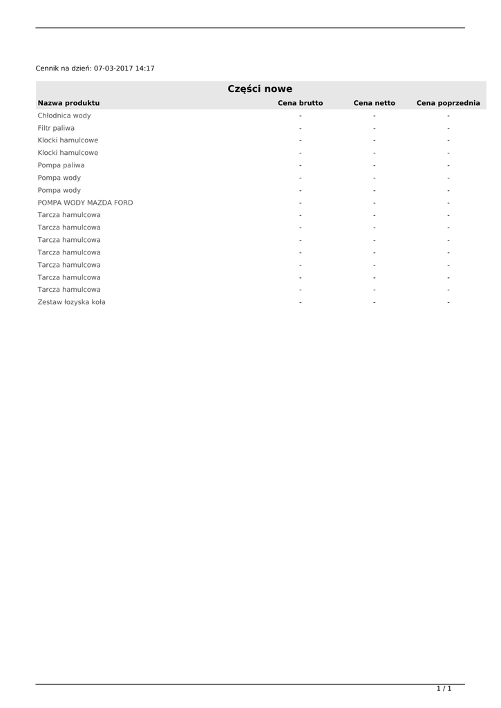 Cennik na dzień: 07-03-2017 14:17 Części nowe Nazwa produktu Cena brutto Cena netto Cena poprzednia Chłodnica wody - - - Filtr paliwa - - - Klocki hamulcowe - - - Klocki hamulcowe - - - Pompa paliwa - - - Pompa wody - - - Pompa wody - - - POMPA WODY MAZDA FORD - - - Tarcza hamulcowa - - - Tarcza hamulcowa - - - Tarcza hamulcowa - - - Tarcza hamulcowa - - - Tarcza hamulcowa - - - Tarcza hamulcowa - - - Tarcza hamulcowa - - - Zestaw łozyska koła - - - 1/1 Powered by TCPDF (www.tcpdf.org)