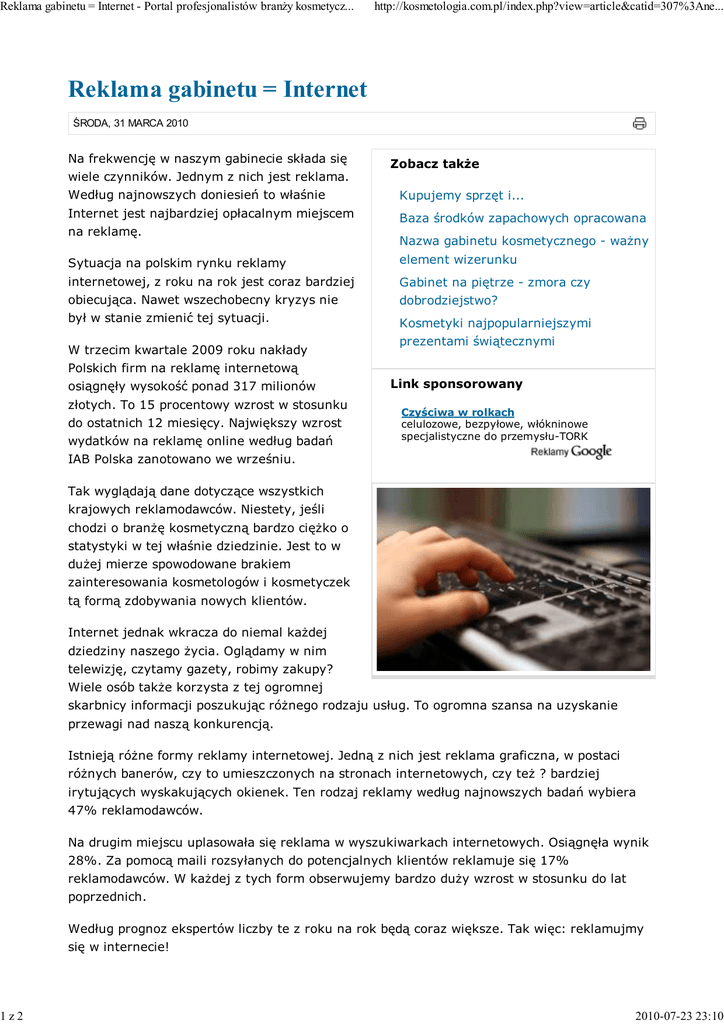 Reklama gabinetu = Internet - Portal profesjonalistów branży kosmetycz... 1z2 http://kosmetologia.com.pl/index.php?view=article&catid=307%3Ane... Reklama gabinetu = Internet ŚRODA, 31 MARCA 2010 Na frekwencję w naszym gabinecie składa się Zobacz także wiele czynników. Jednym z nich jest reklama. Według najnowszych doniesień to właśnie Kupujemy sprzęt i... Internet jest najbardziej opłacalnym miejscem Baza środków zapachowych opracowana na reklamę. Nazwa gabinetu kosmetycznego - ważny Sytuacja na polskim rynku reklamy element wizerunku internetowej, z roku na rok jest coraz bardziej Gabinet na piętrze - zmora czy obiecująca. Nawet wszechobecny kryzys nie dobrodziejstwo? był w stanie zmienić tej sytuacji. Kosmetyki najpopularniejszymi W trzecim kwartale 2009 roku nakłady prezentami świątecznymi Polskich firm na reklamę internetową osiągnęły wysokość ponad 317 milionów złotych. To 15 procentowy wzrost w stosunku do ostatnich 12 miesięcy. Największy wzrost wydatków na reklamę online według badań Link sponsorowany Czyściwa w rolkach celulozowe, bezpyłowe, włókninowe specjalistyczne do przemysłu-TORK www.amedservice.pl IAB Polska zanotowano we wrześniu. Tak wyglądają dane dotyczące wszystkich krajowych reklamodawców. Niestety, jeśli chodzi o branżę kosmetyczną bardzo ciężko o statystyki w tej właśnie dziedzinie. Jest to w dużej mierze spowodowane brakiem zainteresowania kosmetologów i kosmetyczek tą formą zdobywania nowych klientów. Internet jednak wkracza do niemal każdej dziedziny naszego życia. Oglądamy w nim telewizję, czytamy gazety, robimy zakupy? Wiele osób także korzysta z tej ogromnej skarbnicy informacji poszukując różnego rodzaju usług. To ogromna szansa na uzyskanie przewagi nad naszą konkurencją. Istnieją różne formy reklamy internetowej. Jedną z nich jest reklama graficzna, w postaci różnych banerów, czy to umieszczonych na stronach internetowych, czy też ? bardziej irytujących wyskakujących okienek. Ten rodzaj reklamy według najnowszych badań wybiera 47% reklamodawców. Na drugim miejscu uplasowała się reklama w wyszukiwarkach internetowych. Osiągnęła wynik 28%. Za pomocą maili rozsyłanych do potencjalnych klientów reklamuje się 17% reklamodawców. W każdej z tych form obserwujemy bardzo duży wzrost w stosunku do lat poprzednich. Według prognoz ekspertów liczby te z roku na rok będą coraz większe. Tak więc: reklamujmy się w internecie! 2010-07-23 23:10 Reklama gabinetu = Internet - Portal profesjonalistów branży kosmetycz... 2z2 http://kosmetologia.com.pl/index.php?view=article&catid=307%3Ane... Anna Wydra Serwis Kosmetologiczny « poprzednia następna » 2010-07-23 23:10