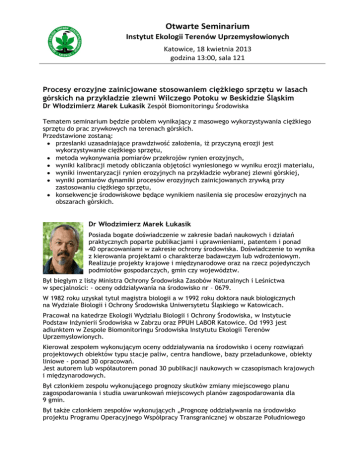 Otwarte Seminarium Instytut Ekologii Terenów Uprzemysłowionych Katowice, 18 kwietnia 2013 godzina 13:00, sala 121 Procesy erozyjne zainicjowane stosowaniem ciężkiego sprzętu w lasach górskich na przykładzie zlewni Wilczego Potoku w Beskidzie Śląskim Dr Włodzimierz Marek Łukasik Zespół Biomonitoringu Środowiska Tematem seminarium będzie problem wynikający z masowego wykorzystywania ciężkiego sprzętu do prac zrywkowych na terenach górskich. Przedstawione zostaną: przesłanki uzasadniające prawdziwość założenia, iż przyczyną erozji jest wykorzystywanie ciężkiego sprzętu, metoda wykonywania pomiarów przekrojów rynien erozyjnych, wyniki kalibracji metody obliczania objętości wyniesionego w wyniku erozji materiału, wyniki inwentaryzacji rynien erozyjnych na przykładzie wybranej zlewni górskiej, wyniki pomiarów dynamiki procesów erozyjnych zainicjowanych zrywką przy zastosowaniu ciężkiego sprzętu, konsekwencje środowiskowe będące wynikiem nasilenia się procesów erozyjnych na obszarach górskich. Dr Włodzimierz Marek Łukasik Posiada bogate doświadczenie w zakresie badań naukowych i działań praktycznych poparte publikacjami i uprawnieniami, patentem i ponad 40 opracowaniami w zakresie ochrony środowiska. Doświadczenie to wynika z kierowania projektami o charakterze badawczym lub wdrożeniowym. Realizuje projekty krajowe i międzynarodowe oraz na rzecz pojedynczych podmiotów gospodarczych, gmin czy województw. Był biegłym z listy Ministra Ochrony Środowiska Zasobów Naturalnych i Leśnictwa w specjalności: - oceny oddziaływania na środowisko nr – 0679. W 1982 roku uzyskał tytuł magistra biologii a w 1992 roku doktora nauk biologicznych na Wydziale Biologii i Ochrony Środowiska Uniwersytetu Śląskiego w Katowicach. Pracował na katedrze Ekologii Wydziału Biologii i Ochrony Środowiska, w Instytucie Podstaw Inżynierii Środowiska w Zabrzu oraz PPUH LABOR Katowice. Od 1993 jest adiunktem w Zespole Biomonitoringu Środowiska Instytutu Ekologii Terenów Uprzemysłowionych. Kierował zespołem wykonującym oceny oddziaływania na środowisko i oceny rozwiązań projektowych obiektów typu stacje paliw, centra handlowe, bazy przeładunkowe, obiekty liniowe - ponad 30 opracowań. Jest autorem lub współautorem ponad 30 publikacji naukowych w czasopismach krajowych i międzynarodowych. Był członkiem zespołu wykonującego prognozy skutków zmiany miejscowego planu zagospodarowania i studia uwarunkowań miejscowych planów zagospodarowania dla 9 gmin. Był także członkiem zespołów wykonujących „Prognozę oddziaływania na środowisko projektu Programu Operacyjnego Współpracy Transgranicznej w obszarze Południowego Otwarte Seminarium Instytut Ekologii Terenów Uprzemysłowionych Katowice, 18 kwietnia 2013 godzina 13:00, sala 121 Bałtyku” 2007 oraz Opracowanie „Uzupełnienia do Prognozy Oddziaływania na Środowisko w zakresie trzech dużych projektów, które stanowią załącznik do Regionalnego Programu Operacyjnego województwa Śląskiego na lata 2007 – 2013”. Pełni funkcję eksperta z zakresu ochrony gatunków i siedlisk w ramach projektu „Opracowanie i wdrożenie systemu informatycznego monitoringu gatunków i siedlisk przyrodniczych w ramach Ekoinfonetu” realizowanego przez ESAProjekt Sp. z o.o. 20122013. Publikacje dotyczące tematyki poruszanej na seminarium: Kubiesa P., Łukasik W.: Erosion processes caused by the use of heavy equipment in mountain areas forest. Silesia Beskid mountain case study. Beskidy 1(1)/2008 47-54. Łukasik, W.: Erosion processes caused by the use of heavy equipment in mountain areas forests. The Babia Góra massif case study - Phytopedon Vol. 7, 2/2008 186-191. e-mail: [email protected] tel. 32 254 60 31 wew. 291