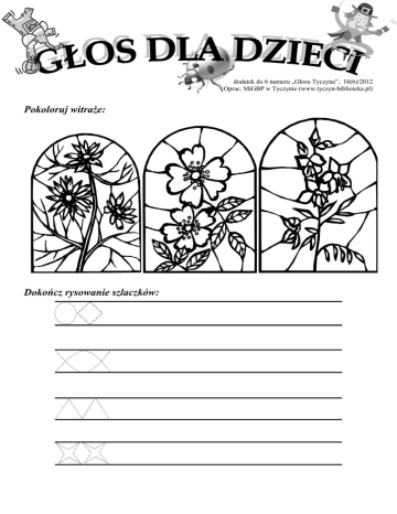 dodatek do 6 numeru „Głosu Tyczyna”, 16(6)/2012 Oprac. MiGBP w Tyczynie (www.tyczyn-biblioteka.pl) Pokoloruj witraże: Dokończ rysowanie szlaczków: Rozwiąż działania, wyniki zaś połącz z liczbami: Zaznacz na zegarze odpowiednie godziny: 9:40 12:35 18:10 Z ciągu liter wykreśl nazwy zwierząt, a z pozostałych odczytaj hasło: