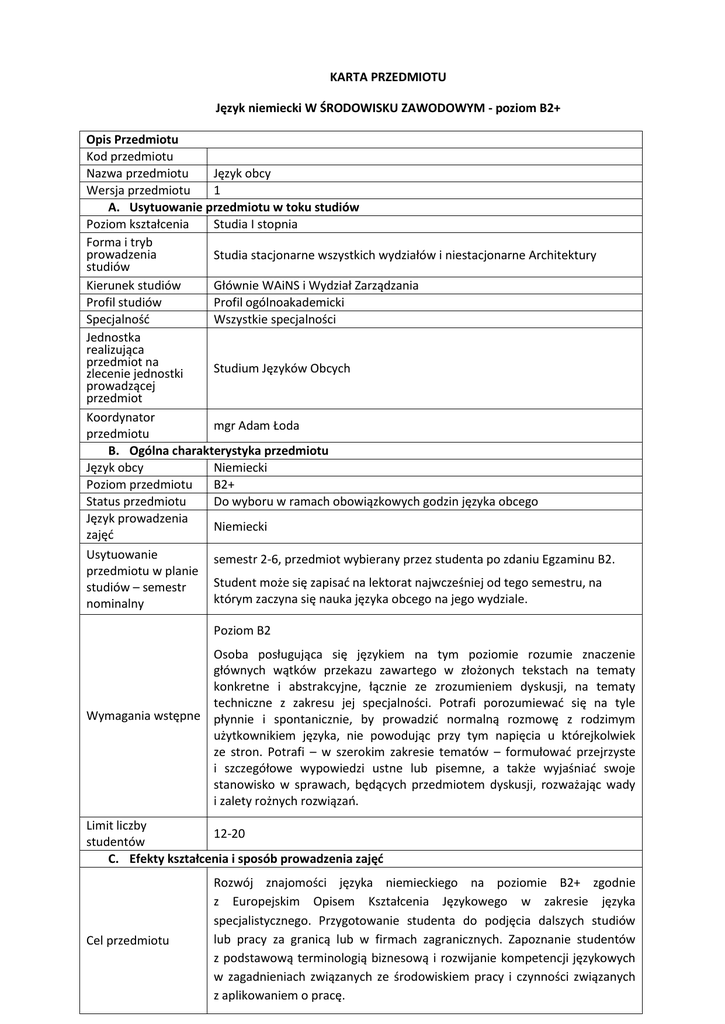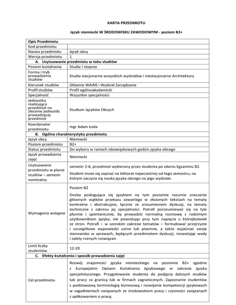 KARTA PRZEDMIOTU Język niemiecki W ŚRODOWISKU ZAWODOWYM - poziom B2+ Opis Przedmiotu Kod przedmiotu Nazwa przedmiotu Język obcy Wersja przedmiotu 1 A. Usytuowanie przedmiotu w toku studiów Poziom kształcenia Studia I stopnia Forma i tryb prowadzenia Studia stacjonarne wszystkich wydziałów i niestacjonarne Architektury studiów Kierunek studiów Głównie WAiNS i Wydział Zarządzania Profil studiów Profil ogólnoakademicki Specjalność Wszystkie specjalności Jednostka realizująca przedmiot na Studium Języków Obcych zlecenie jednostki prowadzącej przedmiot Koordynator mgr Adam Łoda przedmiotu B. Ogólna charakterystyka przedmiotu Język obcy Niemiecki Poziom przedmiotu B2+ Status przedmiotu Do wyboru w ramach obowiązkowych godzin języka obcego Język prowadzenia Niemiecki zajęć Usytuowanie semestr 2-6, przedmiot wybierany przez studenta po zdaniu Egzaminu B2. przedmiotu w planie Student może się zapisać na lektorat najwcześniej od tego semestru, na studiów – semestr którym zaczyna się nauka języka obcego na jego wydziale. nominalny Poziom B2 Osoba posługująca się językiem na tym poziomie rozumie znaczenie głównych wątków przekazu zawartego w złożonych tekstach na tematy konkretne i abstrakcyjne, łącznie ze zrozumieniem dyskusji, na tematy techniczne z zakresu jej specjalności. Potrafi porozumiewać się na tyle Wymagania wstępne płynnie i spontanicznie, by prowadzić normalną rozmowę z rodzimym użytkownikiem języka, nie powodując przy tym napięcia u którejkolwiek ze stron. Potrafi – w szerokim zakresie tematów – formułować przejrzyste i szczegółowe wypowiedzi ustne lub pisemne, a także wyjaśniać swoje stanowisko w sprawach, będących przedmiotem dyskusji, rozważając wady i zalety rożnych rozwiązań. Limit liczby 12-20 studentów C. Efekty kształcenia i sposób prowadzenia zajęć Cel przedmiotu Rozwój znajomości języka niemieckiego na poziomie B2+ zgodnie z Europejskim Opisem Kształcenia Językowego w zakresie języka specjalistycznego. Przygotowanie studenta do podjęcia dalszych studiów lub pracy za granicą lub w firmach zagranicznych. Zapoznanie studentów z podstawową terminologią biznesową i rozwijanie kompetencji językowych w zagadnieniach związanych ze środowiskiem pracy i czynności związanych z aplikowaniem o pracę. Wiedza Dysponuje odpowiednim zakresem słownictwa pozwalającego poruszać nie tylko tematy ogólne, ale również biznesowe. Zna zasady gramatyczne, pozwalające mu na formułowanie klarownych wypowiedzi, stosowanie zdań złożonych i argumentowanie. Pisanie: Potrafi prowadzić korespondencję z kontrahentami i współpracownikami w tematyce biznesu. Potrafi napisać protokół, raport, notatkę służbową i inne teksty formalne podkreślając istotne kwestie i podając odpowiednie przykłady. Efekty kształcenia Umiejętności Czytanie: Potrafi szybko określić wagę i treść wiadomości, artykułów i opracowań na rożne tematy biznesowe decydując, czy warte są dokładniejszego przeczytania. Potrafi zebrać informacje, koncepcje i opinie z wysoko wyspecjalizowanych źródeł. Mówienie: Potrafi przedstawić klarowne opisy i dokonać prezentacji dotyczącą złożonej tematyki specjalistycznej, porządkując i rozwijając poszczególne zagadnienia i podając istotne szczegóły i przykłady. Potrafi wyrażać poglądy i tworzyć argumenty. Potrafi uczestniczyć w dyskusji grupowej nawet, gdy rozmowa jest szybka i potoczna. Potrafi prowadzić rozmowę z rodzimymi użytkownikami języka, przy czym rozmówcy nie muszą zmieniać swojego naturalnego sposobu komunikowania się. Umie komunikować się spontanicznie, wykazując znaczną płynność i łatwość wyrażania się. Potrafi dokonywać wymiany skomplikowanych informacji i porad odnośnie całej gamy spraw biznesowych. Kompetencje społeczne Słuchanie: Potrafi stosować rożne strategie, prowadzące do zrozumienia tekstu, takie jak słuchanie w celu wyszukania najważniejszych informacji, korzystając ze wskazówek wynikających z treści. Potrafi zrozumieć główne treści wykładów, wystąpień i raportów oraz innych form prezentacji zawodowych, złożonych pod względem treści, leksyki i struktury. Jest świadom różnic kulturowych i wynikających z nich norm zachowania. Zna normy socjolingwistyczne (np. formy zwracania się do klientów, przełożonych) Formy zajęć dydaktycznych Ćwiczenia 30 godzin Treści kształcenia Lektorat obejmuje zagadnienia językowe niezbędne do funkcjonowania na rynku pracy, w szczególności: ▪ życiorys zawodowy – tworzenie dokumentów aplikacyjnych ▪ przebieg rozmowy kwalifikacyjnej ▪ organizacja stanowiska pracy ▪ rozmowy telefoniczne w kontekście zawodowym ▪ korespondencja listowna i mailowa w kontekście zawodowym ▪ techniki budowania prezentacji ustnych ▪ techniki opisywania diagramów i wykresów ▪ sukces i porażka – teksty popularno-naukowe Metody sprawdzania efektów →prace domowe →krótkie prace kontrolne →test zaliczeniowy →prezentacje Egzamin nie Literatura - autentyczne teksty fachowe z obcojęzycznej prasy - wybrane elementy podręczników biznesowych, - materiały własne lektora. Witryna www przedmiotu www.sjo.pw.edu.pl D. Nakład pracy studenta Liczba punktów ECTS 2 Liczba godzin pracy studenta związanych z osiągnięciem efektów kształcenia 30 godzin zajęcia + 30 godzin pracy własnej studenta (w tym przygotowanie do zajęć, przygotowanie do testu zaliczeniowego, przygotowanie prezentacji, itd.) E. Informacje dodatkowe Uwagi Wymagania do zaliczenia obecność na zajęciach (dopuszczalne 2 nieusprawiedliwione nieobecności) zaliczenie wszystkich prac kontrolnych wykonanie wszystkich prac domowych aktywne uczestnictwo w zajęciach uzyskanie pozytywnej oceny z testu zaliczeniowego (waga oceny z testu zaliczeniowego w ocenie końcowej: 40%) Data aktualizacji Aktualizacja na www.sjo.pw.edu.pl