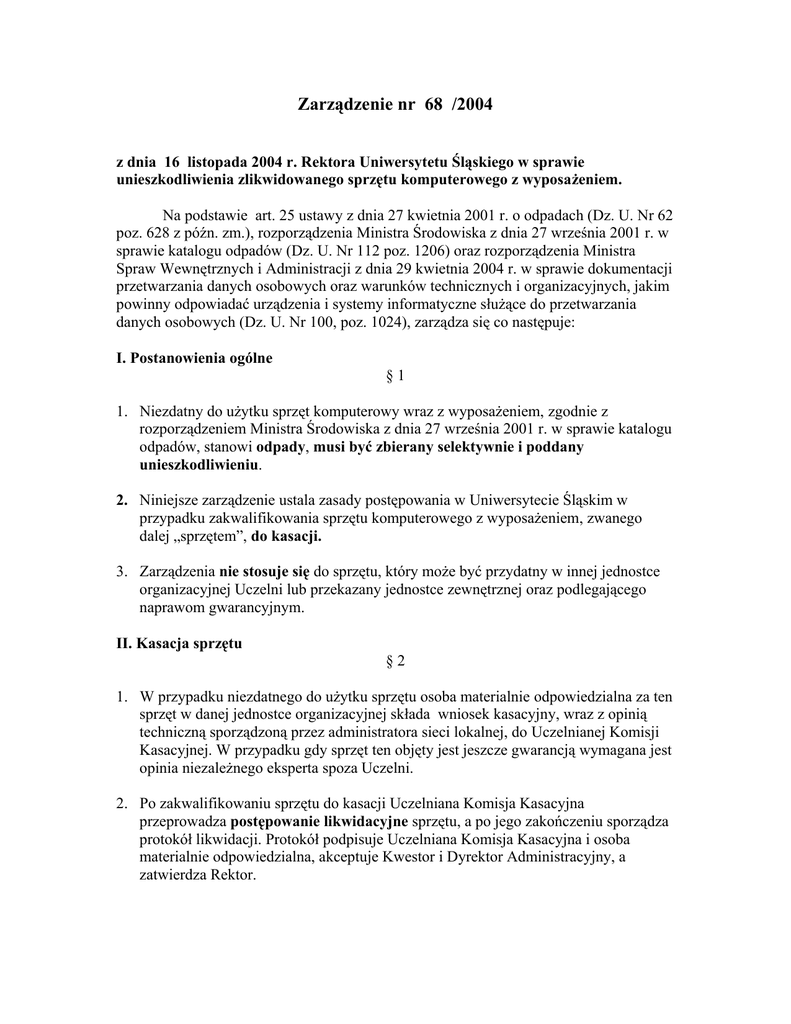Zarządzenie nr 68 /2004 z dnia 16 listopada 2004 r. Rektora Uniwersytetu Śląskiego w sprawie unieszkodliwienia zlikwidowanego sprzętu komputerowego z wyposażeniem. Na podstawie art. 25 ustawy z dnia 27 kwietnia 2001 r. o odpadach (Dz. U. Nr 62 poz. 628 z późn. zm.), rozporządzenia Ministra Środowiska z dnia 27 września 2001 r. w sprawie katalogu odpadów (Dz. U. Nr 112 poz. 1206) oraz rozporządzenia Ministra Spraw Wewnętrznych i Administracji z dnia 29 kwietnia 2004 r. w sprawie dokumentacji przetwarzania danych osobowych oraz warunków technicznych i organizacyjnych, jakim powinny odpowiadać urządzenia i systemy informatyczne służące do przetwarzania danych osobowych (Dz. U. Nr 100, poz. 1024), zarządza się co następuje: I. Postanowienia ogólne §1 1. Niezdatny do użytku sprzęt komputerowy wraz z wyposażeniem, zgodnie z rozporządzeniem Ministra Środowiska z dnia 27 września 2001 r. w sprawie katalogu odpadów, stanowi odpady, musi być zbierany selektywnie i poddany unieszkodliwieniu. 2. Niniejsze zarządzenie ustala zasady postępowania w Uniwersytecie Śląskim w przypadku zakwalifikowania sprzętu komputerowego z wyposażeniem, zwanego dalej „sprzętem”, do kasacji. 3. Zarządzenia nie stosuje się do sprzętu, który może być przydatny w innej jednostce organizacyjnej Uczelni lub przekazany jednostce zewnętrznej oraz podlegającego naprawom gwarancyjnym. II. Kasacja sprzętu §2 1. W przypadku niezdatnego do użytku sprzętu osoba materialnie odpowiedzialna za ten sprzęt w danej jednostce organizacyjnej składa wniosek kasacyjny, wraz z opinią techniczną sporządzoną przez administratora sieci lokalnej, do Uczelnianej Komisji Kasacyjnej. W przypadku gdy sprzęt ten objęty jest jeszcze gwarancją wymagana jest opinia niezależnego eksperta spoza Uczelni. 2. Po zakwalifikowaniu sprzętu do kasacji Uczelniana Komisja Kasacyjna przeprowadza postępowanie likwidacyjne sprzętu, a po jego zakończeniu sporządza protokół likwidacji. Protokół podpisuje Uczelniana Komisja Kasacyjna i osoba materialnie odpowiedzialna, akceptuje Kwestor i Dyrektor Administracyjny, a zatwierdza Rektor. 3. Osoba materialnie odpowiedzialna za sprzęt sporządza i podpisuje dowód likwidacji, który przekazuje do podpisania Uczelnianej Komisji Kasacyjnej i Dyrektorowi Administracyjnemu. 4. Po sporządzeniu dowodu likwidacji sprzętu i przy zachowaniu zasad opisanych w niniejszym zarządzeniu sprzęt przekazany zostaje do unieszkodliwienia. III. Likwidacja nośników informacji §3 1. Po zakwalifikowaniu do likwidacji sprzętu przez Uczelnianą Komisję Kasacyjną urządzenia, dyski lub inne elektroniczne nośniki informacji zawierające dane osobowe oraz informacje niejawne przejmowane są, w obecności lokalnego administratora bezpieczeństwa informacji oraz osoby materialnie odpowiedzialnej za sprzęt lub użytkownika sprzętu, przez Uczelnianą Komisję Kasacyjną, która sporządza protokół z tych czynności, wzór którego stanowi załącznik nr 1 do niniejszego zarządzenia. 2. Przejęte urządzenia, dyski lub inne elektroniczne nośniki informacji zawierające dane osobowe oraz informacje niejawne, o których mowa w ust. 1, składowane są i zamykane w zabezpieczonym pomieszczeniu skarbca Uniwersytetu Śląskiego. 3. Zespół, w skład którego wchodzą: Przewodniczący Uczelnianej Komisji Kasacyjnej, pracownik Działu Spraw Obronnych i Ochrony oraz Główny Specjalista ds. Gospodarki Substancjami Chemicznymi w Inspektoracie BHP i OP 15 dnia każdego miesiąca dokonuje mechanicznego zniszczenia zgromadzonych urządzeń, dysków lub innych elektronicznych nośników informacji i z czynności tej sporządza protokół, którego wzór stanowi załącznik nr 2 do niniejszego zarządzenia. Czynność niszczenia dokonywana jest w wyznaczonym pomieszczeniu Instytutu Nauki o Materiałach Wydziału Informatyki i Nauki o Materiałach. 4. W przypadku gdy nie zostanie zebrana odpowiednia ilości urządzeń, dysków lub innych elektronicznych nośników informacji, czynność mechanicznego ich zniszczenia nie jest dokonywana, jednak stosowana adnotacja musi zostać sporządzona przez Zespół i umieszczona na protokole, o którym mowa w ust. 3. §4 1. Na podstawie protokołu, o którym mowa w § 3 ust. 3 Główny Specjalista ds. Gospodarki Substancjami Chemicznymi w Inspektoracie BHP i OP, organizuje odbiór zniszczonych urządzeń, dysków lub innych elektronicznych nośników informacji przez firmę dokonującą ich unieszkodliwienia, z którą Uniwersytet Śląski zawarł stosowną umowę. 2 2. Ewidencję unieszkodliwienia urządzeń, dysków lub innych elektronicznych nośników informacji prowadzi Główny Specjalista ds. Gospodarki Substancjami Chemicznymi w Inspektoracie BHP i OP. IV. Unieszkodliwienie sprzętu §5 1. Po wykonaniu czynności, o których mowa w § 3 ust. ust. 1 i 2 działy / sekcje administracyjno – gospodarcze wydziału / jednostki, na podstawie protokołu likwidacji i dowodu likwidacji przejmują pozbawiony urządzeń, dysków lub innych elektronicznych nośników informacji sprzęt od osób materialnie odpowiedzialnych. 2. Zlikwidowany sprzęt magazynowany jest w działach / sekcjach administracyjno – gospodarczych do czasu jego odbioru przez firmę dokonującą jego unieszkodliwienia, z którą Uniwersytet Śląski zawarł stosowną umowę. 3. Informację o ilości sprzętu przeznaczonego do unieszkodliwienia oraz jednostkach, w których jest magazynowany, Uczelniana Komisja Kasacyjna przekazuje do Głównego Specjalisty ds. Gospodarki Substancjami Chemicznymi w Inspektoracie BHP i OP, który organizuje w Uczelni zgodne z zasadami ochrony środowiska unieszkodliwianie odpadów. 4. Odbiór zlikwidowanego sprzętu przez firmę dokonującą jego unieszkodliwienia odbywa się w obecności Głównego Specjalisty ds. Gospodarki Substancjami Chemicznymi w Inspektoracie BHP i OP, który zobowiązany jest również do powiadomienia działów / sekcji ad