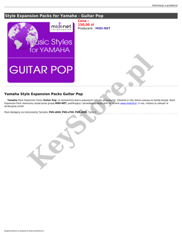 Informacje o produkcie Style Expansion Packs for Yamaha - Guitar Pop Cena : 150,00 zł or e. pl Producent : MIDI-NET Yamaha Style Expansion Packs Guitar Pop Yamaha Style Expansion Packs Guitar Pop, to zestawienie pięciu popowych rytmów gitarowych! Zawarte w niej utwory pasują na każdą okazję. Style Expansion Pack stworzony został przez grupę MIDI-NET, publikującą i sprzedającą swoje pliki na stronie www.midi24.pl. U nas, możesz je zakupić w atrakcyjnej cenie! K ey St Pack dostępny na instrumenty Yamaha: PSR-s650, PSR-s750, PSR-s950, Tyros 5 Wygenerowano w programie www.oscGold.com