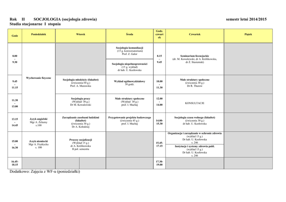 Rok II SOCJOLOGIA (socjologia zdrowia) Studia stacjonarne I stopnia Godz Poniedziałek Wtorek Socjologia niepełnosprawności (15 g. wykład) dr hab. U. Kozłowska Wychowanie fizyczne 9.45 11.15 11.30 13.00 15.00 16.30 Środa Socjologia komunikacji (15 g. konwersatorium) Prof. Z. Galor 8.00 9.30 13.15 14.45 semestr letni 2014/2015 Język angielski Mgr A. Żelazny s.100 Jezyk niemiecki Mgr A. Frydrycka s. 100 Godz. czwart ek Czwartek 8.15 – 9.45 Seminarium licencjackie (dr. M. Kowalewski, dr A. Królikowska, dr Ż. Stasieniuk) Socjologia młodzieży (fakultet) (ćwiczenia/30 g.) Prof. A. Murawska Wykład ogólnowydziałowy 30 godz. 10.00 11.30 Socjologia pracy (Wykład/ 30 g.) Dr M. Kowalewski Małe struktury społeczne (Wykład 30 g.) prof. I. Machaj 12.00 14.00 Zarządzanie zasobami ludzkimi (fakultet) (ćwiczenia 30 g.) Dr A. Kołodziej Przygotowanie projektu badawczego (ćwiczenia 45 g.) prof. I. Machaj 14.0015.30 Procesy socjalizacji (Wykład 15 g.) dr A. Królikowska II poł. semestru 16.4518.15 Dodatkowo: Zajęcia z WF-u (poniedziałki) 15.4517.15 17.3019.00 Małe struktury społeczne (ćwiczenia 30 g.) Dr R. Thurow KONSULTACJE Socjologia czasu wolnego (fakultet) (ćwiczenia 30 g.) dr hab. U. Kozłowska Organizacja i zarządzanie w ochronie zdrowia (wykład 15 g.) Dr hab. U. Kozłowska s. 246 Instytucje i systemy zdrowia publ. (wykład 15 g.) Dr hab. U. Kozłowska s. 246 Piątek