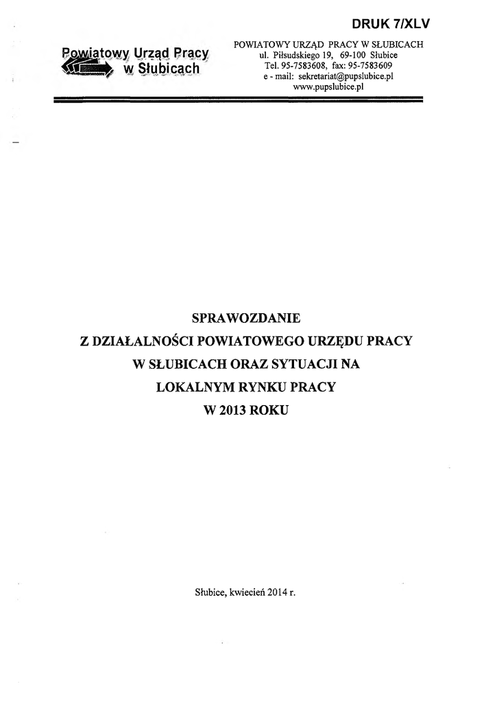 DRUK 7/XLV g.oMatowv l| n iś w Słubicach, POWIATOWY URZĄD PRACY W SŁUBICACH ul. Piłsudskiego 19, 69-100 Słubice Tel. 95-7583608, fax: 95-7583609 e - mail: [email protected] www.pupslubice.pl SPRAWOZDANIE Z DZIAŁALNOŚCI POWIATOWEGO URZĘDU PRACY W SŁUBICACH ORAZ SYTUACJI NA LOKALNYM RYNKU PRACY W 2013 ROKU Słubice, kwiecień 2014 r. Spis treści: Wstęp................................................................................................................................................ 5 Działalność Powiatowego Urzędu Pracy...................................................................................... 6 1. Sprawy pracownicze...................................................................................................... 6 2. Kontrola zewnętrzna...................................................................................................... 7 3. Kontrola wewnętrzna..................................................................................................... 7 4. Realizacja planu finansowego przeznaczonego na administrowanie urzędu ze środków budżetu powiatu......................................................................................... 8 5. Składka zdrowotna za bezrobotnych bez prawa do zasiłku........................................8 6. W spółpraca z Powiatową Radą Zatrudnienia.............................................................. 9 Sytuacja na lokalnym rynku pracy.................................................................................................9 1. Poziom i stopa bezrobocia................................................................................................ 9 Struktura bezrobocia.....................................................................................................................11 1. Bezrobotni będący w szczególnej sytuacji na rynku pracy.......................................11 2. Wybrane grupy bezrobotnych..................................................................................... 12 3. Rejestracja i obsługa osób bezrobotnych................................................................... 14 Usługi rynku pracy........................................................................................................................16 1. Pośrednictwo pracy...................................................................................................... 16 1.1. Działalność Pośrednictwa Pracy związana z Kostrzyńsko-Słubicką Specjalną Strefą Ekonomiczną........................................................................18 1.2. Współpraca partnerska na rzecz rozwoju i upowszechniania form aktywnej integracji oraz pracy socjalnej.........................................................................19 1.3. Zwolnienia grupowe........................................................................................ 20 1.4. Działalność Europej skich Służb Zatrudnienia (EURES)............................. 20 2. Poradnictwo zawodowe............................................................................................... 21 3. Pomoc w aktywnym poszukiwaniu pracy.................................................................. 24 4. Organizacja szkoleń..................................................................................................... 26 Instrumenty rynku pracy.............................................................................................................. 28 1. 2. 3. 4. Roboty publiczne..........................................................................................................28 Prace społecznie użyteczne......................................................................................... 29 Prace interwencyjne..................................................................................................... 30 Refundacja kosztów wyposażenia lub doposażenia stanowiska pracy dla skierowanej osoby bezrobotnej................................................................................... 31 5. Dofinansowanie podjęcia działalności gospodarczej................................................ 32 2 6. S taż............................................................................................................................... 34 7. Przygotowanie zawodowe dorosłych......................................................................... 36 8. Refundacja poniesionych kosztów przejazdu i opieki nad dzieckiem.....................36 9. Stypendium z tytułu podjęcia dalszej nauki...............................................................37 10. Studia podyplomowe....................................................................................................37 11. Koszty egzaminów....................................................................................................... 37 12. Refundacja składek na ubezpieczenie społeczne....................................................... 38 Rehabilitacja zawodowa osób posiadaj ących orzeczony stopień niepełnosprawności w ramach środków Państwowego Funduszu Rehabilitacji Osób Niepełnosprawnych............................. 38 Programy realizowane przez Powiatowy Urząd Pracy..............................................................39 1. Środki Funduszu Pracy przyznane Algorytmem...................................................... 40 2. Programy Europej skiego Funduszu Społecznego......................................................41 3. Programy finansowane z rezerwy Funduszu Pracy...................................................43 4. Efektywność podjętych działań...................................................................................48 Współpraca z partnerami rynku pracy........................................................................................ 50 1. Współpraca międzynarodowa i partnerstwo lokalne.................................................50 Finansowanie inn