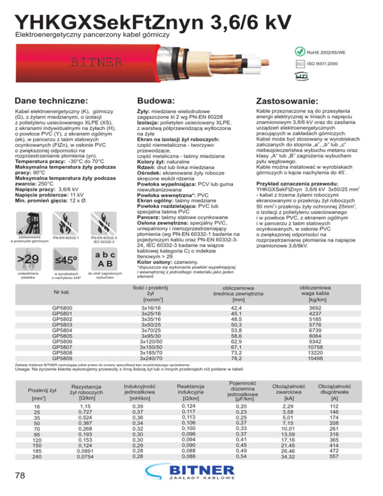 YHKGXSekFtZnyn 3,6/6 kV Elektroenergetyczny pancerzony kabel górniczy RoHS RoHS 2002/95/WE ISO ISO 9001:2000 Dane techniczne: Budowa: Zastosowanie: Kabel elektroenergetyczny (K), górniczy (G), z żyłami miedzianymi, o izolacji z polietylenu usieciowanego XLPE (XS), z ekranami indywidualnymi na żyłach (H), o powłoce PVC (Y), z ekranem ogólnym (ek), w pancerzu z taśm stalowych ocynkowanych (FtZn), w osłonie PVC o zwiększonej odporności na rozprzestrzenianie płomienia (yn). Temperatura pracy: -30°C do 70°C Maksymalna temperatura żyły podczas pracy: 90°C Maksymalna temperatura żyły podczas zwarcia: 250°C Napięcie pracy: 3,6/6 kV Napięcie probiercze: 11 kV Min. promień gięcia: 12 x Ø. Żyły: miedziane wielodrutowe zagęszczone kl 2 wg PN-EN 60228 Izolacja: polietylen usieciowany XLPE, z warstwą półprzewodzącą wytłoczona na żyle Ekran na izolacji żył roboczych: część niemetaliczna - tworzywo przewodzące, część metaliczna - taśmy miedziane Kolory żył: naturalne Rdzeń: drut lub linka miedziana Ośrodek: ekranowane żyły robocze skręcone wokół rdzenia Powłoka wypełniająca: PCV lub guma niewulkanizowana Powłoka wewnętrzna*: PVC Ekran ogólny: taśmy miedziane Powłoka rozdzielająca: PVC lub specjalna taśma PVC Pancerz: taśmy stalowe ocynkowane Osłona zewnętrzna: specjalny PVC, uniepalniony i nierozprzestrzeniający płomienia (wg PN-EN 60332-1 badanie na pojedynczym kablu oraz PN-EN 60332-324, IEC 60332-3 badanie na wiązce kablowej kategoria C) o indeksie tlenowym > 29 Kolor osłony: czerwony. Kable przeznaczone są do przesyłania energii elektrycznej w liniach o napięciu znamionowym 3,6/6 kV oraz do zasilania urządzeń elektroenergetycznych pracujących w zakładach górniczych. Kabel może być stosowany w wyrobiskach zaliczanych do stopnia „a”, „b” lub „c” niebezpieczeństwa wybuchu metanu oraz klasy „A” lub „B” zagrożenia wybuchem pyłu węglowego. Kable można instalować w wyrobiskach górniczych o kącie nachylenia do 45˚. zastosowanie w przemyśle górniczym PN-EN 60332-1 PN-EN 60332-3 IEC 60332-3 >29 ≤45º abc AB uniepalniona powłoka w wyrobiskach o nachyleniu ≤45º do stref zagrożonych wybuchem Przykład oznaczenia przewodu: YHKGXSekFtZnyn 3,6/6 kV 3x50/25 mm2 - kabel z trzema żyłami roboczymi ekranowanymi o przekroju żył roboczych 2 2 50 mm i przekroju żyły ochronnej 25mm , o izolacji z polietylenu usieciowanego i w powłoce PVC, z ekranem ogólnym i w pancerzu z taśm stalowych ocynkowanych, w osłonie PVC o zwiększonej odporności na rozprzestrzenianie płomienia na napięcie znamionowe 3,6/6kV. *dopuszcza się wykonanie powłoki wypełniającej i wewnętrznej z jednolitego materiału jako jeden element Nr kat. Ilość i przekrój żył [nxmm2] GP5800 GP5801 GP5802 GP5803 GP5804 GP5805 GP5806 GP5807 GP5808 GP5809 3x16/16 3x25/16 3x35/16 3x50/25 3x70/25 3x95/30 3x120/50 3x150/50 3x185/70 3x240/70 obliczeniowa waga kabla [kg/km] obliczeniowa średnica zewnętrzna [mm] 42,4 45,1 48,5 50,3 53,8 58,6 62,9 67,1 73,2 78,2 3692 4237 5185 5776 6739 8064 9342 10758 13220 15498 Zakłady Kablowe BITNER zastrzegają sobie prawo do zmiany specyfikacji bez wcześniejszego uprzedzenia Uwaga: Na życzenie klienta wykonujemy przewody z inną ilością żył lub o innych przekrojach niż podane w tabeli Przekrój żył 2 [mm ] 16 25 35 50 70 95 120 150 185 240 78 Rezystancja żył roboczych [Ω/km] 1,15 0,727 0,524 0,387 0,268 0,193 0,153 0,124 0,0991 0,0754 Indukcyjność jednostkowa [mH/km] 0,39 0,37 0,36 0,34 0,32 0,30 0,30 0,29 0,28 0,28 Reaktancja indukcyjna [Ω/km] 0,124 0,117 0,113 0,106 0,100 0,096 0,094 0,090 0,088 0,086 Pojemność doziemna jednostkowa [µF/km] 0,20 0,23 0,25 0,27 0,33 0,37 0,41 0,45 0,49 0,54 Obciążalność zwarciowa [kA] Obciążalność długotrwała [A] 2,29 3,58 5,01 7,15 10,01 13,59 17,16 21,45 26,46 34,32 112 146 174 208 261 316 365 414 472 557