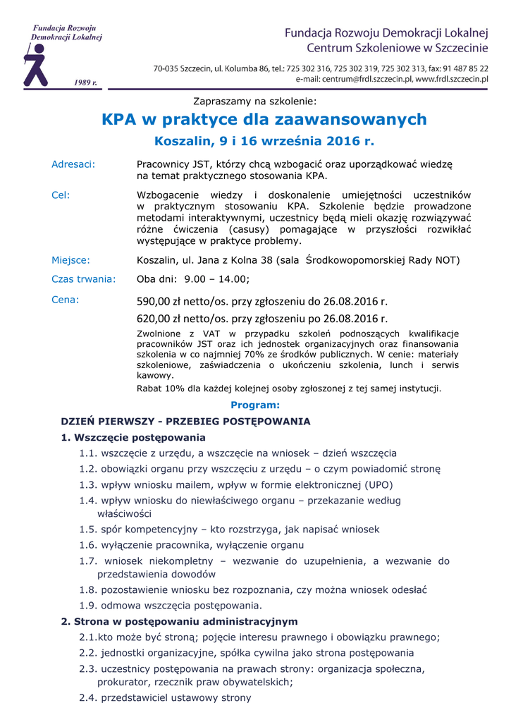 Zapraszamy na szkolenie: KPA w praktyce dla zaawansowanych Koszalin, 9 i 16 września 2016 r. Adresaci: Pracownicy JST, którzy chcą wzbogacić oraz uporządkować wiedzę na temat praktycznego stosowania KPA. Cel: Wzbogacenie wiedzy i doskonalenie umiejętności uczestników w praktycznym stosowaniu KPA. Szkolenie będzie prowadzone metodami interaktywnymi, uczestnicy będą mieli okazję rozwiązywać różne ćwiczenia (casusy) pomagające w przyszłości rozwikłać występujące w praktyce problemy. Miejsce: Koszalin, ul. Jana z Kolna 38 (sala Środkowopomorskiej Rady NOT) Czas trwania: Oba dni: 9.00 – 14.00; Cena: 590,00 zł netto/os. przy zgłoszeniu do 26.08.2016 r. 620,00 zł netto/os. przy zgłoszeniu po 26.08.2016 r. Zwolnione z VAT w przypadku szkoleń podnoszących kwalifikacje pracowników JST oraz ich jednostek organizacyjnych oraz finansowania szkolenia w co najmniej 70% ze środków publicznych. W cenie: materiały szkoleniowe, zaświadczenia o ukończeniu szkolenia, lunch i serwis kawowy. Rabat 10% dla każdej kolejnej osoby zgłoszonej z tej samej instytucji . Program: DZIEŃ PIERWSZY - PRZEBIEG POSTĘPOWANIA 1. Wszczęcie postępowania 1.1. wszczęcie z urzędu, a wszczęcie na wniosek – dzień wszczęcia 1.2. obowiązki organu przy wszczęciu z urzędu – o czym powiadomić stronę 1.3. wpływ wniosku mailem, wpływ w formie elektronicznej (UPO) 1.4. wpływ wniosku do niewłaściwego organu – przekazanie według właściwości 1.5. spór kompetencyjny – kto rozstrzyga, jak napisać wniosek 1.6. wyłączenie pracownika, wyłączenie organu 1.7. wniosek niekompletny – wezwanie do uzupełnienia, a wezwanie do przedstawienia dowodów 1.8. pozostawienie wniosku bez rozpoznania, czy można wniosek odesłać 1.9. odmowa wszczęcia postępowania. 2. Strona w postępowaniu administracyjnym 2.1.kto może być stroną; pojęcie interesu prawnego i obowiązku prawnego; 2.2. jednostki organizacyjne, spółka cywilna jako strona postępowania 2.3. uczestnicy postępowania na prawach strony: organizacja społeczna, prokurator, rzecznik praw obywatelskich; 2.4. przedstawiciel ustawowy strony 2.5. pełnomocnik: kto może być pełnomocnikiem, zapisy w pełnomocnictwie, opłata skarbowa. 2.6 prawa strony w postępowaniu administracyjnym 3. Załatwianie spraw: terminy, doręczenia, wezwania 3.1. terminy zawite, a terminy instrukcyjne; jak je odróżnić 3.2. jak liczyć terminy; 3.3. terminy załatwiania spraw: przekroczenia terminu, okresy niewliczane do terminów załatwienia sprawy, obowiązki organu w przypadku niezałatwienia sprawy w terminie, 3.4. bezczynność a przewlekłość postępowania; zażalenie na bezczynność/przewlekłość 3.5.doręczenia w postępowaniu administracyjnym; 3.6. szczególne sposoby doręczeń, fikcja doręczenia; doręczenia osobom mieszkającym za granicą 3.7. doręczenia elektroniczne; 3.8. wezwania. 4. Dowody w postępowaniu administracyjnym, akta sprawy 4.1. środki dowodowe w postępowaniu administracyjnym 4.2. uprawnienia strony w postępowaniu dowodowym; 4.3. dokument urzędowy, a dokument prywatny 4.4. kopie dokumentów; dokumenty z innych postępowań 4.5. składanie dokumentów w formie elektronicznej; 4.6. sporządzanie protokołu, protokół a adnotacja; 4.7. akta sprawy – co powinno być włączone do akt, 4.7. udostępnianie akt; regulacje k.p.a. a ustawa o dostępie do informacji publicznej; 4.8. metryka sprawy. 5. Rozprawa w postępowaniu administracyjnym 5.1. kiedy można, a kiedy trzeba przeprowadzić rozprawę; 5.2. przygotowanie rozprawy; 5.3. przebieg rozprawy i uprawnienia jej uczestników. DZIEŃ DRUGI – ROZSTRZYGNIĘCIA I POSTĘPOWANIA NADZWYCZAJNE 6. Postanowienie o zawieszeniu postępowania. Umorzenie postępowania. 6.1. obligatoryjne i fakultatywne zawieszenie postępowania; 6.2. zagadnienie wstępne; 6.3. podjęcie postępowania; umorzenie w wyniku braku wniosku o podjęcie; 6.4. postanowienia dotyczące zawieszenia, zaskarżalne i niezaskarżalne 6.5. obligatoryjne i fakultatywne umorzenie postępowania; 6.6. forma umorzenia postępowania; 6.7. umorzenie postępowania a decyzja negatywna. 7. Decyzje i postanowienia 7.1. czynności organu przed wydaniem decyzji; 7.2. elementy decyzji; 7.3 uzasadnienie decyzji; kiedy można odstąpić od uzasadnienia 7.4. wykonalność decyzji 7.5. kiedy decyzja staje się ostateczna, a kiedy jest prawomocna; 7.6. „korekty” decyzji: sprostowanie, uzupełnienie, wykładnia; 7.7. decyzja w formie elektronicznej 7.8. postanowienia w postępowaniu administracyjnym – zaskarżalne, niezaskarżalne. 8. Postępowanie przed organem II instancji i przed WSA 8.1.środki zaskarżenia: odwołanie, zażalenie; 8.2.dopuszczalność wniesienia odwołania: zasada dwuinstancyjności postępowania; 8.3.procedura samokontroli rozstrzygnięcia administracyjnego; 8.4. możliwości wzruszenia decyzji organu II instancji; 8.5. wpływ postępowania przed wojewódzkim sądem administracyjnym na postępowanie I instancji 9. Wznowienie postępowania 9.1. przesłanki wznowienia postępowania 9.2. wznowienie w związku z nowymi okolicznościami 9.3. wznowienie, kiedy strona nie brała udziału w postępowaniu 9.4. wznowienie po wyroku Trybunału Konstytucyjnego 9.5. wniosek o wznowienie – gdzie powinien być skierowany 9.6. badanie wniosku o wznowienie w I etapie 9.7. możliwe rozstrzygnięcia w I etapie 9.8. badanie przesłanek wznowienia w II etapie 9.9. możliwe rozstrzygnięcia w postępowaniu wznowieniowym 10. Inne możliwości wzruszenia decyzji ostatecznej 10. 1 zmiana na podstawie art. 154,155 k.p.a. 10.2. stwierdzenie nieważności decyzji – przesłanki, możliwe konsekwencje 10.3. wygaśnięcie decyzji 11. Postępowania odrębne 11. 1. zaświadczenia, 11.2. skargi i wnioski – tryb rozpoznawania, możliwe rozstrzygnięcia 11.3. k.p.a. w petycjach 12. Odpowiedzialność urzędnika za wydaną decyzję 12.1. przesłanki odpowiedzialności urzędnika zgodnie z ustawą o odpowiedzialnoś