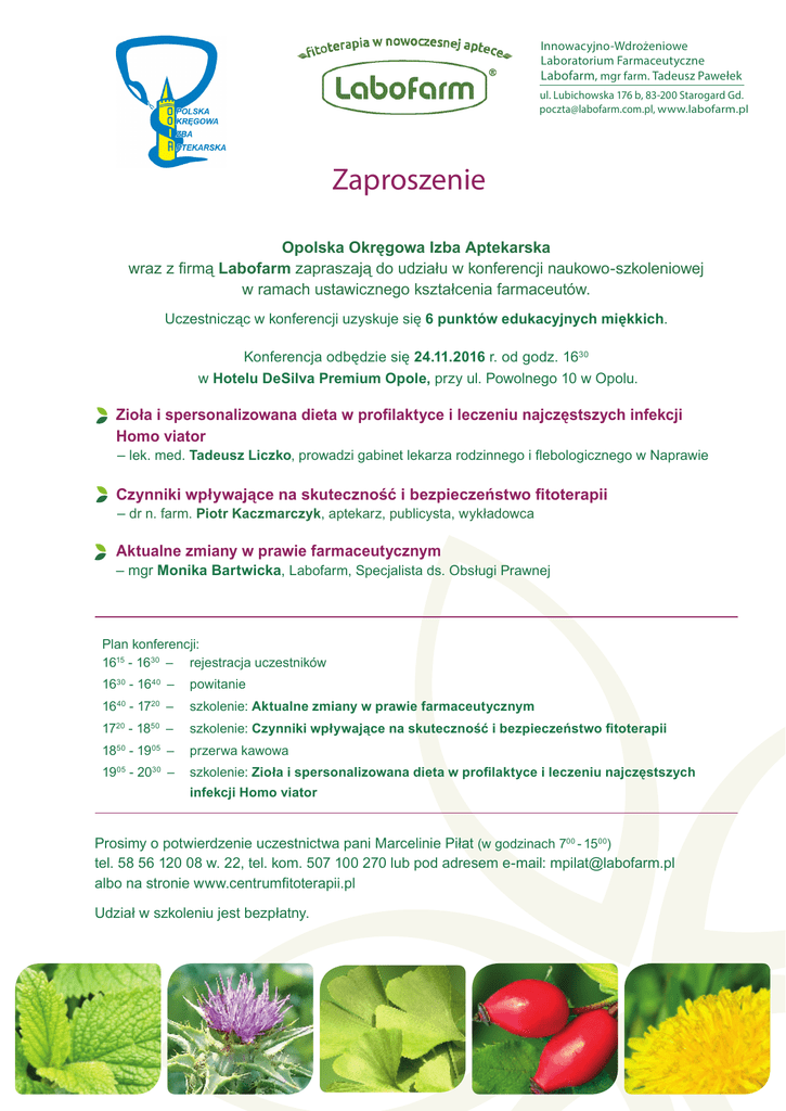 Innowacyjno-Wdrożeniowe Laboratorium Farmaceutyczne Labofarm, mgr farm. Tadeusz Pawełek ul. Lubichowska 176 b, 83-200 Starogard Gd. [email protected], www.labofarm.pl Zaproszenie Opolska Okręgowa Izba Aptekarska wraz z firmą Labofarm zapraszają do udziału w konferencji naukowo-szkoleniowej w ramach ustawicznego kształcenia farmaceutów. Uczestnicząc w konferencji uzyskuje się 6 punktów edukacyjnych miękkich. Konferencja odbędzie się 24.11.2016 r. od godz. 1630 w Hotelu DeSilva Premium Opole, przy ul. Powolnego 10 w Opolu. Zioła i spersonalizowana dieta w profilaktyce i leczeniu najczęstszych infekcji Homo viator – lek. med. Tadeusz Liczko, prowadzi gabinet lekarza rodzinnego i flebologicznego w Naprawie Czynniki wpływające na skuteczność i bezpieczeństwo fitoterapii – dr n. farm. Piotr Kaczmarczyk, aptekarz, publicysta, wykładowca Aktualne zmiany w prawie farmaceutycznym – mgr Monika Bartwicka, Labofarm, Specjalista ds. Obsługi Prawnej Plan konferencji: 1615 - 1630 – rejestracja uczestników 1630 - 1640 – powitanie 1640 - 1720 – szkolenie: Aktualne zmiany w prawie farmaceutycznym 1720 - 1850 – szkolenie: Czynniki wpływające na skuteczność i bezpieczeństwo fitoterapii 1850 - 1905 – przerwa kawowa 1905 - 2030 – szkolenie: Zioła i spersonalizowana dieta w profilaktyce i leczeniu najczęstszych infekcji Homo viator Prosimy o potwierdzenie uczestnictwa pani Marcelinie Piłat (w godzinach 700 - 1500) tel. 58 56 120 08 w. 22, tel. kom. 507 100 270 lub pod adresem e-mail: [email protected] albo na stronie www.centrumfitoterapii.pl Udział w szkoleniu jest bezpłatny.