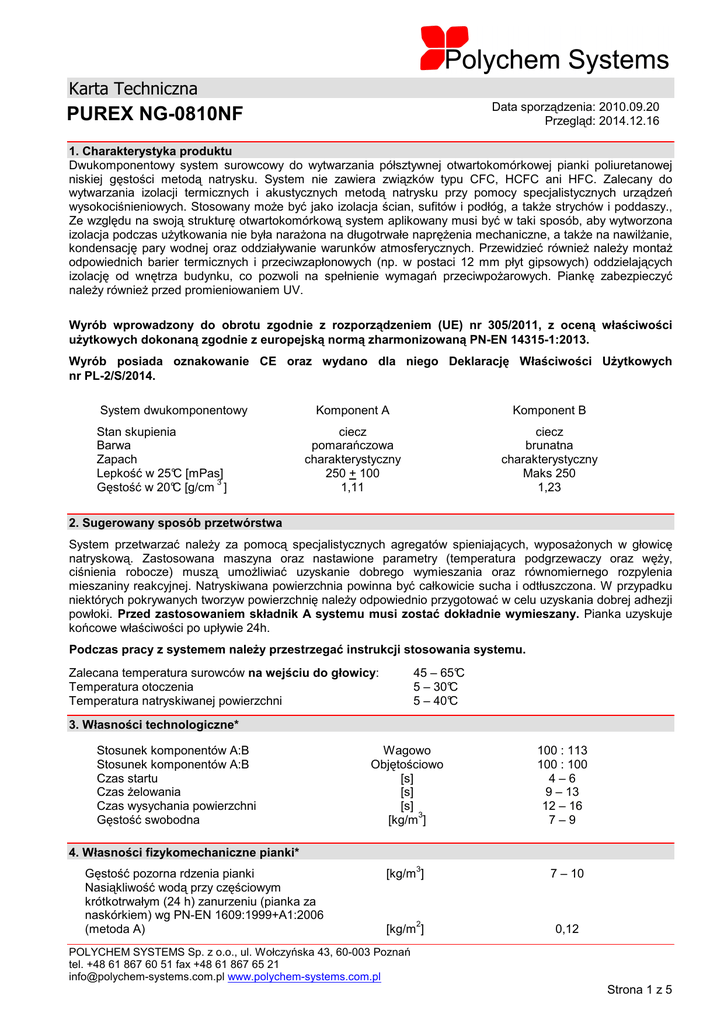 Karta Techniczna Data sporządzenia: 2010.09.20 Przegląd: 2014.12.16 PUREX NG-0810NF 1. Charakterystyka produktu Dwukomponentowy system surowcowy do wytwarzania półsztywnej otwartokomórkowej pianki poliuretanowej niskiej gęstości metodą natrysku. System nie zawiera związków typu CFC, HCFC ani HFC. Zalecany do wytwarzania izolacji termicznych i akustycznych metodą natrysku przy pomocy specjalistycznych urządzeń wysokociśnieniowych. Stosowany moŜe być jako izolacja ścian, sufitów i podłóg, a takŜe strychów i poddaszy., Ze względu na swoją strukturę otwartokomórkową system aplikowany musi być w taki sposób, aby wytworzona izolacja podczas uŜytkowania nie była naraŜona na długotrwałe napręŜenia mechaniczne, a takŜe na nawilŜanie, kondensację pary wodnej oraz oddziaływanie warunków atmosferycznych. Przewidzieć równieŜ naleŜy montaŜ odpowiednich barier termicznych i przeciwzapłonowych (np. w postaci 12 mm płyt gipsowych) oddzielających izolację od wnętrza budynku, co pozwoli na spełnienie wymagań przeciwpoŜarowych. Piankę zabezpieczyć naleŜy równieŜ przed promieniowaniem UV. Wyrób wprowadzony do obrotu zgodnie z rozporządzeniem (UE) nr 305/2011, z oceną właściwości uŜytkowych dokonaną zgodnie z europejską normą zharmonizowaną PN-EN 14315-1:2013. Wyrób posiada oznakowanie CE oraz wydano dla niego Deklarację Właściwości UŜytkowych nr PL-2/S/2014. System dwukomponentowy Stan skupienia Barwa Zapach Lepkość w 25°C [mPas] 3 Gęstość w 20°C [g/cm ] Komponent A Komponent B ciecz pomarańczowa charakterystyczny 250 + 100 1,11 ciecz brunatna charakterystyczny Maks 250 1,23 2. Sugerowany sposób przetwórstwa System przetwarzać naleŜy za pomocą specjalistycznych agregatów spieniających, wyposaŜonych w głowicę natryskową. Zastosowana maszyna oraz nastawione parametry (temperatura podgrzewaczy oraz węŜy, ciśnienia robocze) muszą umoŜliwiać uzyskanie dobrego wymieszania oraz równomiernego rozpylenia mieszaniny reakcyjnej. Natryskiwana powierzchnia powinna być całkowicie sucha i odtłuszczona. W przypadku niektórych pokrywanych tworzyw powierzchnię naleŜy odpowiednio przygotować w celu uzyskania dobrej adhezji powłoki. Przed zastosowaniem składnik A systemu musi zostać dokładnie wymieszany. Pianka uzyskuje końcowe właściwości po upływie 24h. Podczas pracy z systemem naleŜy przestrzegać instrukcji stosowania systemu. Zalecana temperatura surowców na wejściu do głowicy: Temperatura otoczenia Temperatura natryskiwanej powierzchni 45 – 65°C 5 – 30°C 5 – 40°C 3. Własności technologiczne* Stosunek komponentów A:B Stosunek komponentów A:B Czas startu Czas Ŝelowania Czas wysychania powierzchni Gęstość swobodna Wagowo Objętościowo [s] [s] [s] 3 [kg/m ] 100 : 113 100 : 100 4–6 9 – 13 12 – 16 7–9 4. Własności fizykomechaniczne pianki* Gęstość pozorna rdzenia pianki Nasiąkliwość wodą przy częściowym krótkotrwałym (24 h) zanurzeniu (pianka za naskórkiem) wg PN-EN 1609:1999+A1:2006 (metoda A) 3 7 – 10 2 0,12 [kg/m ] [kg/m ] POLYCHEM SYSTEMS Sp. z o.o., ul. Wołczyńska 43, 60-003 Poznań tel. +48 61 867 60 51 fax +48 61 867 65 21 [email protected] www.polychem-systems.com.pl Strona 1 z 5 Karta Techniczna Nasiąkliwość wodą przy częściowym krótkotrwałym (24 h) zanurzeniu (pianka bez naskórka) wg PN-EN 1609:1999+A1:2006 (metoda A) Wytrzymałość na ściskanie wg PN-EN 826 Wytrzymałość na rozciąganie wg PN-EN 1607:1999 Przyczepność do wyrobów drewnopochodnych i płyt gipsowokartonowych wg PN-EN 1607:1999 Stabilność wymiarów wg PN-EN 1604 po 48h o +70 C o +70 C , 90% wilg. wzgl. Deklarowany współczynnik przewodzenia ciepła w +10°C Współczynnik oporu dyfuzyjnego pary wodnej Jednoliczbowy wskaźnik pochłaniania dźwięku αw wg PN-EN ISO 11654 Klasa pochłaniania dźwięku wg PN-EN ISO 11654 Opis właściwości dźwiękochłonnych wg VDI 3755/2000 Zdolność samogaśnięcia wg PN 88/C-89297 Klasyfikacja w zakresie reakcji na ogień dla pianki pokrytej okładziną z płyt gipsowokartonowych stosowanej bez podkładu albo na podkładzie palnym lub niepalnym wg PNEN 13501-1+A1:2010 Klasyfikacja w zakresie reakcji na ogień wg PN-EN 13501-1+A1:2010 dla pianki bez okładzin Palność wg DIN 4102 Wytrzymałość temperaturowa 2 [kg/m ] [kPa] 14 - 22 6 [kPa] 19 [kPa] min. 35 [%] [%] maks. 1,5 maks. 3 [W/mK] ----- 0,038 3-4 ----- 0,50 (LH) ----- D --------- materiał absorbujący dźwięk samogasnąca ----- B-s1, d0 --------[°C] F B3 Maks. 100 5. Transport i magazynowanie Komponenty systemu powinny być transportowane i magazynowane w szczelnie zamkniętych opakowaniach, w temperaturze 5 – 25°C. Chroni ć przed dostępem wilgoci. W przypadku magazynowania w zalecanych warunkach w oryginalnych opakowaniach okres trwałości dla obu składników systemu wynosi 6 miesięcy od daty produkcji. *Uwagi Dane zawarte w niniejszej informacji uzyskane zostały podczas spieniania systemu w warunkach modelowych. Podczas spieniania w innych warunkach moŜliwe jest uzyskanie wyników nieco odbiegających od podanych. Dla produktu jest dostępna Karta Charakterystyki. Na Ŝyczenie udostępniana jest Instrukcja Przetwarzania Systemu. Firma Polychem Systems słuŜy pomocą przy wdraŜaniu systemu i jego stosowaniu w produkcji u klienta. KaŜdorazowo uŜytkownik jest zobowiązany do sprawdzenia przydatności produktu i środków pomocniczych do swojego zastosowania. POLYCHEM SYSTEMS Sp. z o.o., ul. Wołczyńska 43, 60-003 Poznań tel. +48 61 867 60 51 fax +48 61 867 65 21 [email protected] www.polychem-systems.com.pl Strona 2 z 5 Karta Techniczna Załącznik nr 1. Z1.1. Tabela własności cieplnych pianki PUREX NG-0810NF wg PN-EN 14315-1 Annex J. Grubość [mm] Deklarowany starzeniowy współczynnik przewodzenia ciepła Opór cieplny uwzględniający\ starzenie 2 λD [W/m·K] RD [m ·K/W] 40 0,038 1,05 45 0,038 1,18 50 0,038 1,32 55 0,038 1,45 60 0,038 1,58 65 0,038 1,
