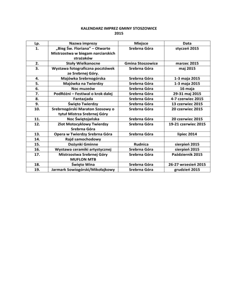 KALENDARZ IMPREZ GMINY STOSZOWICE 2015 Lp. 1. 2. 3. 4. 5. 6. 7. 8. 9. 10. 11. 12. 13. 14. 15. 16. 17. 18. 19. Nazwa imprezy „Bieg Św. Floriana” – Otwarte Mistrzostwa w biegam narciarskich strażaków Stoły Wielkanocne Wystawa fotograficzna pocztówek ze Srebrnej Góry. Majówka Srebrnogórska Majówka na Twierdzy Noc muzeów PodRóżni – Festiwal o krok dalej Fantazjada Święto Twierdzy Srebrnogórski Maraton Szosowy o tytuł Mistrza Srebrnej Góry Noc Świętojaoska Zlot Motocyklowy Twierdzy Srebrna Góra Opera w Twierdzy Srebrna Góra Rajd samochodowy Dożynki Gminne Wystawa ceramiki artystycznej Mistrzostwa Srebrnej Góry MUFLON MTB Święto Wina Jarmark Sowiogórski/Mikołajkowy Miejsce Srebrna Góra Data styczeo 2015 Gmina Stoszowice Srebrna Góra marzec 2015 maj 2015 Srebrna Góra Srebrna Góra Srebrna Góra Srebrna Góra Srebrna Góra Srebrna Góra Srebrna Góra 1-3 maja 2015 1-3 maja 2015 16 maja 29-31 maj 2015 4-7 czerwiec 2015 13 czerwiec 2015 20 czerwiec 2015 Srebrna Góra Srebrna Góra 20 czerwiec 2015 19-21 czerwiec 2015 Srebrna Góra lipiec 2014 Rudnica Srebrna Góra Srebrna Góra sierpieo 2015 sierpieo 2015 Październik 2015 Srebrna Góra Srebrna Góra 26-27 wrzesieo 2015 grudzieo 2015