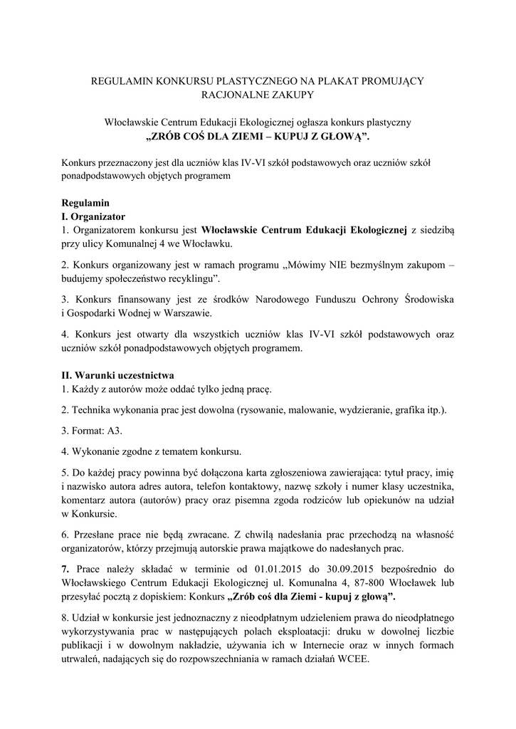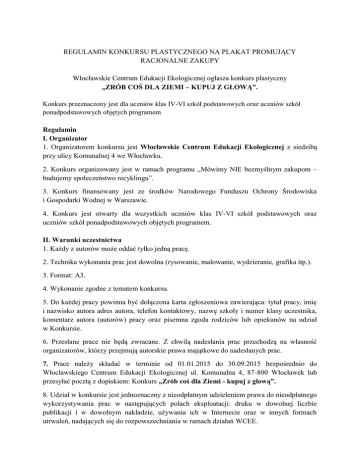 REGULAMIN KONKURSU PLASTYCZNEGO NA PLAKAT PROMUJĄCY RACJONALNE ZAKUPY Włocławskie Centrum Edukacji Ekologicznej ogłasza konkurs plastyczny „ZRÓB COŚ DLA ZIEMI – KUPUJ Z GŁOWĄ”. Konkurs przeznaczony jest dla uczniów klas IV-VI szkół podstawowych oraz uczniów szkół ponadpodstawowych objętych programem Regulamin I. Organizator 1. Organizatorem konkursu jest Włocławskie Centrum Edukacji Ekologicznej z siedzibą przy ulicy Komunalnej 4 we Włocławku. 2. Konkurs organizowany jest w ramach programu „Mówimy NIE bezmyślnym zakupom – budujemy społeczeństwo recyklingu”. 3. Konkurs finansowany jest ze środków Narodowego Funduszu Ochrony Środowiska i Gospodarki Wodnej w Warszawie. 4. Konkurs jest otwarty dla wszystkich uczniów klas IV-VI szkół podstawowych oraz uczniów szkół ponadpodstawowych objętych programem. II. Warunki uczestnictwa 1. Każdy z autorów może oddać tylko jedną pracę. 2. Technika wykonania prac jest dowolna (rysowanie, malowanie, wydzieranie, grafika itp.). 3. Format: A3. 4. Wykonanie zgodne z tematem konkursu. 5. Do każdej pracy powinna być dołączona karta zgłoszeniowa zawierająca: tytuł pracy, imię i nazwisko autora adres autora, telefon kontaktowy, nazwę szkoły i numer klasy uczestnika, komentarz autora (autorów) pracy oraz pisemna zgoda rodziców lub opiekunów na udział w Konkursie. 6. Przesłane prace nie będą zwracane. Z chwilą nadesłania prac przechodzą na własność organizatorów, którzy przejmują autorskie prawa majątkowe do nadesłanych prac. 7. Prace należy składać w terminie od 01.01.2015 do 30.09.2015 bezpośrednio do Włocławskiego Centrum Edukacji Ekologicznej ul. Komunalna 4, 87-800 Włocławek lub przesyłać pocztą z dopiskiem: Konkurs „Zrób coś dla Ziemi - kupuj z głową”. 8. Udział w konkursie jest jednoznaczny z nieodpłatnym udzieleniem prawa do nieodpłatnego wykorzystywania prac w następujących polach eksploatacji: druku w dowolnej liczbie publikacji i w dowolnym nakładzie, używania ich w Internecie oraz w innych formach utrwaleń, nadających się do rozpowszechniania w ramach działań WCEE. 9. Udział w konkursie jest równoznaczny z wyrażeniem przez osoby uczestniczące zgody na przetwarzanie przez organizatora ich danych osobowych na potrzeby konkursu oraz w celach marketingowych organizatora/ustawa o ochronie danych osobowych z dn.29.08.1997 r. Dz.U. Nr 133 poz.833 z póz. zm. Osoby uczestniczące w konkursie potwierdzają swoją zgodę na powyższe w formie przesłania do organizatora oświadczenia zgodnie z zał. do niniejszego regulaminu. 9. Zwycięska praca zostanie wykorzystana jako wzorzec plakatów wykorzystywanych podczas akcji uświadamiającej skalę problemu prowadzonej w sklepach i sklepikach szkolnych. III. Złożenie prac 1. Koszty przesyłki pokrywa uczestnik. 2. Organizator nie bierze odpowiedzialności za ewentualne uszkodzenia prac lub ich zaginięcie w transporcie pocztowym. 3. Prace konkursowe należy przesyłać tak, aby nie uległy zniszczeniu podczas transportu, najlepiej w usztywnionej kopercie. IV. Rozstrzygnięcie konkursu 1. Rozstrzygnięcie konkursu nastąpi w IV kwartale 2015r. 2. Wszystkie prace biorące udział w konkursie oceniane będą według tych samych kryteriów. 3. Oceny prac dokona jury powołane przez organizatora. Decyzje jury są ostateczne. 4. Jury wybierze 3 najlepsze prace, przyznając I, II, III miejsce oraz 3 wyróżnienia. Organizatorzy zastrzegają sobie prawo innego podziału nagród. 5. Wszyscy laureaci zostaną powiadomieni o werdykcie jury pisemnie. 6. Nagrodzone prace będą opublikowane w witrynie www.wcee.org.pl. 7. Organizatorzy przewidują nagrody ufundowane przez NFOŚiGW. Nagrody rzeczowe w tym min. książki, programy komputerowe, sprzęt elektroniczny (MP4 , MP3, aparaty cyfrowe, urządzenia wielofunkcyjne, ramki cyfrowe oraz karty pamięci) nie podlegają zamianie na inne, ani zamianie na ekwiwalent pieniężny. V. Postanowienia końcowe 1. Nadesłanie prac oznacza akceptację warunków konkursu i regulaminu, którego ostateczna interpretacja należy do jury konkursu. Żadne odwołania nie zostaną uwzględnione. 2. Organizator zastrzega sobie prawo do przerwania lub odwołania konkursu. 3. Regulamin konkursu opublikowany jest na stronie internetowej www.wcee.org.pl 4. Wszelkie informacje o konkursie można otrzymać pod numerem tel. 54 232 76 82; 603 622 266 lub wysyłając pytania na adres e-mail [email protected] KARTA ZGŁOSZENIOWA- Konkurs plastyczny „Zrób coś dla Ziemi – kupuj z głową” Tytuł pracy: .................................................................................................................................... Imię i nazwisko autora : ..................................................................................................................... Adres autora: .................................................................................................................................... Telefon kontaktowy: .......................................................................................................................... Nazwa szkoły i numer klasy uczestnika ............................................................................................................................................................. ............................................................................................................................................................. Oświadczenie: „Wyrażam zgodę na przetwarzanie moich danych osobowych przez Organizatora Konkursu Plastycznego- Włocławskie Centrum Edukacji Ekologicznej w celach wynikających z regulaminu tego konkursu, zgodnie z ustawą z dnia 29 sierpnia 1997 roku o ochronie danych osobowych (Dz. U. Z 1997r., nr 133, poz. 883 z późniejszymi zmianami). Poprzez wysłanie prac na konkurs nieodpłatnie przenoszę na organizatora wszelkie autorskie prawa majątkowe do nich, na wszystkich polach ek