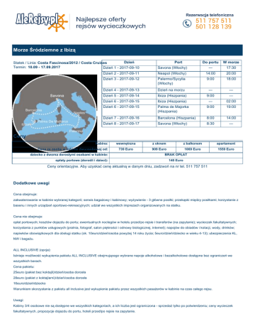 Morze Śródziemne z Ibizą Dzień Statek / Linia: Costa Fascinosa/2012 / Costa Cruises Termin: 10.09 - 17.09.2017 Dzień 1 - 2017-09-10 Do portu W morze Savona (Włochy) Port --- 17:30 Dzień 2 - 2017-09-11 Neapol (Włochy) 14:00 20:00 Dzień 3 - 2017-09-12 Palermo/Sycylia (Włochy) 9:00 18:00 Dzień 4 - 2017-09-13 Dzień na morzu --- --- Dzień 5 - 2017-09-14 Ibiza (Hiszpania) 9:00 --- Dzień 6 - 2017-09-15 Ibiza (Hiszpania) --- 02:00 Dzień 6 - 2017-09-15 Palma de Majorka (Hiszpania) 9:00 19:00 Dzień 7 - 2017-09-16 Barcelona (Hiszpania) 8:00 14:00 Dzień 8 - 2017-09-17 Savona (Włochy) 8:30 --- Ceny Kabina: Cena za osobę w kabinie dwuosobowej od: wewnętrzna z oknem z balkonem apartament 739 Euro 909 Euro 1069 Euro 1559 Euro dziecko z dwoma dorosłymi osobami w kabinie: opłaty portowe (dorośli i dzieci): BRAK OPŁAT 140 Euro Ceny orientacyjne. Aby uzyskać cenę aktualną w danym dniu, zadzwoń na nr tel. 511 757 511 Dodatkowe uwagi Cena obejmuje: zakwaterowanie w kabinie wybranej kategorii; serwis bagażowy i kabinowy; wyżywienie - 3 główne posiłki; przekąski między posiłkami; korzystanie z basenu i innych urządzeń sportowo-rekreacyjnych; udział we wszystkich imprezach organizowanych na statku. Cena nie obejmuje: opłat portowych; kosztów dojazdu do portu; ewentualnych noclegów w hotelu przed/po rejsie i transferów (na zapytanie); wycieczek fakultatywnych; korzystania z punktów usługowych (pralnia, fotograf, salon piękności i odnowy biologicznej, internet); napojów do obiadów i kolacji, wody, drinków; napiwków obowiązkowych dla obsługi statku (ok. 10euro/dzień/osoba powyżej 14 roku życia; 5euro/dzień/dziecko w wieku 4-13); ubezpieczenia KL, NW i bagażu. ALL INCLUSIVE (opcja): Istnieje możliwość wykupienia pakietu ALL INCLUSIVE obejmującego wybrane napoje alkoholowe i bezalkoholowe dostępne bez ograniczeń we wszystkich barach. Cena pakietu: 25euro (pakiet bez koktajli)/dzień/osoba dorosła 28euro (pakiet z koktajlami)/dzień/osoba dorosła 16euro/dzień/dziecko Warunkiem skorzystania z pakietu all inclusive jest wykupienie pakietu przez wszystkich pasażerów w kabinie na czas całego rejsu. Uwagi: Kabiny 3/4 osobowe nie są dostępne we wszystkich kategoriach, a ich liczba jest ograniczona - sprzedaż tylko po potwierdzeniu; ceny wycieczek fakultatywnych, propozycje dojazdu do portu, hoteli przed/po rejsie na zapytanie. Na pokładzie statku obowiązuje bezgotówkowy system opłat. Należność reguluje się ostatniego dnia rejsu gotówką (wpłata depozytu ok. 250euro/kabina pierwszego dnia rejsu) lub kartą kredytową (VISA, Mastercard, American Express) na podstawie zbiorczego rachunku. Karty kredytowe należy zarejestrować zaraz po zaokrętowaniu.