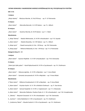 WYNIKI KONKURSU I NAGRODZONE WIERSZE WYRÓŻNIAJĄCYCH SIĘ, POCZĄTKUJĄCYCH POETÓW: KAT. II-III: I miejsce „Moje talenty” - Martyna Warnke , kl. IIIa SP Brusy - op. P. B. Piotrowska II miejsce „Mam talent” - Weronika Berendt, kl. II SP Zalesie – op. P. L. Miloch III miejsce „Mam talent” - Karolina Warnke, kl. III SP Zalesie – op. P. I. Śledź Wyróżnienia 1.„Moje Talenty” - Natalia Weltrowska , kl. III SP w Kosobudach – op. P. D. Szyszka 2.„Mam talent” - Natalia Nowotka, kl. II SP Zalesie – op. P. L. Miloch 3.„Moje życie” - Paweł Leszczyński, kl. IIIa – SP Brusy - op. P.B. Piotrowska 4.„Moja pasja” - Wiktoria Rekowska, kl. IIIa – SP Brusy – op. P. B. Piotrowska Kategoria klasy IV – VI I miejsce „Mam talent” - Szymon Pepliński kl. VI SP w Kosobudach – op. P. M. Ostrowska II miejsce „Talent jest tylko jeden” – Kamil Ryduchowski kl. VI SP w Czyczkowach – op. P. K. Stoltmann III miejsce „Mam talent” – Roksana Igielska, kl. VI SP w Męcikale – op. P. Anna Różek „Mam talent” – Samanta Januszewska kl. VI SP w Męcikale – op. P. Anna Różek Wyróżnienia 1.”Mam talent” - Wiktoria Drozdowska kl. IV SP w Męcikale – op. P. Anna Różek 2.„Mam talent” - Krystian Kuehn kl. IV SP w Wielkich Chełmach - op. P. Ewa Kortas 3.„Mam talent” - Samuel Szopiński kl. VI SP w Czapiewicach – op. P. K. Olszewska 4.„Mam talent” - Weronika Pobłocka i Paulina Pryba kl. V SP w Kosobudach – op. P. M. Sznajdrowska 5. „Talenty” - Wojciech Ossowski kl. VI SP w Kosobudach – op. P. M. Ostrowska 6. „Kucharz” – Anita Nakielska kl. V SP w Czyczkowach – op. P. K. Stoltmann 7. „Codzienny Talent” – Klaudia Szulta kl. V SP w Czyczkowach – op. P. K. Stoltmann 8. „Talent nastolatki” – Magdalena Leszczyńska kl. VI SP w Czyczkowach – op. P. K. Stoltmann 9. „Talentów moc” – Daria Grzelak kl. VI SP w Męcikale – op. P. Anna Różek 10. „Mój świat talentów” –Daria Hamerska kl. VI SP w Męcikale – op. P. Anna Różek 11. „Mam Talent” – Juliusz Kownacki kl. V SP w Męcikale – op. P. Anna Różek 12. „Mam Talent”– Anna Majer kl. VI SP w Męcikale – op. P. Anna Różek 13. „Mam Talent”– Julia Gierszewska kl. IV SP w Męcikale – op. P. Anna Różek 14. „Mam Talent”– Kamil Hope kl. IV SP w Męcikale – op. P. Anna Różek 15. „Talenty „ – Anna Rafińska kl. IV SP w Wielkich Chełmach - op. P. Ewa Kortas 16. „Dzienne porządki” – Ewelina Rafińska kl IV SP w Wielkich Chełmach - op. P. Ewa Kortas 17. Bez tytułu – Grzegorz Mielewczyk kl. IV SP w Czapiewicach – op. P. K. Olszewska 18. „Mam talent „– Angelika Literska kl. V SP w Leśnie – op. P. E. Topka 19. „Kariera tancerki” – Weronika Gołuńska kl. IV SP w Leśnie – op. P. E. Topka 20. „Ukryty talent” - Weronika Szopińska kl. IV SP w Kosobudach – op. P. M. Ostrowska