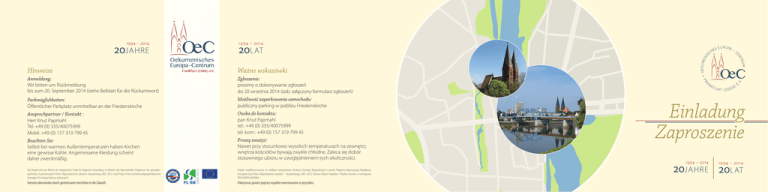 1994 – 2014 20JAHRE 1994 – 2014 20LAT Hinweise Ważne wskazówki Anmeldung: Wir bitten um Rückmeldung bis zum 20. September 2014 (siehe Beiblatt für die Rückantwort) Parkmöglichkeiten: Öffentlicher Parkplatz unmittelbar an der Friedenskirche Ansprechpartner / Kontakt : Herr Knut Papmahl Tel: +49 (0) 335/40075999 Mobil: +49 (0) 157 319 799 45 Beachten Sie: Selbst bei warmen Außentemperaturen haben Kirchen eine gewisse Kühle. Angemessene Kleidung scheint daher zweckmäßig. Zgłoszenie: prosimy o dokonywanie zgłoszeń do 20 września 2014 (zob. załączony formularz zgłoszeń) Możliwość zaparkowania samochodu: publiczny parking w pobliżu Friedenskirche Osoba do kontaktu: pan Knut Papmahl tel.: +49 (0) 335/40075999 tel. kom.: +49 (0) 157 319 799 45 Proszę zważyć: Nawet przy stosunkowo wysokich temperaturach na zewnętrz, wnętrza kościołów bywają zwykle chłodne. Zaleca się dobór stosownego ubioru w uwzględnieniem tych okoliczności. Das Projekt wird aus Mitteln des Europäischen Fonds für Regionale Entwicklung im Rahmen des Operationellen Programms der grenzübergreifenden Zusammenarbeit Polen (Wojewodschaft Lubuskie)–Brandenburg 2007-2013, Small Project Fund und Netzwerkprojektefonds der Euroregion Pro Europa Viadrina, kofinanziert. Projekt współfinansowany ze środków Europejskiego Funduszu Rozwoju Regionalnego w ramach Programu Operacyjnego Współpracy Transgranicznej Polska (Województwo Lubuskie) – Brandenburgia 2007-2013, Fundusz Małych Projektów i Projekty Sieciowe w Euroregionie PRO EUROPA VIADRINA. Grenzen überwinden durch gemeinsame Investition in die Zukunft. Pokonywać granice poprzez wspólne inwestowanie w przyszłość. Einladung Zaproszenie 1994 – 2014 1994 – 2014 20JAHRE 20LAT 1994 – 2014 20 LAT Zaproszenie 1994 – 2014 20JAHRE Einladung Die neuen gesellschaftlichen Gegebenheiten mit der Vollendung der deut- Das ist uns Anlass und Freude, Sie niosły zarówno nowe możliwości jak i nieznane dotąd wyzwania. W o bliczu Z okazji radosnej, okrągłej rocznicy tych wydarzeń pragniemy zaprosić Państwa schen Einheit brachten neue Herausforderungen und viele neue Möglich- am Samstag, dem 27. September 2014, um 14.00 Uhr tych przemian, 20 lat temu grupa obywateli Frankfurtu we współpracy z w sobotę, 27 września 2014 roku o godzinie 14.00 keiten. So gründete sich vor 20 Jahren durch das freiwillige Zusammentun zum Ökumenischen Festgottesdienst frankfurckim Urzędem Miasta, Uniwersytetem Europejskim Viadrina oraz na ekumeniczne nabożeństwo Frankfurter Bürger, der Stadtverwaltung Frankfurt (Oder), der Europa-Univer- und anschließender Festveranstaltung mit Empfang Rady Ekumenicznej Frankfurtu nad Odrą powołała do życia stowarzyszenie oraz następującą po nim uroczystość w kościele sität Viadrina und des Ökumenischen Rates Frankfurt (Oder) das in die Friedenskirche zu Frankfurt (Oder), Schulstraße 4a, Europejskie Centrum Ekumeniczne we Frankfurcie nad Odrą, Friedenskirche we Frankfurcie nad Odrą, Oekumenische Europa – Centrum Frankfurt (Oder) e.V. einzuladen. wyznaczając mu zadanie i cel w postaci urzeczywistniania ekumeny w nowo przy Schulstraße 4a. mit dem Ziel und der Aufgabe, Ökumene im Sinn und Geist von Begeg- Der Festakt beginnt um 15.30 Uhr. kształtowanej Europie, w zrozumieniu i duchu wspólnoty i dialogu przedsta- Początek uroczystości przewidziany jest na godzinę 15.30. nung und Dialog mit Menschen unterschiedlicher Konfessionen, Kirchen, Nowe uwarunkowania społeczne wynikłe ze zjednoczenia Niemiec przy- wicieli różnych wyznań, kościołów, religii, miejsc pochodzenia i narodowości. Religionen, Herkunft und Nationalitäten im sich neu gestaltenden Europa Christoph Bruckhoff Prezes Stowarzyszenia zu verwirklichen. Christoph Bruckhoff Vorsitzender