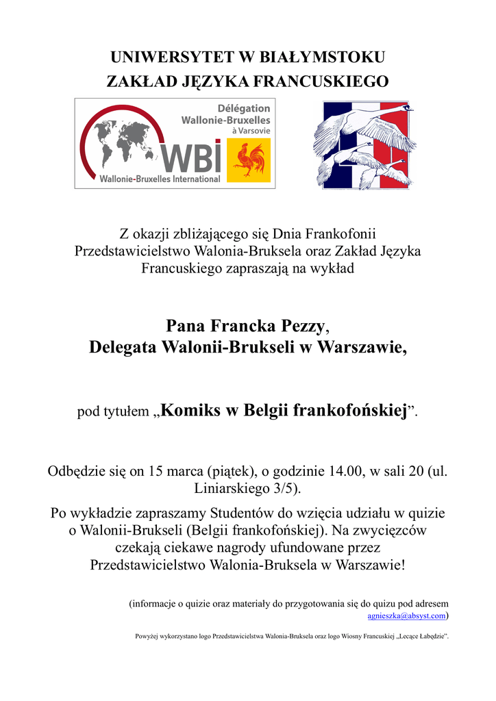 UNIWERSYTET W BIAŁYMSTOKU ZAKŁAD JĘZYKA FRANCUSKIEGO Z okazji zbliŜającego się Dnia Frankofonii Przedstawicielstwo Walonia-Bruksela oraz Zakład Języka Francuskiego zapraszają na wykład Pana Francka Pezzy, Delegata Walonii-Brukseli w Warszawie, pod tytułem „Komiks w Belgii frankofońskiej”. Odbędzie się on 15 marca (piątek), o godzinie 14.00, w sali 20 (ul. Liniarskiego 3/5). Po wykładzie zapraszamy Studentów do wzięcia udziału w quizie o Walonii-Brukseli (Belgii frankofońskiej). Na zwycięzców czekają ciekawe nagrody ufundowane przez Przedstawicielstwo Walonia-Bruksela w Warszawie! (informacje o quizie oraz materiały do przygotowania się do quizu pod adresem [email protected]) PowyŜej wykorzystano logo Przedstawicielstwa Walonia-Bruksela oraz logo Wiosny Francuskiej „Lecące Łabędzie”.