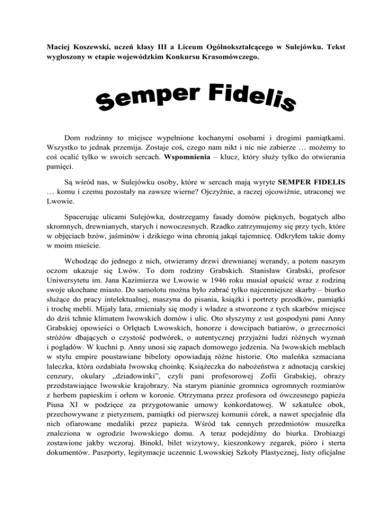 Maciej Koszewski, uczeń klasy III a Liceum Ogólnokształcącego w Sulejówku. Tekst wygłoszony w etapie wojewódzkim Konkursu Krasomówczego. Dom rodzinny to miejsce wypełnione kochanymi osobami i drogimi pamiątkami. Wszystko to jednak przemija. Zostaje coś, czego nam nikt i nic nie zabierze … moŜemy to coś ocalić tylko w swoich sercach. Wspomnienia – klucz, który słuŜy tylko do otwierania pamięci. Są wśród nas, w Sulejówku osoby, które w sercach mają wyryte SEMPER FIDELIS … komu i czemu pozostały na zawsze wierne? Ojczyźnie, a raczej ojcowiźnie, utraconej we Lwowie. Spacerując ulicami Sulejówka, dostrzegamy fasady domów pięknych, bogatych albo skromnych, drewnianych, starych i nowoczesnych. Rzadko zatrzymujemy się przy tych, które w objęciach bzów, jaśminów i dzikiego wina chronią jakąś tajemnicę. Odkryłem takie domy w moim mieście. Wchodząc do jednego z nich, otwieramy drzwi drewnianej werandy, a potem naszym oczom ukazuje się Lwów. To dom rodziny Grabskich. Stanisław Grabski, profesor Uniwersytetu im. Jana Kazimierza we Lwowie w 1946 roku musiał opuścić wraz z rodziną swoje ukochane miasto. Do samolotu moŜna było zabrać tylko najcenniejsze skarby – biurko słuŜące do pracy intelektualnej, maszyna do pisania, ksiąŜki i portrety przodków, pamiątki i trochę mebli. Mijały lata, zmieniały się mody i władze a stworzone z tych skarbów miejsce do dziś tchnie klimatem lwowskich domów i ulic. Oto słyszymy z ust gospodyni pani Anny Grabskiej opowieści o Orlętach Lwowskich, honorze i dowcipach batiarów, o grzeczności stróŜów dbających o czystość podwórek, o autentycznej przyjaźni ludzi róŜnych wyznań i poglądów. W kuchni p. Anny unosi się zapach domowego jedzenia. Na lwowskich meblach w stylu empire poustawiane bibeloty opowiadają róŜne historie. Oto maleńka szmaciana laleczka, która ozdabiała lwowską choinkę. KsiąŜeczka do naboŜeństwa z adnotacją carskiej cenzury, okulary „dziadowinki”, czyli pani profesorowej Zofii Grabskiej, obrazy przedstawiające lwowskie krajobrazy. Na starym pianinie gromnica ogromnych rozmiarów z herbem papieskim i orłem w koronie. Otrzymana przez profesora od ówczesnego papieŜa Piusa XI w podzięce za przygotowanie umowy konkordatowej. W szkatułce obok, przechowywane z pietyzmem, pamiątki od pierwszej komunii córek, a nawet specjalnie dla nich ofiarowane medaliki przez papieŜa. Wśród tak cennych przedmiotów muszelka znaleziona w ogrodzie lwowskiego domu. A teraz podejdźmy do biurka. Drobiazgi zostawione jakby wczoraj. Binokl, bilet wizytowy, kieszonkowy zegarek, pióro i sterta dokumentów. Paszporty, legitymacje uczennic Lwowskiej Szkoły Plastycznej, listy oficjalne i te prywatne, zdjęcia osobiste, na przykład brata Władysława i fotografie dokumentujące udział profesora w wierzchosławickich doŜynkach razem z autorem „Chłopów”. Na dnie szuflady wyłoŜonej „Gazetą Lwowską” prawdziwy skarb, którym nie pogardziłoby Warszawskie Muzeum Literatury - rękopis nigdy nie opublikowanego wiersza Artura Oppmana, który artysta dedykował profesorowi za działalność propolską podczas obrad na konferencji w Wersalu. Na półkach stosy ksiąŜek pisanych w róŜnych językach, wśród nich te, które wyszły spod pióra pierwszej damy polskiej teologii - córki profesora - pani Stanisławy. Wszystkich tych skarbów strzegą wykute w kamieniu pracowitą dłonią artystki –córki Anny rzeźby a, wśród nich najznaczniejsze: potęŜny medalion z orłem oraz herb Lwowa, na którym widnieje szarfa z napisem SEMPER FIDELIS. Opuszczamy juŜ ten gościnny dom, choć pani Anna wciąŜ opowiada nowe historie. Tymczasem zaprasza nas kolejna lwowiaka, pani Irena Snarska. Osieroconą w czasie wojny we Lwowie los, a raczej serce rodziny Grabskich przywiodło do Sulejówka. Dziesięcioletnią Irenkę Stanisław Grabski przygarnął do swojej rodziny i w ten sposób na trwałe splotły się losy lwowskiego dziecka z historią mojego miasta. Mała Irenka, niezwykle utalentowana, ukończyła Liceum Plastyczne i Akademię Sztuk Pięknych w Warszawie w klasie znanego ilustratora ksiąŜek Jana Marcina Szancera. Artystka została profesorem tej uczelni. Za swoje prace zdobyła uznanie na całym świecie. W jej domu zwiedzimy pracownię. Na środku potęŜna maszyna do powielania grafik, sztalugi, kartony, na biurku dzbany pełne pędzi, rylce, i inne narzędzia pracy. Na centralnej ścianie skromna, z surowego drewna półka. Na niej największe skarby pani Ireny. Jedyne materialne pamiątki ze Lwowa. RóŜaniec mamy i album przedstawiający historię Lwowa pod tytułem „SEMPER FIDELIS”. Biorąc do ręki tę najukochańszą ksiąŜkę, p. Sanrska otwiera kluczem pamięci swoje serce. Oto szpital izraelicki przy ulicy Rapapporta, w którym leŜała p. Snarska jako dziecko, kruŜganki katedry ormiańskiej, kopiec Unii Lubelskiej, gdzie autorka zgubiła szmacianą laleczkę, kościół św. ElŜbiety miejsce chrztu Irenki i inne. Wszystkim tym wspomnieniom p. Snarska nadała artystyczny wyraz. Artystka wykonała cykl grafik pod tytułem „Mój Lwów”. Jedną z ciekawych prac jest obraz kloszardki – lwowskiej Kasandry, ślepej Minci, która to mieszkając na ulicy, przepowiadała przyszłość i ostrzegała przechodniów przed niebezpieczeństwem. Te i inne grafiki moŜecie państwo obejrzeć w internetowej galerii Sulejówka. Lwowską atmosferę pracowni podkreśla, konieczna pani Irenie do pracy, lwowska muzyka. Słyszymy więc, Ŝe „nigdzie ludziom tak dobrze nie jest, jak tylko we Lwowie”. Zamykamy oprawione w skórę poŜółkłe kartki albumu. śegnamy wzruszoną do łez lwowiankę, która do dziś przechowuje w swym sercu zapach kulikowskiego chleba i słowa Hemara: „Tym co nie chcą pamiętać – pamięcią dokuczać, I tych co juŜ nie płaczą – znowu do łez wzruszać...” Szanowni państwo, w kaŜdym mieście stoją domy schowane w o