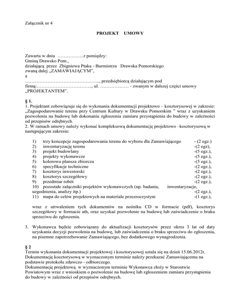 Załącznik nr 4 PROJEKT UMOWY Zawarta w dniu ……………..r pomiędzy: Gminą Drawsko Pom., działającą przez Zbigniewa Ptaka - Burmistrza Drawska Pomorskiego zwaną dalej „ZAMAWIAJĄCYM”, a ……………………………………….., przedsiębiorcą działającym pod firmą:…………………………….., ul. ……………… - zwanym w dalszej części umowy „PROJEKTANTEM”. § 1. 1. Projektant zobowiązuje się do wykonania dokumentacji projektowo – kosztorysowej w zakresie: „Zagospodarowanie terenu przy Centrum Kultury w Drawsku Pomorskim ” wraz z uzyskaniem pozwolenia na budowę lub dokonaniu zgłoszenia zamiaru przystąpienia do budowy w zaleŜności od przepisów odrębnych. 2. W ramach umowy naleŜy wykonać kompleksową dokumentację projektowo –kosztorysową w następującym zakresie: 1) trzy koncepcje zagospodarowania terenu do wyboru dla Zamawiającego - (2 egz.) 2) inwentaryzację terenu -(2 egz), 3) projekt budowlany -(5 egz.), 4) projekty wykonawcze -(5 egz.), 5) kolorowa plansza zbiorcza -(5 egz.), 6) specyfikacje techniczne -(2 egz.), 7) kosztorys inwestorski -(2 egz.), 8) kosztorys szczegółowy -(2 egz.), 9) przedmiar robót -(2 egz.), 10) pozostałe załączniki projektów wykonawczych (np. badania, inwentaryzacje, uzgodnienia, analizy itp.) -(2 egz.), 11) mapa do celów projektowych na materiale przezroczystym -(1 egz.), wraz z utrwaleniem tych dokumentów na nośniku CD w formacie (pdf), kosztorys szczegółowy w formacie ath, oraz uzyskać pozwolenie na budowę lub zaświadczenie o braku sprzeciwu do zgłoszenia. 3. Wykonawca będzie zobowiązany do aktualizacji kosztorysów przez okres 3 lat od daty uzyskania decyzji pozwolenia na budowę, lub zaświadczenia o braku sprzeciwu do zgłoszenia, na pisemne zapotrzebowanie Zamawiającego, bez dodatkowego wynagrodzenia. §2 Termin wykonania dokumentacji projektowej i kosztorysowej ustala się na dzień 15.06.2012r. Dokumentację kosztorysową w wyznaczonym terminie naleŜy przekazać Zamawiającemu na podstawie protokołu zdawczo - odbiorczego. Dokumentację projektową w wyznaczonym terminie Wykonawca złoŜy w Starostwie Powiatowym wraz z wnioskiem o pozwolenie na budowę lub zgłoszeniem zamiaru przystąpienia do budowy w zaleŜności od przepisów odrębnych. §3 1. Strony zgodnie oświadczają, Ŝe będą współpracować, konsultując wzajemnie swoje uwagi i propozycje dotyczące dokumentacji. 2. Strony zobowiązują się do wzajemnego informowania się na piśmie o zaistniałych przeszkodach w wypełnianiu wzajemnych świadczeń w trakcie wykonywania prac projektowych. 3. Strony uzgadniają, Ŝe w zakresie przedmiotu umowy będą dokonywać konsultacji w siedzibie Zamawiającego, pierwsza na etapie wykonywania inwentaryzacji, druga na etapie ostatecznego zatwierdzenia koncepcji przez Zamawiającego, dwie kolejne na etapie wykonywania dokumentacji projektowej. 4. W celu dokumentowania dokonanych uzgodnień Wykonawca zobowiązany jest do prowadzenia „ dziennika wykonywanych prac i konsultacji”. §4 1. Wykonawca zapewni wykonanie umowy z naleŜytą starannością, w sposób zgody z ustaleniami określonymi w zapytaniu ofertowym, wymaganiami ustaw, aktów wykonawczych, obowiązujących norm, zasadami wiedzy technicznej i ponosi za to odpowiedzialność. 2. Wykonawca zapewnia, Ŝe w rozwiązaniach projektowych stosować będzie materiały i urządzenia dopuszczone do obrotu, powszechnego stosowania, które zostały uzgodnione i zaakceptowane przez Zamawiającego. 3. Strony uzgadniają, Ŝe w trakcie realizacji zamówienia Zamawiający ma prawo na bieŜąco śledzić postęp prac projektowych, w tym zwłaszcza mieć nieograniczony dostęp do „ dziennika wykonywania prac i konsultacji”. 4. Wykonawca zobowiązuje się do pozyskania we własnym zakresie wszelkich materiałów, niezbędnych do opracowania dokumentacji , w tym uzyskania wymaganych decyzji, opinii, uzgodnień i sprawdzeń rozwiązań projektowych w zakresie wynikającym z przepisów. §5 1. Przy odbiorze dokumentacji Zamawiający nie jest zobowiązany do dokonania sprawdzenia jakości wykonanej dokumentacji. 2. Zamawiający dokona sprawdzenia kompletności dokumentacji w terminie 15 dni od daty odbioru dokumentacji i ewentualnie zgłosi swoje zastrzeŜenia lub oświadczy o braku zastrzeŜeń do kompletności dokumentacji. 3. W przypadku stwierdzenia wad lub braków w dokumentacji projektowej niezaleŜnie od terminu ich ujawnienia, Wykonawca jest zobowiązany z własnej inicjatywy lub na Ŝądanie Zamawiającego do ich usunięcia , w terminie wskazanym przez Zamawiającego. 4. Odbiór dokumentacji projektowej nastąpi w formie protokołów zdawczo – odbiorczych. §6 1. Strony ustalają wynagrodzenie za opracowanie przedmiotu umowy w formie ryczałtowej w wysokości : ……………zł brutto (słownie: ……………………….00/100 złotych). Kwota netto wynosi : ……………zł (słownie: ……………………………….netto). 2. Wynagrodzenie powyŜsze obejmuje wszystkie koszty ponoszone przez Wykonawcę z tytułu realizacji dokumentacji projektowo – kosztorysowej wraz z uzyskaniem pozwolenia na budowę lub dokonania zgłoszenia robót budowlanych oraz przekazanie praw autorskich do przedmiotu umowy. 3. Podstawą zapłaty będzie faktura wystawiona przez Projektanta za wykonanie przedmiotu umowy wraz z protokółem zdawczo odbiorczym wykonania dokumentacji projektowo – kosztorysowej podpisanym przez Zamawiającego, oraz decyzją pozwolenia na budowę lub oświadczenia o braku sprzeciwu do zgłoszenia robót. 4. Termin realizacji faktury ustala się na 30 dni od daty wpływu faktury do Zamawiającego, przy czym za dzień zapłaty uwaŜa się dzień obciąŜenia rachunku bankowego Zamawiającego. 5. Cesja wierzytelności wynagrodzenia z niniejszej umowy moŜliwa jest wyłącznie za zgodą Zamawiającego. 6. Wraz z zapłatą za przedmiot umowy, wszelkie prawa majątkowe, wynikające z ustawy o pra