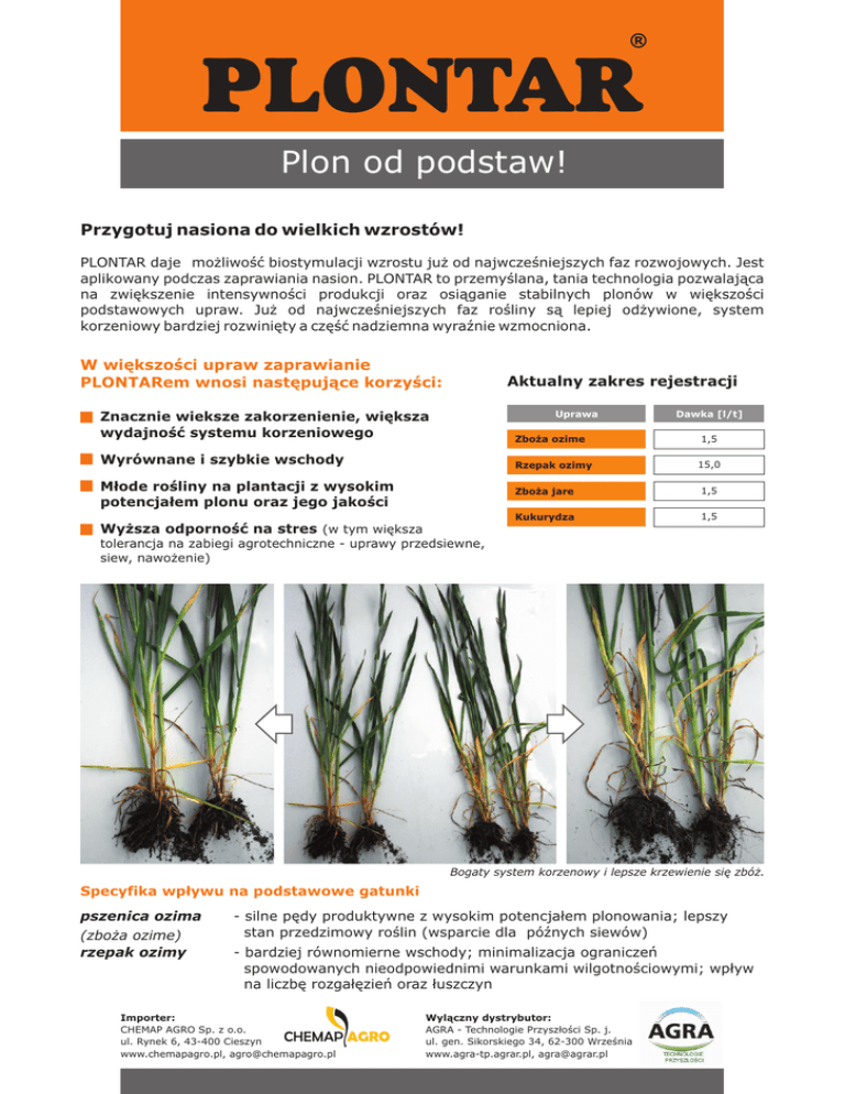 PLONTAR Plon od podstaw! Przygotuj nasiona do wielkich wzrostów! PLONTAR daje możliwość biostymulacji wzrostu już od najwcześniejszych faz rozwojowych. Jest aplikowany podczas zaprawiania nasion. PLONTAR to przemyślana, tania technologia pozwalająca na zwiększenie intensywności produkcji oraz osiąganie stabilnych plonów w większości podstawowych upraw. Już od najwcześniejszych faz rośliny są lepiej odżywione, system korzeniowy bardziej rozwinięty a część nadziemna wyraźnie wzmocniona. W większości upraw zaprawianie PLONTARem wnosi następujące korzyści: Aktualny zakres rejestracji Uprawa Znacznie wieksze zakorzenienie, większa wydajność systemu korzeniowego Zboża ozime Wyrównane i szybkie wschody Rzepak ozimy Młode rośliny na plantacji z wysokim potencjałem plonu oraz jego jakości Dawka [l/t] 1,5 15,0 Zboża jare 1,5 Kukurydza 1,5 Wyższa odporność na stres (w tym większa tolerancja na zabiegi agrotechniczne - uprawy przedsiewne, siew, nawożenie) Bogaty system korzenowy i lepsze krzewienie się zbóż. Specyfika wpływu na podstawowe gatunki pszenica ozima (zboża ozime) rzepak ozimy - silne pędy produktywne z wysokim potencjałem plonowania; lepszy stan przedzimowy roślin (wsparcie dla późnych siewów) - bardziej równomierne wschody; minimalizacja ograniczeń spowodowanych nieodpowiednimi warunkami wilgotnościowymi; wpływ na liczbę rozgałęzień oraz łuszczyn Importer: CHEMAP AGRO Sp. z o.o. ul. Rynek 6, 43-400 Cieszyn www.chemapagro.pl, [email protected] Wylączny dystrybutor: AGRA - Technologie Przyszłości Sp. j. ul. gen. Sikorskiego 34, 62-300 Września www.agra-tp.agrar.pl, [email protected] Oziminy silne rośliny przed zimą = intensywny start wiosenny Wspieraniem rozwoju roślin (w tym późno sianych) można podnosić ich zimotrwałość oraz potencjalne plonowanie. PSZENICA OZIMA korzenie (10 roślin) ocena przedzimowa RZEPAK OZIMY korzenie (10 roślin) 2008/09 2009/10 2010/11 2009/10 2010/11 Kontrola - zaprawa nasienna 12,8 g 15,9 g 12,2 g 28,9 g 14,0 g PLONTAR + zaprawa nasienna 17,1 g 21,5 g 14,7 g 50,5 g 21,1 g Źródło: ZS Kluky (Stacja oceny pestycydów), Ing. Tomáš Fiala (pszenica); ČZU (Czeski uniwersytet rolniczy), Ing. David Bečka, Ing. Pavel Cihlář (rzepak) Pszenica ozima, zboża ozime poprawa wschodów + wzmocnienie systemu korzeniowego = silne pędy z wysokim potencjalem plonowania a) wpływ od kiełkowania aż do plonu ilość roślin ocena 20.11.2009 (szt/m2) ilość kłosów ocena 28.6.2010 (szt/m2) objętościowa waga (g/l) wydajność zaprawiane: Raxil 060 FS 305,75 583 735,0 7,99 zaprawiane: PLONTAR 1,5 l/t + Raxil 060 FS 314,75 632 739,5 8,45 zaprawiane: PLONTAR 1,5 l/t + Raxil 060 FS 16.4.2010: SUNAGREEN 0,5 l/ha 314,25 607 743,0 9,01 odmiana pszenicy: Meritto siew: 1.10.2009 norma siewu: 4 MKN/ha (t/ha) Źródło: Ditana Velká Bystřice (Stacja oceny pestycydów), Ing. Alena Bezdíčková, 2010 b) korzyść w jakości ziarna - zwiększenie udziału ziarna ponad 2,2 mm - odmiany jęczmienia browarnego (ozima Wintmalt i jara Prestige) - zawartość białka obniżona do 12,8% (13,4% w kontroli) WINTMALT wydajność ziarna ponad 2,2 mm (t/ha) (%) zaprawiane: Maxim Star 1,5 l/t 7,06 100,0 zaprawiane: PLONTAR 1,5 l/t + Maxim Star 1,5 l/t 7,59 107,5 PRESTIGE wydajność ziarna ponad 2,2 mm (t/ha) (%) 6,44 100,0 6,64 104,0 Źródło: Soufflet Agro, Litovice, Ing. Jiří Šilha, 2010 2 zwiększenie ilości klosów (szt/m ) c) zwiększenie ilości klosów - różne odmiany pszenicy Kontrola - zaprawa nasienna PLONTAR 1,5 l/t + zaprawa nasienna 632 627 585 583 449 501 485 486 zwięszenie plonu + 460 kg/ha zwięszenie plonu + 500 kg/ha ZS Kluky 11.6.2010 Cubus Ditana V.Bystř., 28.6.2010 Meritto R.A.G.T., ŠS Braniš. 1.6.2011 Federer ZS Kluky 20.6.2011 Mulan Rzepak ozimy lepsze wschody + zwiększenie systemu korzeniowego = silne i bardzo odporne rośliny odmiana: Californium siew: 23.8.2009 ocena: 3.11.2009 korzenie świeże (10 roślin) (g) (%) korzenie sucha masa (10 roślin) (g) (%) długość korzeni (10 roślin) (cm) (%) zaprawiane: Chinook 200 FS + Vitavax 2000 28,9 100,00 5,8 100,00 15,8 zaprawiane: PLONTAR 15 l/t + Chinook 200 FS + Vitavax 2000 50,5 174,74 10,6 182,76 17,4 ilość liści liczba rozgałęzień (ocena: 12.7.2010) (szt) (%) (szt) (%) 100,00 7,23 100,00 7,57 100,00 110,13 7,73 106,92 8,55 112,95 Źródło: ČZU (Czeski uniwersytet rolniczy), Ing. David Bečka, 2010 Więcej informacji: www.chemapagro.pl, www.agra-tp.agrar.pl, mail: [email protected], tel.: +48 695 791 868 Ulotka ta ma tyłko charakter informacyjny. Podczas używania produktu, postępuj zgodnie z instrukcjami na etykiecie. Wszystkie prawa zastrzeżone © CHEMAP AGRO Sp. z o.o., wydanie 08/2011
