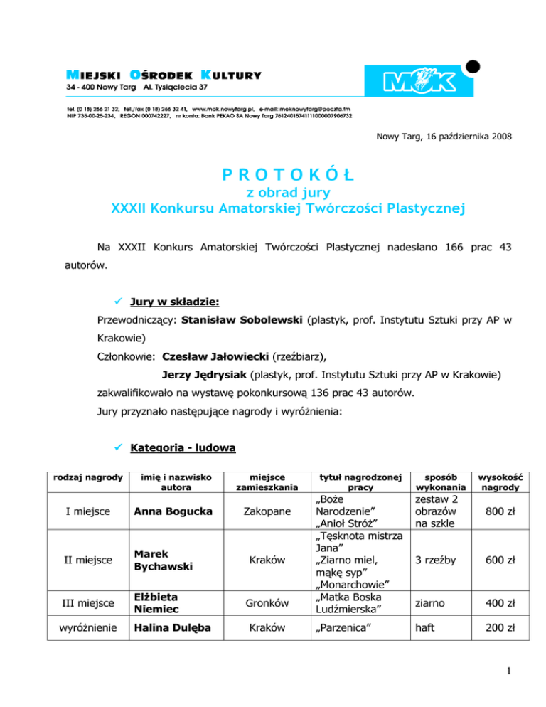 Nowy Targ, 16 października 2008 PROTOKÓŁ z obrad jury XXXII Konkursu Amatorskiej Twórczości Plastycznej Na XXXII Konkurs Amatorskiej Twórczości Plastycznej nadesłano 166 prac 43 autorów. Jury w składzie: Przewodniczący: Stanisław Sobolewski (plastyk, prof. Instytutu Sztuki przy AP w Krakowie) Członkowie: Czesław Jałowiecki (rzeźbiarz), Jerzy Jędrysiak (plastyk, prof. Instytutu Sztuki przy AP w Krakowie) zakwalifikowało na wystawę pokonkursową 136 prac 43 autorów. Jury przyznało następujące nagrody i wyróŜnienia: Kategoria - ludowa rodzaj nagrody imię i nazwisko autora I miejsce Anna Bogucka II miejsce Marek Bychawski III miejsce ElŜbieta Niemiec wyróŜnienie Halina Dulęba miejsce zamieszkania Zakopane Kraków Gronków Kraków tytuł nagrodzonej pracy sposób wykonania wysokość nagrody „BoŜe Narodzenie” „Anioł StróŜ” „Tęsknota mistrza Jana” „Ziarno miel, mąkę syp” „Monarchowie” „Matka Boska Ludźmierska” zestaw 2 obrazów na szkle 800 zł 3 rzeźby 600 zł ziarno 400 zł „Parzenica” haft 200 zł 1 Kategoria - nieprofesjonalna rodzaj nagrody imię i nazwisko autora miejsce zamieszkania tytuł nagrodzonej pracy Zakopane „Portret artysty Henri Michaux” „Chrystus” „Chrystus” „Pamięci T. Brzozowskiego” Joanna Walas Kępno „Portret Artysty” III miejsce Józef Stachnik Kraków wyróŜnienie Janusz Tybur Krościenko I miejsce Julian Klamerus II miejsce sposób wykonania wysokość nagrody 4 obrazy 1 rzeźba 800 zł olej 600 zł „Portret Artysty” olej 400 zł „Portret artysty violistin” rzeźba 200 zł 2