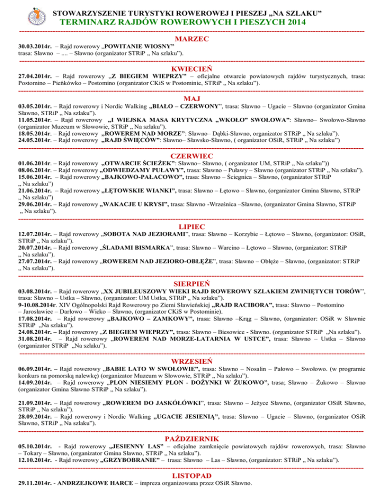 STOWARZYSZENIE TURYSTYKI ROWEROWEJ I PIESZEJ „NA SZLAKU” TERMINARZ RAJDÓW ROWEROWYCH I PIESZYCH 2014 -------------------------------------------------------------------------------------------------------------------------------------MARZEC 30.03.2014r. – Rajd rowerowy „POWITANIE WIOSNY” trasa: Sławno – .... – Sławno (organizator STRiP „ Na szlaku”). -------------------------------------------------------------------------------------------------------------------------------------KWIECIEŃ 27.04.2014r. – Rajd rowerowy „Z BIEGIEM WIEPRZY” – oficjalne otwarcie powiatowych rajdów turystycznych, trasa: Postomino – Pieńkówko – Postomino (organizator CKiS w Postominie, STRiP „ Na szlaku”). -------------------------------------------------------------------------------------------------------------------------------------MAJ 03.05.2014r. – Rajd rowerowy i Nordic Walking „BIAŁO – CZERWONY”, trasa: Sławno – Ugacie – Sławno (organizator Gmina Sławno, STRiP „ Na szlaku”). 11.05.2014r. – Rajd rowerowy „I WIEJSKA MASA KRYTYCZNA „WKOŁO” SWOŁOWA”: Sławno– Swołowo-Sławno (organizator Muzeum w Słowowie, STRiP „ Na szlaku”). 18.05.2014r. – Rajd rowerowy „ROWEREM NAD MORZE”: Sławno– Dąbki-Sławno, organizator STRiP „ Na szlaku”). 24.05.2014r. – Rajd rowerowy „RAJD ŚWIĘCÓW”: Sławno– Sławsko-Sławno, ( organizator OSiR, STRiP „ Na szlaku”) -------------------------------------------------------------------------------------------------------------------------------------CZERWIEC 01.06.2014r. – Rajd rowerowy „OTWARCIE ŚCIEŻEK”: Sławno– Sławno, ( organizator UM, STRiP „ Na szlaku”)) 08.06.2014r. – Rajd rowerowy „ODWIEDZAMY PUŁAWY”, trasa: Sławno – Puławy – Sławno (organizator STRiP „ Na szlaku”). 15.06.2014r. – Rajd rowerowy „BAJKOWO-PAŁACOWO”, trasa: Sławno – Ściegnica – Sławno, (organizator STRiP „ Na szlaku”) 21.06.2014r. – Rajd rowerowy „ŁĘTOWSKIE WIANKI”, trasa: Sławno – Łętowo – Sławno, (organizator Gmina Sławno, STRiP „ Na szlaku”) 29.06.2014r. – Rajd rowerowy „WAKACJE U KRYSI”, trasa: Sławno -Wrześnica –Sławno, (organizator Gmina Sławno, STRiP „ Na szlaku”). -------------------------------------------------------------------------------------------------------------------------------------LIPIEC 12.07.2014r. – Rajd rowerowy „SOBOTA NAD JEZIORAMI”, trasa: Sławno – Korzybie – Łętowo – Sławno, (organizator: OSiR, STRiP „ Na szlaku”). 20.07.2014r. – Rajd rowerowy „ŚLADAMI BISMARKA”, trasa: Sławno – Warcino – Łętowo – Sławno, (organizator: STRiP „ Na szlaku”). 27.07.2014r. – Rajd rowerowy „ROWEREM NAD JEZIORO-OBŁĘŻE”, trasa: Sławno – Obłęże – Sławno, (organizator: STRiP „ Na szlaku”). -------------------------------------------------------------------------------------------------------------------------------------SIERPIEŃ 03.08.2014r. – Rajd rowerowy „XX JUBILEUSZOWY WIEKI RAJD ROWEROWY SZLAKIEM ZWINIĘTYCH TORÓW”, trasa: Sławno – Ustka – Sławno, (organizator: UM Ustka, STRiP „ Na szlaku”). 9-10.08.2014r. XIV Ogólnopolski Rajd Rowerowy po Ziemi Sławieńskiej „RAJD RACIBORA”, trasa: Sławno – Postomino – Jarosławiec – Darłowo – Wicko – Sławno, (organizator CKiS w Postominie). 17.08.2014r. – Rajd rowerowy „BAJKOWO – ZAMKOWY”, trasa: Sławno –Krąg – Sławno, (organizator: OSiR w Sławnie STRiP „Na szlaku”). 24.08.2014r. – Rajd rowerowy „Z BIEGIEM WIEPRZY”, trasa: Sławno – Biesowice - Sławno. (organizator STRiP „Na szlaku”). 31.08.2014r. – Rajd rowerowy „ROWEREM NAD MORZE-LATARNIA W USTCE”, trasa: Sławno – Ustka – Sławno (organizator STRiP „Na szlaku”). -------------------------------------------------------------------------------------------------------------------------------------WRZESIEŃ 06.09.2014r. – Rajd rowerowy „BABIE LATO W SWOŁOWIE”, trasa: Sławno – Nosalin – Pałowo – Swołowo. (w programie konkurs na pomorską nalewkę) (organizator Muzeum w Słowowie, STRiP „ Na szlaku”). 14.09.2014r. – Rajd rowerowy „PLON NIESIEMY PLON - DOŻYNKI W ŻUKOWO”, trasa; Sławno – Żukowo – Sławno (organizator Gmina Sławno STRiP „ Na szlaku”). 21.09.2014r. – Rajd rowerowy „ROWEREM DO JASKÓŁÓWKI”, trasa: Sławno – Jeżyce Sławno, (organizator OSiR Sławno, STRiP „ Na szlaku”). 28.09.2014r. – Rajd rowerowy i Nordic Walking „UGACIE JESIENIĄ”, trasa: Sławno – Ugacie – Sławno, (organizator OSiR Sławno, STRiP „ Na szlaku”). -------------------------------------------------------------------------------------------------------------------------------------PAŹDZIERNIK 05.10.2014r. - Rajd rowerowy „JESIENNY LAS” – oficjalne zamknięcie powiatowych rajdów rowerowych, trasa: Sławno – Tokary – Sławno, (organizator Gmina Sławno, STRiP „ Na szlaku”). 12.10.2014r. - Rajd rowerowy „GRZYBOBRANIE” – trasa: Sławno – Las – Sławno, (organizator: STRiP „ Na szlaku”). -------------------------------------------------------------------------------------------------------------------------------------LISTOPAD 29.11.2014r. - ANDRZEJKOWE HARCE – impreza organizowana przez OSiR Sławno.