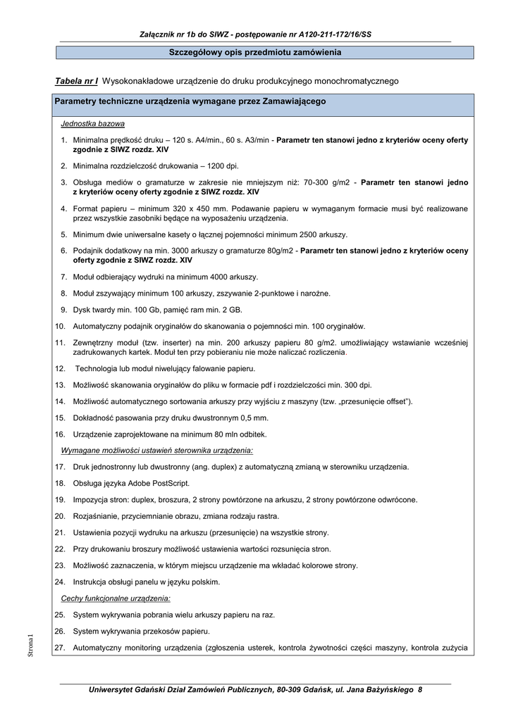 Załącznik nr 1b do SIWZ - postępowanie nr A120-211-172/16/SS Szczegółowy opis przedmiotu zamówienia Tabela nr I Wysokonakładowe urządzenie do druku produkcyjnego monochromatycznego Parametry techniczne urządzenia wymagane przez Zamawiającego Jednostka bazowa 1. Minimalna prędkość druku – 120 s. A4/min., 60 s. A3/min - Parametr ten stanowi jedno z kryteriów oceny oferty zgodnie z SIWZ rozdz. XIV 2. Minimalna rozdzielczość drukowania – 1200 dpi. 3. Obsługa mediów o gramaturze w zakresie nie mniejszym niż: 70-300 g/m2 - Parametr ten stanowi jedno z kryteriów oceny oferty zgodnie z SIWZ rozdz. XIV 4. Format papieru – minimum 320 x 450 mm. Podawanie papieru w wymaganym formacie musi być realizowane przez wszystkie zasobniki będące na wyposażeniu urządzenia. 5. Minimum dwie uniwersalne kasety o łącznej pojemności minimum 2500 arkuszy. 6. Podajnik dodatkowy na min. 3000 arkuszy o gramaturze 80g/m2 - Parametr ten stanowi jedno z kryteriów oceny oferty zgodnie z SIWZ rozdz. XIV 7. Moduł odbierający wydruki na minimum 4000 arkuszy. 8. Moduł zszywający minimum 100 arkuszy, zszywanie 2-punktowe i narożne. 9. Dysk twardy min. 100 Gb, pamięć ram min. 2 GB. 10. Automatyczny podajnik oryginałów do skanowania o pojemności min. 100 oryginałów. 11. Zewnętrzny moduł (tzw. inserter) na min. 200 arkuszy papieru 80 g/m2. umożliwiający wstawianie wcześniej zadrukowanych kartek. Moduł ten przy pobieraniu nie może naliczać rozliczenia. 12. Technologia lub moduł niwelujący falowanie papieru. 13. Możliwość skanowania oryginałów do pliku w formacie pdf i rozdzielczości min. 300 dpi. 14. Możliwość automatycznego sortowania arkuszy przy wyjściu z maszyny (tzw. „przesunięcie offset”). 15. Dokładność pasowania przy druku dwustronnym 0,5 mm. 16. Urządzenie zaprojektowane na minimum 80 mln odbitek. Wymagane możliwości ustawień sterownika urządzenia: 17. Druk jednostronny lub dwustronny (ang. duplex) z automatyczną zmianą w sterowniku urządzenia. 18. Obsługa języka Adobe PostScript. 19. Impozycja stron: duplex, broszura, 2 strony powtórzone na arkuszu, 2 strony powtórzone odwrócone. 20. Rozjaśnianie, przyciemnianie obrazu, zmiana rodzaju rastra. 21. Ustawienia pozycji wydruku na arkuszu (przesunięcie) na wszystkie strony. 22. Przy drukowaniu broszury możliwość ustawienia wartości rozsunięcia stron. 23. Możliwość zaznaczenia, w którym miejscu urządzenie ma wkładać kolorowe strony. 24. Instrukcja obsługi panelu w języku polskim. Strona1 Cechy funkcjonalne urządzenia: 25. System wykrywania pobrania wielu arkuszy papieru na raz. 26. System wykrywania przekosów papieru. 27. Automatyczny monitoring urządzenia (zgłoszenia usterek, kontrola żywotności części maszyny, kontrola zużycia Uniwersytet Gdański Dział Zamówień Publicznych, 80-309 Gdańsk, ul. Jana Bażyńskiego 8 Załącznik nr 1b do SIWZ - postępowanie nr A120-211-172/16/SS materiałów eksploatacyjnych) bez ingerencji użytkownika. 28. Pozostawianie nieskończonych prac w pamięci po wyłączeniu maszyny i możliwość wznowienia od momentu przerwania druku po włączeniu maszyny. 29. Możliwość wstrzymania drukowanej pracy i zmiany ustawień na panelu sterowniczym (marginesy, przesunięcie lub przycięcie stron na arkuszu, pozycjonowanie stron). Tabela nr II Wysokonakładowe urządzenie do druku produkcyjnego kolorowego Parametry techniczne sprzętu wymagane przez Zamawiającego Jednostka bazowa 1. Minimalna prędkość druku w kolorze – 70 s. A4/min., 30 s. A3/min 2. Minimalna rozdzielczość drukowania – 1200 dpi. 3. Obsługa mediów o gramaturze w zakresie nie mniejszym niż: 70-300 g/m2. 4. Format papieru – minimum 320 x 450 mm. Podawanie papieru w wymaganym formacie musi być realizowane przez wszystkie zasobniki będące na wyposażeniu urządzenia. 5. Co najmniej jeden uniwersalny podajnik o łącznej pojemności min. 1500 arkuszy papieru 80 g/m2 6. Podajnik dodatkowy o pojemności min. 2500 arkuszy 80 g/m2 - parametr ten stanowi jedno z kryteriów oceny oferty zgodnie z SIWZ rozdz. XIV 7. Dedykowany moduł lub wbudowane rozwiązanie umożliwiające druk kopert o rozmiarach w standardzie min. C6, C5, C4, DL i gramaturze w zakresie nie mniejszym niż: 70-100 g/m2. 8. Moduł odbierający wydruki (ang. finisher) na minimum 4000 arkuszy. 9. Moduł zszywający minimum 100 arkuszy, zszywanie 2-puntowe i narożne. 10. Dysk twardy min. 100 GB. 11. Automatyczny podajnik oryginałów do skanowania o pojemności min. 100 oryginałów 12. Możliwość skanowania oryginałów do pliku w formacie pdf i rozdzielczości min. 300 dpi. 13. Technologia lub moduł niwelujący falowanie papieru. 14. Spektrofotometr z oprogramowaniem do linearyzacji maszyny. 15. Dokładność pasowania przy druku dwustronnym 1 mm. 16. Urządzenie zaprojektowane na minimum 5 mln odbitek. Wymagane możliwości ustawień sterownika urządzenia: 17. Druk jednostronny lub dwustronny (ang. duplex) z automatyczną zmianą w sterowniku urządzenia. 18. Obsługa języka Adobe PostScript. 19. Możliwość wstrzymania drukowanej pracy i zmiany ustawień na panelu sterowniczym (marginesy, przesunięcie lub przycięcie stron na arkuszu, pozycjonowanie stron). Cechy funkcjonalne urządzenia: 20. System wykrywania pobrania wielu arkuszy papieru na raz. 21. System wykrywania przekosów papieru. Strona2 22. Kontrola odkształceń obrazów w druku dwustronnym. 23. Automatyczny monitoring urządzenia (zgłoszenia usterek, kontrola żywotności części maszyny, kontrola zużycia materiałów eksploatacyjnych) bez ingerencji użytkownika. Uniwersytet Gdański Dział Zamówień Publicznych, 80-309 Gdańsk, ul. Jana Bażyńskiego 8 Załącznik nr 1b do SIWZ - postępowanie nr A120-211-172/16/SS 24. Możliwość druku na papierach fakturowanych o gramaturze minimum 300 g/m2. Tabela nr III Oprogramowanie do sterowania urządzeniami Parametry techniczne sprzętu wymagane przez Zamawiającego 1. Możliw