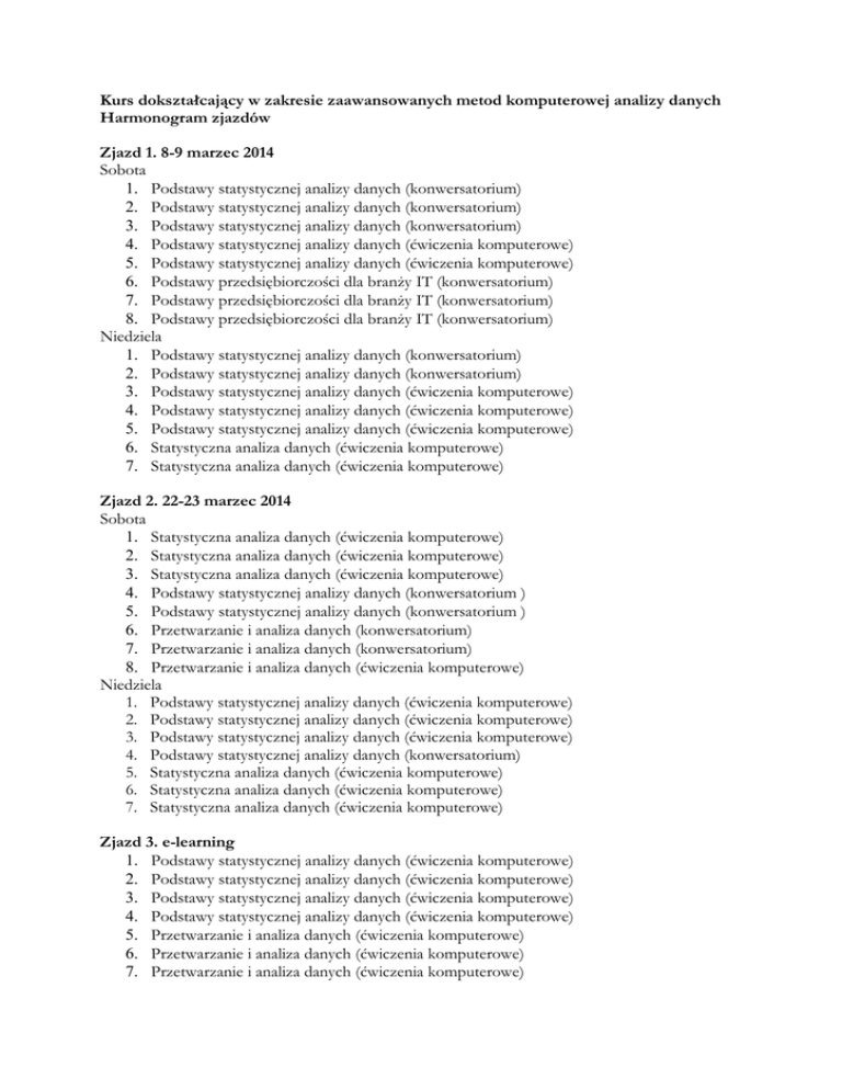 Kurs dokształcający w zakresie zaawansowanych metod komputerowej analizy danych Harmonogram zjazdów Zjazd 1. 8-9 marzec 2014 Sobota 1. Podstawy statystycznej analizy danych (konwersatorium) 2. Podstawy statystycznej analizy danych (konwersatorium) 3. Podstawy statystycznej analizy danych (konwersatorium) 4. Podstawy statystycznej analizy danych (ćwiczenia komputerowe) 5. Podstawy statystycznej analizy danych (ćwiczenia komputerowe) 6. Podstawy przedsiębiorczości dla branży IT (konwersatorium) 7. Podstawy przedsiębiorczości dla branży IT (konwersatorium) 8. Podstawy przedsiębiorczości dla branży IT (konwersatorium) Niedziela 1. Podstawy statystycznej analizy danych (konwersatorium) 2. Podstawy statystycznej analizy danych (konwersatorium) 3. Podstawy statystycznej analizy danych (ćwiczenia komputerowe) 4. Podstawy statystycznej analizy danych (ćwiczenia komputerowe) 5. Podstawy statystycznej analizy danych (ćwiczenia komputerowe) 6. Statystyczna analiza danych (ćwiczenia komputerowe) 7. Statystyczna analiza danych (ćwiczenia komputerowe) Zjazd 2. 22-23 marzec 2014 Sobota 1. Statystyczna analiza danych (ćwiczenia komputerowe) 2. Statystyczna analiza danych (ćwiczenia komputerowe) 3. Statystyczna analiza danych (ćwiczenia komputerowe) 4. Podstawy statystycznej analizy danych (konwersatorium ) 5. Podstawy statystycznej analizy danych (konwersatorium ) 6. Przetwarzanie i analiza danych (konwersatorium) 7. Przetwarzanie i analiza danych (konwersatorium) 8. Przetwarzanie i analiza danych (ćwiczenia komputerowe) Niedziela 1. Podstawy statystycznej analizy danych (ćwiczenia komputerowe) 2. Podstawy statystycznej analizy danych (ćwiczenia komputerowe) 3. Podstawy statystycznej analizy danych (ćwiczenia komputerowe) 4. Podstawy statystycznej analizy danych (konwersatorium) 5. Statystyczna analiza danych (ćwiczenia komputerowe) 6. Statystyczna analiza danych (ćwiczenia komputerowe) 7. Statystyczna analiza danych (ćwiczenia komputerowe) Zjazd 3. e-learning 1. Podstawy statystycznej analizy danych (ćwiczenia komputerowe) 2. Podstawy statystycznej analizy danych (ćwiczenia komputerowe) 3. Podstawy statystycznej analizy danych (ćwiczenia komputerowe) 4. Podstawy statystycznej analizy danych (ćwiczenia komputerowe) 5. Przetwarzanie i analiza danych (ćwiczenia komputerowe) 6. Przetwarzanie i analiza danych (ćwiczenia komputerowe) 7. Przetwarzanie i analiza danych (ćwiczenia komputerowe) 8. Przetwarzanie i analiza danych (ćwiczenia komputerowe) 9. Podstawy statystycznej analizy danych (ćwiczenia komputerowe) 10. Podstawy statystycznej analizy danych (ćwiczenia komputerowe) 11. Podstawy statystycznej analizy danych (ćwiczenia komputerowe) 12. Podstawy statystycznej analizy danych (ćwiczenia komputerowe) 13. Przetwarzanie i analiza danych (ćwiczenia komputerowe) 14. Przetwarzanie i analiza danych (ćwiczenia komputerowe) 15. Przetwarzanie i analiza danych (ćwiczenia komputerowe) Zjazd 4. 5-6 kwiecień 2014 Sobota : 1. Data mining (ćwiczenia komputerowe) 2. Data mining (ćwiczenia komputerowe) 3. Data mining w pakiecie Statistica (ćwiczenia komputerowe) 4. Metody sztucznej inteligencji w analizie danych (ćwiczenia komputerowe) 5. Analiza danych w praktycznych zastosowaniach (wykład) prof. K. Perzanowski, od 11.45 6. Analiza danych w praktycznych zastosowaniach (wykład) prof. K. Perzanowski, do 13.20 7. Analiza danych w praktycznych zastosowaniach (wykład) prof. I. Kozak, od 13.50 8. Analiza danych w praktycznych zastosowaniach (wykład) prof. I. Kozak, do 15. 25 Niedziela: 1. Przetwarzanie i analiza danych (konwersatorium ) 2. Przetwarzanie i analiza danych (konwersatorium ) 3. Przetwarzanie i analiza danych (konwersatorium ) 4. Przetwarzanie i analiza danych (ćwiczenia komputerowe) 5. Przetwarzanie i analiza danych (ćwiczenia komputerowe) 6. Podstawy przedsiębiorczości dla branży IT (konwersatorium) 7. Podstawy przedsiębiorczości dla branży IT (konwersatorium) Zjazd 5. e-learning 1. Statystyczna analiza danych (ćwiczenia komputerowe) 2. Statystyczna analiza danych (ćwiczenia komputerowe) 3. Statystyczna analiza danych (ćwiczenia komputerowe) 4. Data mining w pakiecie Statistica (ćwiczenia komputerowe) 5. Data mining w pakiecie Statistica (ćwiczenia komputerowe) 6. Data mining w pakie cie Statistica (ćwiczenia komputerowe) 7. Data mining w pakiecie Statistica (ćwiczenia komputerowe) 8. Metody sztucznej inteligencji w analizie danych (ćwiczenia komputerowe) 9. Metody sztucznej inteligencji w analizie danych (ćwiczenia komputerowe) 10. Metody sztucznej inteligencji w analizie danych (ćwiczenia komputerowe) 11. Metody sztucznej inteligencji w analizie danych (ćwiczenia komputerowe) 12. Data mining w pakiecie Statistica (ćwiczenia komputerowe) 13. Data mining w pakiecie Statistica (ćwiczenia komputerowe) 14. Data mining w pakiecie Statistica (ćwiczenia komputerowe) 15. Data mining w pakiecie Statistica (ćwiczenia komputerowe) Zjazd 6. 10-11 maj 2014 Sobota 1. Przetwarzanie i analiza danych (konwersatorium ) 2. 3. 4. 5. 6. 7. 8. Przetwarzanie i analiza danych (konwersatorium ) Przetwarzanie i analiza danych (ćwiczenia komputerowe) Przetwarzanie i analiza danych (ćwiczenia komputerowe) Analiza danych w praktycznych zastosowaniach (wykład) prof. R. Smarzewski, od 11.45 Analiza danych w praktycznych zastosowaniach (wykład) prof. R. Smarzewski, do 13.20 Analiza danych w praktycznych zastosowaniach (wykład) prof. P. Francuz, od 13.50 Analiza danych w praktycznych zastosowaniach (wykład) prof. P. Francuz, do 15. 25 Niedziela 1. Przetwarzanie i analiza danych (konwersatorium ) 2. Data mining w pakiecie Statistica (ćwiczenia komputerowe) 3. Metody sztucznej inteligencji w analizie danych (ćwiczenia komputerowe) 4. Metody sztucznej inteligencji w analizie danych (ćwiczenia komputerowe) 5. Przetwarzanie i analiza danych (ćwiczenia komputerowe) 6. Przetwarzanie i analiza danych (ćwiczenia komputerowe) 7. Przetwarzanie i analiza danych (ćwicze