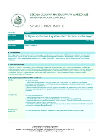 Informator 2015/2016 7\WXáRIHUW\ 3ROLW\NDVSRáHF]QDLV\VWHPXEH]SLHF]HĔVSRáHF]Q\FK Sygnatura 220950 - 0251 3URZDG]ąF\ dr Ewa Cichowicz 3 pkt. ECTS A. Cel przedmiotu &HOH]DMĊü]SU]HGPLRWX]DSR]QDQLHVáXFKDF]\]SRGVWDZRZ\PLSUREOHPDPLSROLW\NLVSRáHF]QHMRUD]XEH]SLHF]HĔ VSRáHF]Q\FKZZDUXQNDFKZVSyáF]HVQ\FKG\OHPDWyZGRW\F]ąF\FKUROLVHNWRUDSXEOLF]QHJR]DVSRNDMDQLXSRWU]HE VSRáHF]Q\FK.RQIURQWDFMD]DOHWLZDGUyĪQ\FKPRGHOLRUJDQL]DFMLLILQDQVRZDQLDSROLW\NLVSRáHF]QHMZJRVSRGDUFH rynkowej. B. Program przedmiotu 3RMĊFLHIRUP\RUD]LQVWUXPHQW\UHDOL]DFMLSROLW\NLVSRáHF]QHM5RODSDĔVWZDVDPRU]ąGXWHU\WRULDOQHJRLRUJDQL]DFML SR]DU]ąGRZ\FKZVIHU]HSROLW\NLVSRáHF]QHM=DEH]SLHF]HQLHVSRáHF]QHDXEH]SLHF]HQLHVSRáHF]QHSRPRFVSRáHF]QD XVáXJLVSRáHF]QH*HQH]DL]DNUHVXEH]SLHF]HQLDVSRáHF]QHJR8EH]SLHF]HQLDHPHU\WDOQRUHQWRZH8EH]SLHF]HQLD ]GURZRWQH3UREOHPNRPHUFMDOL]DFMLQLHNWyU\FKXVáXJVSRáHF]Q\FK3HUVSHNW\Z\UDFMRQDOL]DFML]DU]ąG]DQLDL ILQDQVRZDQLDXVáXJVSRáHF]Q\FK &6]F]HJyáRZHSU]HGPLRWRZHHIHNW\NV]WDáFHQLD Wiedza Student powinien: 1GHILQLRZDüQDMZDĪQLHMV]HSURFHV\VSRáHF]QHLGRVWU]HJDüLFK]ZLą]NL]JRVSRGDUNą 2ZVND]DüNLHUXQNL]PLDQLPRG\ILNDFMLV\VWHPXXEH]SLHF]HĔVSRáHF]Q\FK]SXQNWXZLG]HQLD VSRáHF]HĔVWZDLJRVSRGDUNL 3LQWHUSUHWRZDü]DFKRG]ąFHSURFHV\ZV\VWHPLHVSRáHF]QHVSRáHF]Q\FKLLFKGáXJRRNUHVRZH NRQVHNZHQFMH]SHUVSHNW\Z\JRVSRGDUNLLVSRáHF]HĔVWZDQLHWUDFąF]SRODZLG]HQLDLQWHUHVyZ jednostki. 8PLHMĊWQRĞFL Kompetencje VSRáHF]QH 6WXGHQWSRZLQLHQXPLHü 1LGHQW\ILNRZDüHOHPHQW\V\VWHPXXEH]SLHF]HĔVSRáHF]Q\FK 2RFHQLDüZSá\Z]PLDQZV\VWHPLHXEH]SLHF]HĔVSRáHF]Q\FKQDJRVSRGDUNĊ 3Z\ELHUDüQDMEDUG]LHMHIHNW\ZQHPHWRG\UR]ZLą]\ZDQLDNZHVWLLLSUREOHPyZVSRáHF]Q\FKZ VNDOLMHGQRVWNLURG]LQ\LJUXSVSRáHF]Q\FK 4LGHQW\ILNRZDüNRV]W\LNRU]\ĞFLVSRáHF]QH]ZLą]DQH]HVWRVRZDQLHPNRQNUHWQ\FKUR]ZLą]DĔ ZV\VWHPLHXEH]SLHF]HĔVSRáHF]Q\FK 6WXGHQWSRZLQLHQE\üZUDĪOLZ\QDNZHVWLH]DEH]SLHF]HQLDVSRáHF]QHJRMHGQRVWNL 6]NRáD*áyZQD+DQGORZDZ:DUV]DZLH $O1LHSRGOHJáRĞFL162, 02-554 Warszawa centrala: +48 22 564 60 00, faks kancelarii: +48 22 849 53 12, informacja: +48 22 564 64 64 e-mail: [email protected], http://www.sgh.waw.pl/ 1 FG3ROLW\NDVSRáHF]QDLV\VWHPXEH]SLHF]HĔVSRáHF]Q\FK '6HPHVWUDOQ\SODQ]DMĊü 1 3RMĊFLHIRUP\LQVWUXPHQW\SROLW\NLVSRáHF]QHM 2 5RODSDĔVWZDVDPRU]ąGXWHU\WRULDOQHJRRUD]RUJDQL]DFMLSR]DU]ąGRZ\FKZSROLW\FHVSRáHF]QHM 3 =DEH]SLHF]HQLHVSRáHF]QHDXEH]SLHF]HQLDVSRáHF]QHESRPRFRSLHNDLĞZLDGF]HQLD VSRáHF]QHFXVáXJLVSRáHF]QHDUR]ZyMJRVSRGDUF]\ 4 *HQH]D]DNUHVLURG]DMHXEH]SLHF]HQLDVSRáHF]QHJR 5 Ubezpieczenia emerytalne i rentowe. 6 Ubezpieczenie zdrowotne. 7 8VáXJLPHG\F]QHDSUREOHP\LQIUDVWUXNWXU\ZRFKURQLH]GURZLD 8 8VáXJLRSLHNXĔF]H 9 3UREOHP\EH]URERFLDLZ\NOXF]HQLDVSRáHF]QHJR 10 8VáXJLHGXNDF\MQRZ\FKRZDZF]H 11 8VáXJLNXOWXUDOQHDW]ZSU]HP\VáNXOWXU\ 12 3UREOHP\SU\ZDW\]DFMLLNRPHUFMDOL]DFMLQLHNWyU\FKXVáXJVSRáHF]Q\FK 13 2UJDQL]DFMDLIXQNFMRQRZDQLHXVáXJVSRáHF]Q\FK]HĞURGNyZSXEOLF]Q\FKSRGNąWHPDSRWU]HE VSRáHF]Q\FKEUDFKXQNXHNRQRPLF]QHJR 14 3HUVSHNW\Z\UDFMRQDOL]DFML]DU]ąG]DQLDLILQDQVRZDQLDZVIHU]HSROLW\NLVSRáHF]QHMSDĔVWZDL VDPRU]ąGXWHU\WRULDOQHJR 15 3ROLW\NDVSRáHF]QDZ8QLL(XURSHMVNLHMURODIXQGXV]\8(ZILQDQVRZDQLXSROLW\NLVSRáHF]QHM53 (/LWHUDWXUDSRGVWDZRZDRERZLą]NRZHSRGUĊF]QLNL 3ROLW\NDVSRáHF]QDUHG$.XU]\QRZVNL2:6*+:DUV]DZD20036*ROLQRZVND3ROLW\NDVSRáHF]QDNRQFHSFMH instytucje, koszty, Wyd. Poltext, Warszawa 20006DPRU]ąGRZDSROLW\NDVSRáHF]QD$)UąF]NLHZLF]:\G:637:3 Warszawa 200276]XPOLF]8EH]SLHF]HQLDVSRáHF]QH7HRULDGODSUDNW\NL:\G%UDQWD%\JGRV]F]:DUV]DZD2005; 6\VWHPXEH]SLHF]HĔVSRáHF]Q\FK=DJDGQLHQLDSRGVWDZRZHUHG*6]SRU:\G3ROWH[W:DUV]DZD2009. )/LWHUDWXUDX]XSHáQLDMąFD 0-DQRĞ.UHVáR8VáXJLVSRáHF]QHZSURFHVLHSU]HPLDQV\VWHPRZ\FKZ3ROVFH2:6*+:DUV]DZD2002; P.Bielecki, Bony edukacyjne. Granice urynkowienia edukacji, OW SGH, Warszawa 2005',OF]XN:0LVLąJ)LQDQVRZDQLHL organizacja kultury w gospodarce rynkowej, Wyd. IBnGR, Warszawa 2003;=GURZLHLMHJRRFKURQD0LĊG]\WHRULąD SUDNW\NąUHG9.RUSRURZLF]2:6*+:DUV]DZD2006.*áąELFND3ROLW\NDVSRáHF]QDZ8QLL(XURSHMVNLHM:\G Elipsa, Warszawa 2001;$.URZLFND(3LWHUD&]\ĪRZVND2SLHND]GURZRWQDSRZHMĞFLX3ROVNLGR8(:\G&H'H:X Warszawa 2004. *1DMZDĪQLHMV]HSXEOLNDFMHDXWRUDyZGRW\F]ąFHSURSRQRZDQ\FK]DMĊü 5R]G]LDá8EH]SLHF]HQLD]GURZRWQH5R]G]LDá8EH]SLHF]HQLDFKRURERZHLPDFLHU]\ĔVNLH5R]G]LDá Ubezpieczenia rentowe, w Ubezpieczenia, red. M. Iwanicz-Drozdowska, Polskie Wydawnictwo Ekonomiczne, Warszawa =DOHĪQRĞüSURFHVXNUHRZDQLDNDSLWDáXOXG]NLHJRZJRVSRGDUVWZLHGRPRZ\PRGID]F\NOXUR]ZRMXURG]LQ\L SRVWDZMHMF]áRQNyZ6WXGLDL3UDFH.ROHJLXP(NRQRPLF]QR6SRáHF]QHJRQU:DUV]DZD(ZROXFMD]QDF]HQLD SURFHVXNUHRZDQLDNDSLWDáXOXG]NLHJRZĞZLHWOHFHOyZSROLW\NLURG]LQQHMZ8ZDUXQNRZDQLDGHPRJUDILF]QHUR]ZRMX VSRáHF]QRJRVSRGDUF]HJRQDSU]\NáDG]LHZRMHZyG]WZDĞOąVNLHJRLRSROVNLHJRUHG$5ąF]DV]HN:\GDZQLFWZR Akademii Ekonomicznej w Katowicach, Katowice 2007 H. Sygnatury wymaganych prerekwizytów 6]NRáD*áyZQD+DQGORZDZ:DUV]DZLH $O1LHSRGOHJáRĞFL162, 02-554 Warszawa centrala: +48 22 564 60 00, faks kancelarii: +48 22 849 53 12, informacja: +48 22 564 64 64 e-mail: [email protected], http://www.sgh.waw.pl/ 2 FG3ROLW\NDVSRáHF]QDLV\VWHPXEH]SLHF]HĔVSRáHF]Q\FK QLHVąZ\PDJDQH ,:\PLDULIRUPD]DMĊü Stacj. Sob. niedz. 3RSRáXG 2JyáHP 30 21 30 :\NáDG 15 14 15 ûZLF]HQLD 15 - 15 - 7 - 3UDFDVDPRG]LHOQDSRGNRQWUROą Z\NáDGRZF\ -(OHPHQW\RFHQ\NRĔFRZHM egzamin tradycyjny 100% .:\PDJDQD]QDMRPRĞüMĊ]\NDREFHJR nie jest wymagana L. Kryteria selekcji .ROHMQRĞü]JáRV]HĔ 00HWRG\SURZDG]HQLD]DMĊü :\NáDG ûZLF]HQLD 3UDFDVDPRG]LHOQDSRGNRQWUROąZ\NáDGRZF\ 6]NRáD*áyZQD+DQGORZDZ:DUV]DZLH $O1LHSRGOHJáRĞFL162, 02-554 Warszawa centrala: +48 22 564 60 00, faks kancelarii: +48 22 849 53 12, informacja: +48 22 564 64 64 e-mail: [email protected], http://www.sgh.waw.pl/ 3