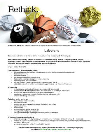 Stora Enso Narew Sp. z o.o. w związku z rozwojem firmy obecnie poszukuje kandydata na stanowisko: Laborant Stanowsko utworzone tylko na okres rozruchu nowej maszyny (3-4 miesiące). Pracownik zatrudniony na tym stanowisku odpowiedzialny będzie za wykonywanie badań laboratoryjnych umożliwiających sterowanie procesami technologicznymi instalacji MP5, badanie obiegów wodno-parowych, gospodarką wodno-ściekową. Miejsce pracy: Ostrołęka. Charakterystyka podstawowych zadań: badania laboratoryjne służące międzyoperacyjnej kontroli procesów technologicznych, badania surowców, badania ścieków, badanie produktu finalnego- papieru badania laboratoryjne obiegów wodno-parowych, opracowywanie wyników badań, rozwiązywanie problemów związanych z wykonywaną pracą, dbałość o prawidłowe użytkowanie aparatury pomiarowej i jej stanu technicznego. Wymagania: wykształcenie średnie (preferowane chemiczne lub techniczne), dodatkowym atutem będzie 2 letnie doświadczenie na podobnym stanowisku, co najmniej podstawowa znajomość języka angielskiego, szkolenia w zakresie wymagań dla laboratoriów nadzorowanych, znajomość obsługi komputera. Pożądane cechy osobowe: komunikacja interpersonalna, odpowiedzialność, dokładność (przestrzeganie procedur, instrukcji i terminów), systematyczność, sumienność, umiejętność szybkiego uczenia się, umiejętność współpracy w zespole, umiejętność łatwego i szybkiego dostosowywania się do zmian. Wybranym kandydatom oferujemy: atrakcyjną pracę w międzynarodowym koncernie, umowa na czas ściśle określony (3-4 miesiące) dostęp do najnowszej wiedzy oraz korporacyjnych narzędzi i możliwość natychmiastowego wykorzystywania tej wiedzy w praktyce, profesjonalny system szkoleń i możliwość rozwoju. Zainteresowane osoby prosimy o przesyłanie dokumentów (CV i listu motywacyjnego) z dopiskiem REKRUTACJA Laborant na czas rozruchu drogą elektroniczną w terminie do 2 tygodni od daty ukazania się ogłoszenia na adres e-mail: [email protected] Zastrzegamy sobie możliwość kontaktu z wybranymi kandydatami. Prosimy również o umieszczenie klauzuli: „Zgadzam się na przetwarzanie danych osobowych zawartych w ofercie pracy dla potrzeb niezbędnych do realizacji procesu rekrutacji (zgodnie z ustawą z dnia 29.08.97 roku o Ochronie Danych Osobowych. Dz. U. Nr 133 poz. 883).”