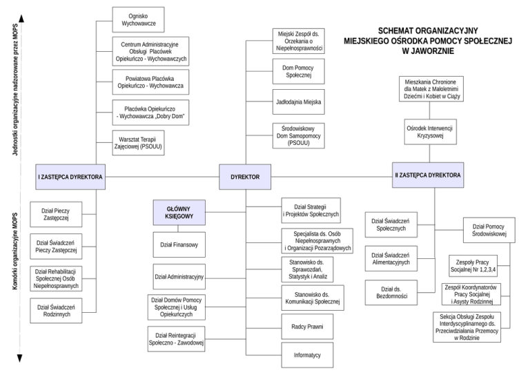 Jednostki organizacyjne nadzorowane przez MOPS Ognisko Wychowawcze Centrum Administracyjne Obsługi Placówek Opiekuńczo - Wychowawczych Jadłodajnia Miejska Placówka Opiekuńczo - Wychowawcza „Dobry Dom” Środowiskowy Dom Samopomocy (PSOUU) Warsztat Terapii Zajęciowej (PSOUU) Dział Pieczy Zastępczej Dział Świadczeń Pieczy Zastępczej Dział Rehabilitacji Społecznej Osób Niepełnosprawnych Dział Świadczeń Rodzinnych SCHEMAT ORGANIZACYJNY MIEJSKIEGO OŚRODKA POMOCY SPOŁECZNEJ W JAWORZNIE Dom Pomocy Społecznej Powiatowa Placówka Opiekuńczo - Wychowawcza I ZASTĘPCA DYREKTORA Komórki organizacyjne MOPS Miejski Zespół ds. Orzekania o Niepełnosprawności Dział Finansowy Dział Administracyjny Dział Domów Pomocy Społecznej i Usług Opiekuńczych Ośrodek Interwencji Kryzysowej II ZASTĘPCA DYREKTORA DYREKTOR GŁÓWNY KSIĘGOWY Mieszkania Chronione dla Matek z Małoletnimi Dziećmi i Kobiet w Ciąży Dział Strategii i Projektów Społecznych Specjalista ds. Osób Niepełnosprawnych i Organizacji Pozarządowych Stanowisko ds. Sprawozdań, Statystyk i Analiz Stanowisko ds. Komunikacji Społecznej Radcy Prawni Dział Reintegracji Społeczno - Zawodowej Informatycy Dział Świadczeń Społecznych Dział Świadczeń Alimentacyjnych Dział ds. Bezdomności Dział Pomocy Środowiskowej Zespoły Pracy Socjalnej Nr 1,2,3,4 Zespół Koordynatorów Pracy Socjalnej i Asysty Rodzinnej Sekcja Obsługi Zespołu Interdyscyplinarnego ds. Przeciwdziałania Przemocy w Rodzinie