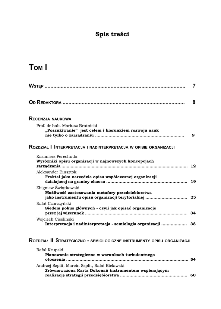 3 Spis treci TOM I WSTÊP ................................................................................................ 7 OD REDAKTORA ................................................................................... 8 RECENZJA NAUKOWA Prof. dr hab. Mariusz Bratnicki Poszukiwanie jest celem i kierunkiem rozwoju nauk nie tylko o zarz¹dzaniu .................................................................. 9 ROZDZIA£ I INTERPRETACJA I NADINTERPRETACJA W OPISIE ORGANIZACJI Kazimierz Perechuda Wyró¿niki opisu organizacji w najnowszych koncepcjach zarz¹dzania ................................................................................................ 12 Aleksander Binsztok Fraktal jako narzêdzie opisu wspó³czesnej organizacji dzia³ajacej na granicy chaosu ............................................................ 19 Zbigniew wi¹tkowski Mo¿liwoæ zastosowania metafory przedsiebiorstwa jako instrumentu opisu organizacji terytorialnej ............................... 25 Rafa³ Czarczyñski Siedem pokus g³ównych - czyli jak opisaæ organizacjê przez jej wizerunek .............................................................................. 34 Wojciech Cieliñski Interpretacja i nadinterpretacja - semiologia organizacji ................... 38 ROZDZIA£ II STRATEGICZNO - SEMIOLOGICZNE INSTRUMENTY OPISU ORGANIZACJI Rafa³ Krupski Planowanie strategiczne w warunkach turbulentnego otoczenia ........................................................................................... 54 Andrzej Szplit, Marcin Szplit, Rafa³ Bielawski Zrównowa¿ona Karta Dokonañ instrumentem wspieraj¹cym realizacjê strategii przedsiêbiorstwa .................................................. 60 4 Miros³aw Kwieciñski, Konrad Kolegowicz Wywiad gospodarczy jako narzedzie charakterystyki organizacji konkurentów - dylematy organizacyjne, kulturowe i etyczne ........................................................................... 68 Maria Miczyñska-Kowalska Alianse strategiczne firm - teoria i praktyka ...................................... 80 Urszula Maciejczuk Koncepcja kluczowych kompetencji w budowaniu przewagi konkurencyjnej przedsiêbiorstw ....................................................... 89 Adam Nalepka, Maciej Górecki Wycena kompetencji pracowników i ich integracja w systemie p³ac zasadniczych firmy Classen-Pol S. A. ........................................ 96 Marek Domaga³a CRM jako element opisu organizacji .................................................. 105 Piotr Tarka Organizacja przysz³oci ...................................................................... 111 Wies³aw H³adkiewicz, Adam Ilciów Znaczenie i rola marketingu politycznego w teorii organizacji ........................................................................... 119 Janusz Biernat Pomiar synergii zespo³ów - ludzka ksiêgowoæ ................................. 127 Mieczys³aw Morawski, Janusz Piepora Nowe podstawy zarz¹dzania. Pracownicy wiedzy .............................. 132 Mieczys³aw Morawski, Krzysztof Chlebowski Zasoby intelektualne w strategii organizacji ..................................... 137 Katarzna Libor Rola przewagi konkurencyjnej w funkcjonowaniu przedsiêbiorstw medycznych ............................................................ 150 INFORMACJA O AUTORACH .............................................................................. 156 TOM II WSTÊP ................................................................................................ 7 OD REDAKTORA ................................................................................... 8 RECENZJA NAUKOWA Mariusz Bratnicki Poszukiwanie jest celem i kierunkiem rozwoju nauk nie tylko o zarz¹dzaniu .................................................................. 9 5 ROZDZIA£ III PRAKTYCZNE PRZYK£ADY OPISU ORGANIZACJI Estera Piwoni-Krzeszowska Partnerstwo w analizie klientów ...................................................... 12 Agnieszka Krawczyk Benchmarking - studium przypadków .............................................. 21 Waldemar Szewc Oprogramowanie Doradca - wirtualna metoda opisu i zarz¹dzania organizacj¹ ....................................................... 32 ROZDZIA£ IV NOWOCZESNE KONCEPCJE I TECHNOLOGIE OPISU ORGANIZACJI Wojciech Podemski ISO 9001:2000 - narzêdzie w zarz¹dzaniu jakoci¹ us³ug w ma³ej firmie ........................................................................ 42 Aleksandra Sus-Januchowska Rola tablic kompetencyjnych w okrelaniu funkcji organizacyjnych przedsiêbiorstwa zarz¹dzanego procesowo ............ 53 Sabina Ostrowska Wykorzystanie rachunku kosztów dzia³añ (Activity Based Costing) w redukcji kosztów zapasów ...................... 60 Bartosz Otmianowski IGrafix jako narzêdzie opisu organizacji procesów w przedsiêbiorstwie ......................................................................... 74 Ryszard Koby³ka, Wojciech Cieliñski Prakseologiczna Karta Wyników (PKW) jako narzêdzie opisu procesów ......................................................... 91 Micha³ Pietrzak Mapa strategii jako narzêdzie opisu przedsiêbiorstwa w systemie zarz¹dzania opartym na Zrównowa¿onej Karcie Wyników ................................................................................ 99 Andrzej Brzozowski Rachunek kosztów dzia³añ (Activity Based Costing) jako nowoczesna metoda opisu przedsiêbiorstwa ............................. 108 ROZDZIA£ V KULTUROWO - BEHAWIORALNE PERSPEKTYWY OPISU ORGANIZACJI Anna Krzy¿aniak Architektura marek na przyk³adzie najwiêkszych producentów piwa w Polsce ............................................................... 118 Krzysztof £obos Wymiary struktur sieciowych ........................................................... 124 Sylwia Pierzchawka Rola mened¿erów w kszta³towaniu i zmianie kultury ...................... 130 organizacyjnej 6 Urszula B¹kowska Jak badaæ zasoby relacyjne ma³ych przedsiêbiorstw? 
