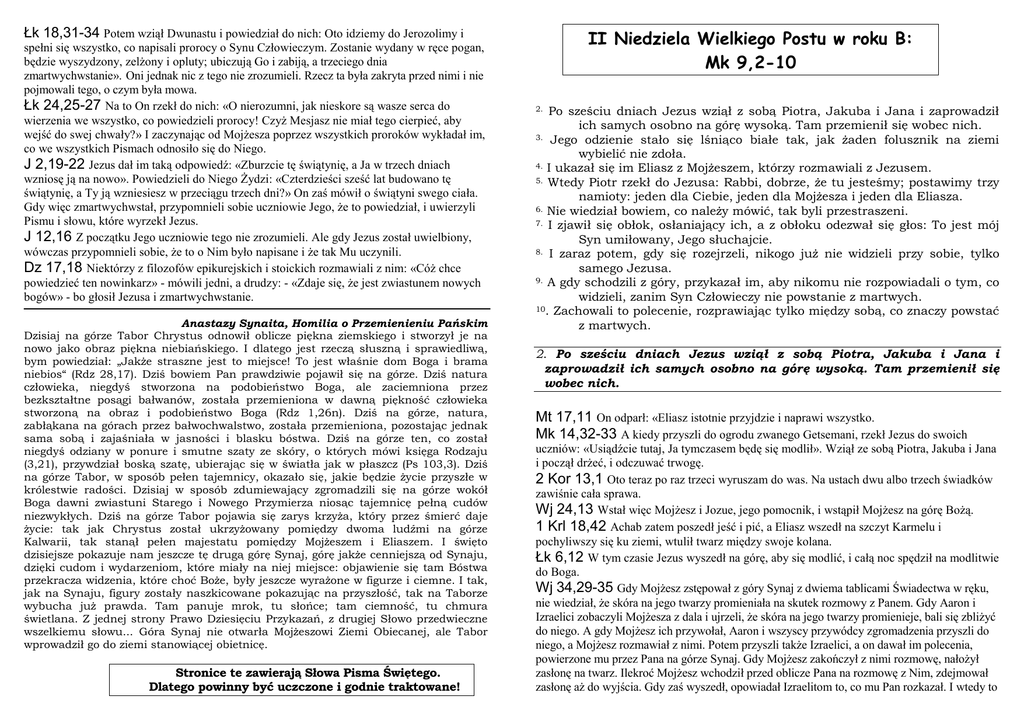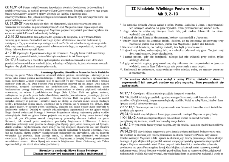 Łk 18,31-34 Potem wziął Dwunastu i powiedział do nich: Oto idziemy do Jerozolimy i spełni się wszystko, co napisali prorocy o Synu Człowieczym. Zostanie wydany w ręce pogan, będzie wyszydzony, zelŜony i opluty; ubiczują Go i zabiją, a trzeciego dnia zmartwychwstanie». Oni jednak nic z tego nie zrozumieli. Rzecz ta była zakryta przed nimi i nie pojmowali tego, o czym była mowa. Łk 24,25-27 Na to On rzekł do nich: «O nierozumni, jak nieskore są wasze serca do wierzenia we wszystko, co powiedzieli prorocy! CzyŜ Mesjasz nie miał tego cierpieć, aby wejść do swej chwały?» I zaczynając od MojŜesza poprzez wszystkich proroków wykładał im, co we wszystkich Pismach odnosiło się do Niego. J 2,19-22 Jezus dał im taką odpowiedź: «Zburzcie tę świątynię, a Ja w trzech dniach wzniosę ją na nowo». Powiedzieli do Niego śydzi: «Czterdzieści sześć lat budowano tę świątynię, a Ty ją wzniesiesz w przeciągu trzech dni?» On zaś mówił o świątyni swego ciała. Gdy więc zmartwychwstał, przypomnieli sobie uczniowie Jego, Ŝe to powiedział, i uwierzyli Pismu i słowu, które wyrzekł Jezus. J 12,16 Z początku Jego uczniowie tego nie zrozumieli. Ale gdy Jezus został uwielbiony, wówczas przypomnieli sobie, Ŝe to o Nim było napisane i Ŝe tak Mu uczynili. Dz 17,18 Niektórzy z filozofów epikurejskich i stoickich rozmawiali z nim: «CóŜ chce powiedzieć ten nowinkarz» - mówili jedni, a drudzy: - «Zdaje się, Ŝe jest zwiastunem nowych bogów» - bo głosił Jezusa i zmartwychwstanie. Anastazy Synaita, Homilia o Przemienieniu Pańskim Dzisiaj na górze Tabor Chrystus odnowił oblicze piękna ziemskiego i stworzył je na nowo jako obraz piękna niebiańskiego. I dlatego jest rzeczą słuszną i sprawiedliwą, bym powiedział: „JakŜe straszne jest to miejsce! To jest właśnie dom Boga i brama niebios“ (Rdz 28,17). Dziś bowiem Pan prawdziwie pojawił się na górze. Dziś natura człowieka, niegdyś stworzona na podobieństwo Boga, ale zaciemniona przez bezkształtne posągi bałwanów, została przemieniona w dawną piękność człowieka stworzoną na obraz i podobieństwo Boga (Rdz 1,26n). Dziś na górze, natura, zabłąkana na górach przez bałwochwalstwo, została przemieniona, pozostając jednak sama sobą i zajaśniała w jasności i blasku bóstwa. Dziś na górze ten, co został niegdyś odziany w ponure i smutne szaty ze skóry, o których mówi księga Rodzaju (3,21), przywdział boską szatę, ubierając się w światła jak w płaszcz (Ps 103,3). Dziś na górze Tabor, w sposób pełen tajemnicy, okazało się, jakie będzie Ŝycie przyszłe w królestwie radości. Dzisiaj w sposób zdumiewający zgromadzili się na górze wokół Boga dawni zwiastuni Starego i Nowego Przymierza niosąc tajemnicę pełną cudów niezwykłych. Dziś na górze Tabor pojawia się zarys krzyŜa, który przez śmierć daje Ŝycie: tak jak Chrystus został ukrzyŜowany pomiędzy dwoma ludźmi na górze Kalwarii, tak stanął pełen majestatu pomiędzy MojŜeszem i Eliaszem. I święto dzisiejsze pokazuje nam jeszcze tę drugą górę Synaj, górę jakŜe cenniejszą od Synaju, dzięki cudom i wydarzeniom, które miały na niej miejsce: objawienie się tam Bóstwa przekracza widzenia, które choć BoŜe, były jeszcze wyraŜone w figurze i ciemne. I tak, jak na Synaju, figury zostały naszkicowane pokazując na przyszłość, tak na Taborze wybucha juŜ prawda. Tam panuje mrok, tu słońce; tam ciemność, tu chmura świetlana. Z jednej strony Prawo Dziesięciu Przykazań, z drugiej Słowo przedwieczne wszelkiemu słowu... Góra Synaj nie otwarła MojŜeszowi Ziemi Obiecanej, ale Tabor wprowadził go do ziemi stanowiącej obietnicę. Stronice te zawierają Słowa Pisma Świętego. Dlatego powinny być uczczone i godnie traktowane! II Niedziela Wielkiego Postu w roku B: Mk 9,2-10 2. Po sześciu dniach Jezus wziął z sobą Piotra, Jakuba i Jana i zaprowadził ich samych osobno na górę wysoką. Tam przemienił się wobec nich. 3. Jego odzienie stało się lśniąco białe tak, jak Ŝaden folusznik na ziemi wybielić nie zdoła. 4. I ukazał się im Eliasz z MojŜeszem, którzy rozmawiali z Jezusem. 5. Wtedy Piotr rzekł do Jezusa: Rabbi, dobrze, Ŝe tu jesteśmy; postawimy trzy namioty: jeden dla Ciebie, jeden dla MojŜesza i jeden dla Eliasza. 6. Nie wiedział bowiem, co naleŜy mówić, tak byli przestraszeni. 7. I zjawił się obłok, osłaniający ich, a z obłoku odezwał się głos: To jest mój Syn umiłowany, Jego słuchajcie. 8. I zaraz potem, gdy się rozejrzeli, nikogo juŜ nie widzieli przy sobie, tylko samego Jezusa. 9. A gdy schodzili z góry, przykazał im, aby nikomu nie rozpowiadali o tym, co widzieli, zanim Syn Człowieczy nie powstanie z martwych. 10. Zachowali to polecenie, rozprawiając tylko między sobą, co znaczy powstać z martwych. 2. Po sześciu dniach Jezus wziął z sobą Piotra, Jakuba i Jana i zaprowadził ich samych osobno na górę wysoką. Tam przemienił się wobec nich. Mt 17,11 On odparł: «Eliasz istotnie przyjdzie i naprawi wszystko. Mk 14,32-33 A kiedy przyszli do ogrodu zwanego Getsemani, rzekł Jezus do swoich uczniów: «Usiądźcie tutaj, Ja tymczasem będę się modlił». Wziął ze sobą Piotra, Jakuba i Jana i począł drŜeć, i odczuwać trwogę. 2 Kor 13,1 Oto teraz po raz trzeci wyruszam do was. Na ustach dwu albo trzech świadków zawiśnie cała sprawa. Wj 24,13 Wstał więc MojŜesz i Jozue, jego pomocnik, i wstąpił MojŜesz na górę BoŜą. 1 Krl 18,42 Achab zatem poszedł jeść i pić, a Eliasz wszedł na szczyt Karmelu i pochyliwszy się ku ziemi, wtulił twarz między swoje kolana. Łk 6,12 W tym czasie Jezus wyszedł na górę, aby się modlić, i całą noc spędził na modlitwie do Boga. Wj 34,29-35 Gdy MojŜesz zstępował z góry Synaj z dwiema tablicami Świadectwa w ręku, nie wiedział, Ŝe skóra na jego twarzy promieniała na skutek rozmowy z Panem. Gdy Aaron i Izraelici zobaczy