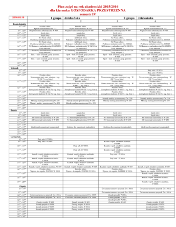 Plan zajęć na rok akademicki 2015/2016 dla kierunku GOSPODARKA PRZESTRZENNA semestr IV 1 grupa dziekańska 2016.03.15 2 grupa dziekańska 1 2 3 4 Przedm. obier. Rynek nieruchomości W 337 Projektowamie urbanistyczne W 409 Język obcy Język obcy X1 Przed. obier. Podstawy rachunkowości Ćw. OZ32A X1 Przed. obier. Podstawy rachunkowości Ćw. OZ32A X2 Podstawy rachunkowości W OZ125A ( tyg. parzyste ) X2 Podstawy rachunkowości W OZ125A ( tyg. parzyste ) Społ. – kult. uwarunk. gosp. przestrz. W 409 Społ. – kult. uwarunk. gosp. przestrz. W 409 Przedm. obier. Rynek nieruchomości W 337 Projektowamie urbanistyczne W 409 Język obcy Język obcy X1 Przed. obier. Podstawy rachunkowości Ćw. OZ32A X1 Przed. obier. Podstawy rachunkowości Ćw. OZ32A X2 Podstawy rachunkowości W OZ125A ( tyg. parzyste ) X2 Podstawy rachunkowości W OZ125A ( tyg. parzyste ) Społ. – kult. uwarunk. gosp. przestrz. W 409 Społ. – kult. uwarunk. gosp. przestrz. W 409 Przedm. obier. Rynek nieruchomości W 337 Projektowamie urbanistyczne W 409 Język obcy Język obcy X2 Przed. obier. Podstawy rachunkowości Ćw. OZ32A X2 Przed. obier. Podstawy rachunkowości Ćw. OZ32A X2 Podstawy rachunkowości W OZ125A ( tyg. parzyste ) X2 Podstawy rachunkowości W OZ125A ( tyg. parzyste ) Społ. – kult. uwarunk. gosp. przestrz. W 409 Społ. – kult. uwarunk. gosp. przestrz. W 409 Przedm. obier. Rynek nieruchomości W 337 Projektowamie urbanistyczne W 409 Język obcy Język obcy X2 Przed. obier. Podstawy rachunkowości Ćw. OZ32A X2 Przed. obier. Podstawy rachunkowości Ćw. OZ32A X2 Podstawy rachunkowości W OZ125A ( tyg. parzyste ) X2 Podstawy rachunkowości W OZ125A ( tyg. parzyste ) Społ. – kult. uwarunk. gosp. przestrz. W 409 Społ. – kult. uwarunk. gosp. przestrz. W 409 Przedm. obier. Nowoczesne met. zarz. miastem i reg. W OZ 7 ( wg. listy ) Przedm. obier. Nowoczesne met. zarz. miastem i reg. W OZ 7 ( wg. listy ) Przedm. obier. Zarządzanie kadrami W OZ 7 ( wg. listy ) Przedm. obier. Zarządzanie kadrami W OZ 7 ( wg. listy ) Proj. urb. I P 307A Proj. urb. I P 307A Przedm. obier. Nowoczesne met. zarz. miastem i reg. W OZ 7 ( wg. listy ) Przedm. obier. Nowoczesne met. zarz. miastem i reg. W OZ 7 ( wg. listy ) Przedm. obier. Zarządzanie kadrami W OZ 7 ( wg. listy ) Przedm. obier. Zarządzanie kadrami W OZ 7 ( wg. listy ) Metody analizy przestrzennej Ćw. 250 Metody analizy przestrzennej W 250 Metody analizy przestrzennej Ćw. 250 Metody analizy przestrzennej W 250 Poniedziałek 815 - 900 15 00 9 - 10 1015 - 1100 1115 - 1200 1215 - 1300 1315 - 1400 1415 - 1500 1515 - 1600 1615 - 1700 1715 - 1800 1815 - 1900 1915 - 2000 Wtorek 815 - 900 915 - 1000 1015 - 1100 1115 - 1200 1215 - 1300 1315 - 1400 1415 - 1500 1515 - 1600 1615 - 1700 1715 - 1800 1815 - 1900 1915 - 2000 Przedm. obier. Nowoczesne met. zarz. miastem i reg. W OZ 7 ( wg. listy ) Przedm. obier. Nowoczesne met. zarz. miastem i reg. W OZ 7 ( wg. listy ) Przedm. obier. Zarządzanie kadrami W OZ 7 ( wg. listy ) Przedm. obier. Zarządzanie kadrami W OZ 7 ( wg. listy ) Przedm. obier. Nowoczesne met. zarz. miastem i reg. W OZ 7 ( wg. listy ) Przedm. obier. Nowoczesne met. zarz. miastem i reg. W OZ 7 ( wg. listy ) Przedm. obier. Zarządzanie kadrami W OZ 7 ( wg. listy ) Przedm. obier. Zarządzanie kadrami W OZ 7 ( wg. listy ) Metody analizy przestrzennej W 250 Metody analizy przestrzennej Ćw. 250 Metody analizy przestrzennej W 250 Metody analizy przestrzennej Ćw. 250 Język obcy Język obcy X1 Samorząd terytorialny II W 250 X1 Samorząd terytorialny II W 250 Język obcy Język obcy X1 Samorząd terytorialny II W 250 X1 Samorząd terytorialny II W 250 Język obcy Język obcy X1 Samorząd terytorialny II W 250 X1 Samorząd terytorialny II W 250 Język obcy Język obcy X1 Samorząd terytorialny II W 250 X1 Samorząd terytorialny II W 250 Godzina dla organizacji studenckich Godzina dla organizacji studenckich Godzina dla organizacji studenckich Godzina dla organizacji studenckich Środa 815 - 900 915 - 1000 1015 - 1100 1115 - 1200 1215 - 1300 1315 - 1400 1415 - 1500 1515 - 1600 1615 - 1700 1715 - 1800 Czwartek 815 - 900 915 - 1000 Proj. urb. I P 309A Proj. urb. I P 309A 1015 - 1100 Proj. urb. I P 309A 1115 - 1200 Proj. urb. I P 309A 15 00 15 00 15 00 12 - 13 13 - 14 14 - 15 1515 - 1600 1615 - 1700 Kształt. współ. obiektów architekt. P 305A Kształt. współ. obiektów architekt. P 305A Kształt. współ. obiektów architekt. P 305A Kształt. współ. obiektów architekt. W 607 Przedm. obier. Wprow. do zagadn. INSPIRE W 303A Kształt. współ. obiektów architekt. P 307A Kształt. współ. obiektów architekt. P 307A Kształt. współ. obiektów architekt. P 307A Kształt. współ. obiektów architekt. W 607 Przedm. obier. Wprow. do zagadn. INSPIRE W 303A Kształt. współ. obiektów architekt. P 308A Kształt. współ. obiektów architekt. P 308A Kształt. współ. obiektów architekt. P 308A Proj. urb. I P 309A Proj. urb. I P 309A Kształt. współ. obiektów architekt. W 607 Przedm. obier. Wprow. do zagadn. INSPIRE W 303A 1715 - 1800 1815 - 1900 1915 - 2000 Kształt. współ. obiektów architekt. W 607 Przedm. obier. Wprow. do zagadn. INSPIRE W 303A Kształt. współ. obiektów architekt. P 308A Kształt. współ. obiektów architekt. P 308A Kształt. współ. obiektów architekt. P 308A Piątek 815 - 900 Ćwiczenia terenowe przyrod. Ćw. 303A Ćwiczenia terenowe przyrod. Ćw. 303A 15 Ćwiczenia terenowe przyrod. Ćw. 303A Ćwiczenia terenowe przyrod. Ćw. 303A 00 9 - 10 1015 - 1100 1115 - 1200 1215 - 1300 1315 - 1400 1415 - 1500 1515 - 1600 1615 - 1700 1715 - 1800 1815 - 1900 1915 - 2000 Ćwiczenia terenowe przyrod. Ćw. 303A Ćwiczenia terenowe przyrod. Ćw. 303A Ćwiczenia terenowe przyrod. Ćw. 303A Ćwiczenia terenowe przyrod. Ćw. 303A Zasady projekt. W 409 Zasady projekt. P 305A Zasady projekt. P 305A Zasady projekt. P 305A Zasady projekt. W 409 Zasady projekt. P 303A Zasady projekt. P 303A Zasady projekt. P 303A Zasady projekt. P 305A Zasady projekt.
