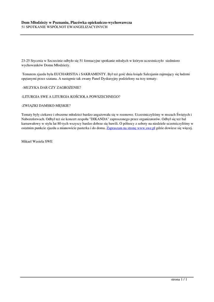 Dom Młodzieży w Poznaniu, Placówka opiekuńczo-wychowawcza 51 SPOTKANIE WSPÓLNOT EWANGELIZACYJNYCH 23-25 Stycznia w Szczecinie odbyło się 51 formacyjne spotkanie młodych w którym uczestniczyło siedmioro wychowanków Domu Młodzieży. Tematem zjazdu była EUCHARISTIA i SAKRAMENTY. Był też gość dnia ksiądz Salezjanin zajmujący się ludzmi opętanymi przez szatana. A następnie tak zwany Panel Dyskusyjny podzielony na trzy tematy: -MUZYKA DAR CZY ZAGROŻENIE? -LITURGIA SWE A LITURGIA KOŚCIOŁA POWSZECHNEGO? -ZWIĄZKI DAMSKO-MĘSKIE? Tematy były ciekawe i obszerne młodzież bardzo angażowała się w rozmowe. Uczestniczyliśmy w mszach Świętych i Nabożeństwach. Odbył też sie koncert zespołu "DIKANDA" zaproszonego przez organizatorów. Odbył się też bal karnawałowy w stylu lat 80-tych wszyscy bardzo dobrze się bawili. O północy z soboty na niedziele uczetniczyliśmy w ostatnim punkcie zjazdu a mianowicie pasterka i do domu. Zapraszam na stronę www.swe.pl gdzie dowiesz się więcej. Mikael Wasiela SWE strona 1 / 1