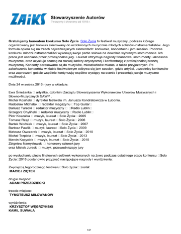 Gratulujemy laureatom konkursu Solo Życia Solo Życia to festiwal muzyczny, podczas którego organizowany jest konkurs skierowany do uzdolnionych muzycznie młodych solistów-instrumentalistów. Jego formuła opiera się na trzech najważniejszych elementach: konkursie, koncertach i jam session. Podczas konkursu młodzi instrumentaliści wykonują swoje partie solowe na dowolnie wybranym instrumencie. Ich praca jest oceniana przez profesjonalne jury. Laureat otrzymuje nagrody finansowe, instrumenty i akcesoria muzyczne, oraz uzyskuje szansę na rozwój kariery artystycznej i konfrontację z profesjonalną branżą muzyczną. Koncerty adresowane są do muzyków, mieszkańców miasta, a także przyjezdnych. Po zakończeniu koncertów w klubie festiwalowym odbywa się jam session, gdzie artyści, uczestnicy konkursów oraz zaproszeni goście wspólnie kontynuują wspólne występy na scenie i prezentują swoje muzyczne możliwości. Dnia 24 września.2016 r jury w składzie: Ewa Śnieżanka artystka, członkini Zarządu Stowarzyszenia Wykonawców Utworów Muzycznych i Słowno-Muzycznych SAWP , Michał Kosiński dyrektor festiwalu im. Janusza Kondratowicza w Luboniu. Radosław Michalak redaktor magazynu Top Guitar Dariusz Turecki redaktor muzyczny Radio Lublin Grzegorz Chyliński redaktor muzyczny Radio Lublin Piotr Koszałka muzyk, laureat Solo Życia 2005 Tomasz Rząd muzyk, laureat Solo Życia 2006 Bartek Woźniak muzyk, laureat Solo Życia 2007 Bartosz Pawlik muzyk, laureat Solo Życia 2009 Mateusz Owczarek muzyk, laureat Solo Życia 2010 Michał Trzpioła muzyk, laureat Solo Życia 2013 Marcin Kopyciok muzyk, laureat Solo Życia 2015 Zbigniew Namysłowski honorowy członek jury oraz Mietek Jurecki muzyk, przewodniczący jury po wysłuchaniu pięciu finałowych solówek wykonanych na żywo podczas ostatniego etapu konkursu Życia 2016 postanowiło przyznać następujące nagrody i wyróżnienia: Zwycięzcą tegorocznego festiwalu Solo życia MACIEJ ZIĘTEK został: drugie miejsce: ADAM PRZEZDZIECKI trzecie miejsce: TYMOTEUSZ MIŁOWANOW wyróżnienia: KRZYSZTOF WĘGRZYŃSKI KAMIL SUWAŁA 1/2 Solo Jury gratuluje finalistom wysokiego poziomu artystycznego i wierzy, że sukces osiągnięty w tegorocznym konkursie pomoże im w karierze profesjonalnego solisty instrumentalisty. http://solozycia.pl/aktualnosci/ Wszelkie prawa zastrzeżone 2017 ZAiKS / data wygenerowania strony 07.03.2017 14:13:55 PDF ze strony: http://www.zaiks.org.pl/1221,111,gratulujemy_laureatom_konkursu_solo_zycia 2/2