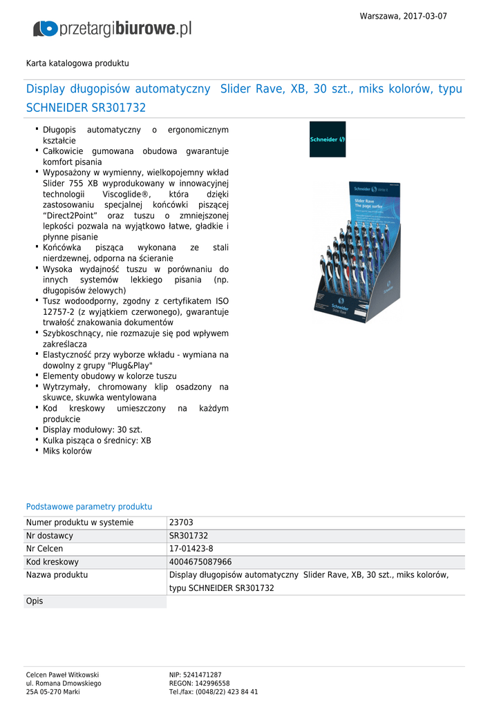 Warszawa, 2017-03-07 Karta katalogowa produktu Display długopisów automatyczny Slider Rave, XB, 30 szt., miks kolorów, typu SCHNEIDER SR301732 Długopis automatyczny o ergonomicznym kształcie Całkowicie gumowana obudowa gwarantuje komfort pisania Wyposażony w wymienny, wielkopojemny wkład Slider 755 XB wyprodukowany w innowacyjnej technologii Viscoglide®, która dzięki zastosowaniu specjalnej końcówki piszącej “Direct2Point” oraz tuszu o zmniejszonej lepkości pozwala na wyjątkowo łatwe, gładkie i płynne pisanie Końcówka pisząca wykonana ze stali nierdzewnej, odporna na ścieranie Wysoka wydajność tuszu w porównaniu do innych systemów lekkiego pisania (np. długopisów żelowych) Tusz wodoodporny, zgodny z certyfikatem ISO 12757-2 (z wyjątkiem czerwonego), gwarantuje trwałość znakowania dokumentów Szybkoschnący, nie rozmazuje się pod wpływem zakreślacza Elastyczność przy wyborze wkładu - wymiana na dowolny z grupy "Plug&Play" Elementy obudowy w kolorze tuszu Wytrzymały, chromowany klip osadzony na skuwce, skuwka wentylowana Kod kreskowy umieszczony na każdym produkcie Display modułowy: 30 szt. Kulka pisząca o średnicy: XB Miks kolorów Podstawowe parametry produktu Numer produktu w systemie 23703 Nr dostawcy SR301732 Nr Celcen 17-01423-8 Kod kreskowy 4004675087966 Nazwa produktu Display długopisów automatyczny Slider Rave, XB, 30 szt., miks kolorów, typu SCHNEIDER SR301732 Opis Celcen Paweł Witkowski ul. Romana Dmowskiego 25A 05-270 Marki NIP: 5241471287 REGON: 142996558 Tel./fax: (0048/22) 423 84 41 Warszawa, 2017-03-07 Długopis automatyczny o ergonomicznym kształcie; całkowicie gumowana Karta katalogowa produktu cd. obudowa gwarantuje komfort pisania; wyposażony w wymienny, wielkopojemny wkład Slider 755 XB wyprodukowany w innowacyjnej Display długopisów automatyczny Slider Rave, XB, zastosowaniu 30 szt., miks kolorów, technologii Viscoglide®, która dzięki specjalnej końcówkitypu SCHNEIDER SR301732 Kategoria Klasa piszącej “Direct2Point” oraz tuszu o zmniejszonej lepkości pozwala na wyjątkowo łatwe, gładkie i płynne pisanie; końcówka pisząca wykonana ze Długopisy stali nierdzewnej, odporna na ścieranie; wysoka wydajność tuszu w Standard Marka porównaniu SCHNEIDER do innych systemów lekkiego pisania (np. długopisów żelowych); tusz wodoodporny, zgodny z certyfikatem ISO 12757-2 (z Kolor wyjątkiem czerwonego), gwarantuje trwałość znakowania dokumentów; Kolor szybkoschnący, nie rozmazuje się pod wpływem zakreślacza; elastyczność Mix kolorów przy wyborze wkładu Cecha W ofercie od 2015-01 Produkt Długopis automatyczny Typ Display Wymiary Grubość linii (mm) XB Certyfikaty Certyfikaty, normy, patenty ISO 12757-2 Hit Standard Nowy produkt w ofercie Standard Wspólny słownik zamówień CPV 30192121-5 Długopisy kulkowe Jesteśmy przekonani, że z pomocą przetargibiurowe.pl usprawnicie Państwo własne procesy biznesowe związane ze żmudnym poszukiwaniem odpowiadających Państwu produktów oraz opracowaniem specyfikacjii zapytań ofertowych. Serdecznie zapraszamy do wspópracy Zespół, PrzetargiBiurowe.pl Celcen Paweł Witkowski ul. Romana Dmowskiego 25A 05-270 Marki NIP: 5241471287 REGON: 142996558 Tel./fax: (0048/22) 423 84 41