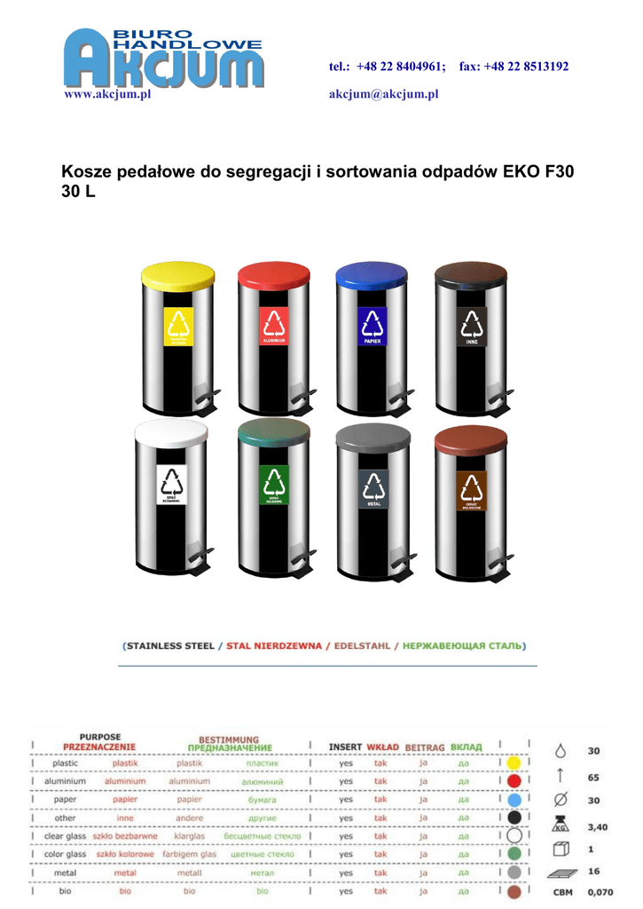 tel.: +48 22 8404961; www.akcjum.pl fax: +48 22 8513192 [email protected] Kosze pedałowe do segregacji i sortowania odpadów EKO F30 30 L