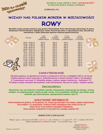 KOMISJA ZAKŁADOWA NSZZ „SOLIDARNOŚĆ” W POLITECHNICE WROCŁAWSKIEJ ZAPRASZA NA WCZASY NAD POLSKIM MORZEM W MIEJSCOWOŚCI ROWY Niewielka osada rybacka położona przy granicy Słowińskiego Parku Narodowego-zaliczonego do grona Światowych Parków Biosfery. Największym atutem Rowów jest jedna z najczystszych plaż, specyficzny mikroklimat, a także doskonałe zaplecze hotelowo-gastronomiczne. 1,2os. w pokoju z pełnym wyżyw. Turnusy 30.05 - 05.06.10 05.06 - 12.06.10 12.06 - 19.06.10 19.06 - 26.06.10 26.06 - 03.07.10 03.07 - 10.07.10 10.07 - 17.07.10 17.07 - 24.07.10 24.07 - 31.07.10 31.07 - 07.08.10 07.08 - 14.08.10 14.08 - 21.08.10 21.08 - 28.08.10 28.08 - 04.09.10 04.09 - 11.09.10 540 zł 540 zł 540 zł 710 zł 710 zł 710 zł 790 zł 790 zł 790 zł 790 zł 790 zł 710 zł 540 zł 540 zł 540 zł 1,2 os. w pokoju z 1/2 wyżyw. 500 zł 500 zł 500 zł 670 zł 670 zł 670 zł 670 zł 670 zł 670 zł 670 zł 670 zł 670 zł 500 zł 500 zł 500 zł 3,4 os. w pokoju z pełnym wyżyw. 420 zł 420 zł 420 zł 490 zł 490 zł 490 zł 570 zł 570 zł 570 zł 570 zł 570 zł 490 zł 420 zł 420 zł 420 zł 3,4 os. w pokoju z 1/2 wyzyw. 400 zł 400 zł 400 zł 450 zł 450 zł 450 zł 530 zł 530 zł 530 zł 530 zł 530 zł 450 zł 400 zł 400 zł 400 zł ZAKWATEROWANIE Ośrodek położony na ogrodzonym terenie o powierzchni 2,5 ha, w odległości 400 m od morza (dojście pięknym lasem sosnowym). Zakwaterowanie w dwóch blokach, każdy z 32 pokojami 2, 3-osobowymi oraz salą TV. Wszystkie pokoje z pełnym węzłem sanitarnym , balkonem i TV. W każdym pokoju wersalka dwuosobowa i sofa dwuosobowa. Gdy są 3,4 osoby - wspólne spanie. ŚWIADCZENIA Wyżywienie: trzy razy dziennie w stołówce ośrodka. Świadczenia rozpoczynają się kolacją , kończą obiadem. Do dyspozycji gości: boiska do piłki nożnej, mini koszykówki, siatkówki, plac zabaw, stoły tenisowe, gry zręcznościowe, wypożyczalnia rowerów, sala TV. DODATKOWE INFORMACJE Doba hotelowa od godziny 14 do godziny 10. Przyjmują zwierzęta. Na miejscu opłata meldunkowa. Cena pobytu z ½ wyżywienia i osobnym łóżku obowiązuje tylko dzieci do lat 10 Dzieci do lat 3 bez żadnych świadczeń bezpłatnie. Cena zawiera: wyżywienie 3 razy dziennie, noclegi, podatek VAT. SERDECZNIE ZAPRASZAMY Wpłaty i zapisy w sekretariacie KZ NSZZ „Solidarność” pok. 120 (bud. A – 1) w godz. 800 – 1500; nr telefonu 320-26-93. Opłata manipulacyjna: członkowie związku – 2 zł, pozostałe osoby – 8 zł. Wrocław, 25 maj 2010 r. Wiceprzewodnicząca KZ NSZZ „Solidarność” w Politechnice Wrocławskiej Jadwiga Szymonik
