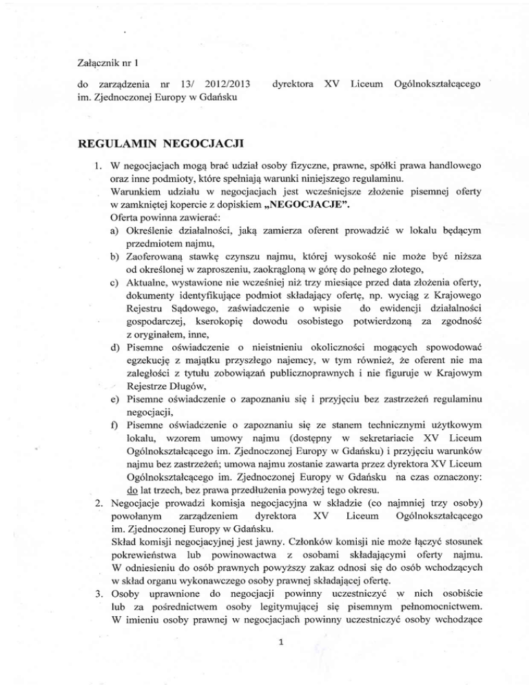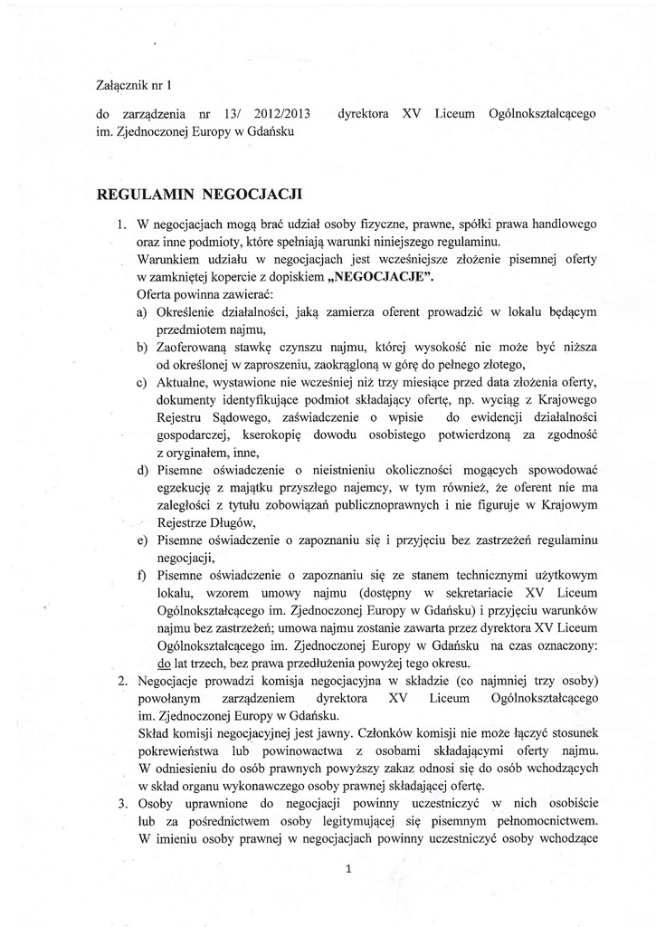 Zalqczniknr 1 zarz4dzenia nr I3l 201212013 dyrektora im. Zjednoczonej Europy w Gdarisku do XV Liceum Og6lnoksztalcqcego REGULAMIN NEGOCJACJI t. W negocjacjach mog4 bra1 udziat osoby frzyczne, prawne, sp6lki prawa handlowego oraz inne podmioty, kt6re spelniaj4 warunki niniejszego regulaminu. Warunkiem udzialu w negocjacjach jest wczeSniejsze zlohenie pisemnej oferty w zamknigtej kopercie z dopiskiem,,NEGOCJACJE". Oferta powinna zawiercl : a) OkreSlenie dzialalnofic| jak4 zamierza oferent prowadzil w lokalu bgd4cym przedmiotem najmu, b) Zaoferowarr4 c) d) ' stawkg czynszu najmu, kt6rej wysokoSd nie moZe by6 niAsza od okreSlonej w zaproszeniu, zaol<r4glon4 w 9619 do pelnego zlotego, Aktualne, wystawione nie wczeSniej niZ trzy miesi4ce przed data z-loAenia oferty, dokumenty identyfikuj4ce podmiot skladaj4cy ofertg, np. wyci4g z Krajowego Rejestru S4dowego, zalwiadczenie o wpisie do ewidencji dzialalnoSci gospodarczej, kserokopig dowodu osobistego potwierdzon4 za zgodnoSd z oryginaNem, inne, Pisemne o5wiadczenie o nieistnieniu okolicznoSci mog4cych spowodowa6 egzekucjg z maj4tku przyszlego najemcy, w tym r6wnie2, 2e oferent nie ma zalegNoSci z tyiilu zobowi4zan publicznoprawnych i nie figuruje w Krajowym Rejestrze Dlug6w, Pisemne oSwiadczenie o zapoznaniu sig i przyjgciu bez zaslrzeLef regulaminu negocjacji, 0 Pisemne oSwiadczenie o zapoznaniu sig ze stanem technicznymi uZytkowym lokalu, wzorem umowy najmu (dostgpny w sekretariacie XV Liceum Og6lnoksztalc4cego im. Zjednoczonej Europy w Gdarisku) i przyjgciu warunk6w najmu bezzaslrzeZeri; umowa najmu zostanie zawartaptzez dyrektora XV Liceum Og6lnoksztalc4cego im. Zjednoczonej Europy w Gdarisku na czas oznaczony: do lat trzech,bezprawaprzedluhenia powyZej tego okresu. 2. Negocjacje prowadzi komisja negocjacyjna w sktadzie (co najmniej trzy osoby) powolanym zarzqdzeniem dyrektora XV Liceum Og6lnoksztaLcqcego im. Zjednoczonej Europy w Gdarisku. Sklad komisji negocjacyjnej jest jawny. Czlonk6w komisji nie moZe lEczy1 stosunek pokrewieristwa lub powinowactwa z osobami skladaj4cymi oferty najmu. W odniesieniu do os6b prawnych powyzszy zakaz odnosi sig do os6b wchodzqcych w sklad organu wykonawczego osoby prawnej skladaj4cej ofertg. a J. Osoby uprawnione do negocjacji powinny uczestniczy6 w nich osobiScie lub za po5rednictwem osoby legitymuj4cej sig pisemnym pelnomocnictwem. W imieniu osoby prawnej w negocjacjach powinny uczestniczyi osoby wchodz4ce e) w sklad organ6w zarzqdzajqcych lub pelnomocnicy ustanowieni ptzez te osoby wzglgdnie prokurenci. jednej Uprawniony do negocjacji moZe w ich trakcie korzystad z niezbEdnej pomocy osoby trzeciej, tzw. doradcY. 4. Obowi4zek udowodnienia okolicznoSci uprawniajqcych dany podmiot do negocjacji spoczywa na tym podmiocie Dow6d uprawniaj4cy do negocjacji powinien zostac i ne g o cj acyj nej pr ze d r ozp o czT ciem ne go cj acj i. W uzasadnionych przypadkach termin negocjacji na wniosek uprawnionego mohe pr ze dLoaony komi 5. sj zostac przesunigty na inny okreSlony termin. Niestawienie sig na negocjacje powoduje utratg prawa umowy najmu. 7. Z przebiegu negocjacji spisuje sig protok6l, kt6ry podpisuj4 czlonkowie komisji oraz osoby uprawnione do uczestnictwa w negocjacjach .JeZeli okreslona osoba uprawniona do negocjacji nie chce lub nie moae zlotyt podpisu, w6wczas 6. przewodni czEcy komisji stwierdza ten fakt w protokole' 8. Osoba uprawniona do negocjacji, kt6ra podpisala protok6l, ma prawo otrzymal iego jedn4 kopig. 9 W trakcie negocjacji komisja negocjacyjna respektuje zapisy Uchwaly Nr XXXIVlI045l05 Rady Miasta Gdariska z dnia 13 stycznia 2005 roku w sprawie zasad gospodarowania zasobem komunalnych lokali u|ytkowych, czynsz1w i ich platnoici oraz podzialu Miasta Gdariska na sfery czynszowe zpolnieiszymi zmianani ( tekst jednolity Dziennik Urzgdowy Woj. Pomorskiego z 2012r., poz. 553, zm.w 2014r., poz. 3203 ), ponadto uwzglgdnia wszystkie okolicznoSci niezbqdne do ustalenia ostatecznej wysokoSci stawki czynszu najmu, m. in. PoloZenie lokalu, jego powierzchnig i wyposaZenie, rodzaj dzialalnoSci proponowanei przez oferenta oraz, cerry na rynku zaanalogiczne uslugi Swiadczone w podobnych warunkach. 10. JeZeli co najmniej dwie osoby sE uprawnione do zawatcia umowy w drodze negocjacji, komisja dokonuje spoSr6d nich wyboru najemcy na podstawie oferty uwzglgdniaj qc caloksztalt okolicznoSci istotnych dla najmu danego lokalu (m. in. proponowanqbranhE, zatrudnienie dodatkowych os6b, proponowan4 w ofercie stawkq czynszv, zakres prac.adaptacyjnych itp.; jesli oferty co najmniej dw6ch os6b uznane za r6wnorzgdne, w6wczas wyboru przyszNego najemcy dokonuje komisja w drodze wewngtrznego glosowania. 11.Osobie uprawnionej do negocjacji przysluguje prawo do odwolania sig od ustalefr komisji. Odwolanie sklada sig. na piSmie naip62niej w nastqpuj4cym dniu po negocjacjach przez dyrektora XV Liceum Og6lnoksztalc4cego im. Zjednoczonej Europy w Gdarisku do Prezydenta Miasta Gdariska, kt6ry mohe nakaza( b4dL odm6wi6 powt6rzenia negocjacji. W razie uznania racji odwoluj4cego sig Prezydent Miasta Gdariska nakazuje powt6rzenie negocjacji z udzialem tych samych os6b uprawnionych do negocj acj i. 12. JeSli nie wniesiono odwolania od ustalet'r komisji negocjacyjnej, w6wczas stajQ sig one wi424ce. 13. po zakoiczeniu procedury negocjacyjnej dyrektor XV Liceum Og6lnoksztalc4cego im. Zjednoczonej Europy w Gdarisku wzywa wybrany ptzez komisjq negocjacyjn4 podmiot do podpisania umowy najmu. Odmowa podpisania umowy skutkuje uniewaZnieniem procedury i wykluczeniem oferenta na rok z postEpowari negocjacyjnych. 14. Niniejszy rcgtlamin zostal zatwierdzony zarz4dzeniem nr 131 201212013 dyrektora XV Liceum Og6lnoksztaLc4cego im. Zjednoczonej Europy w Gdarisku zdnia 3 stycznia 20I3r. 15. Niniejszy regulamin jest dostgpny w siedzibie XV Liceum Og6lnoksztaNcqcego im. Zjednoczonej Europy w Gdansku w sekretariacie oraz na stronie intemetowej szkoly.