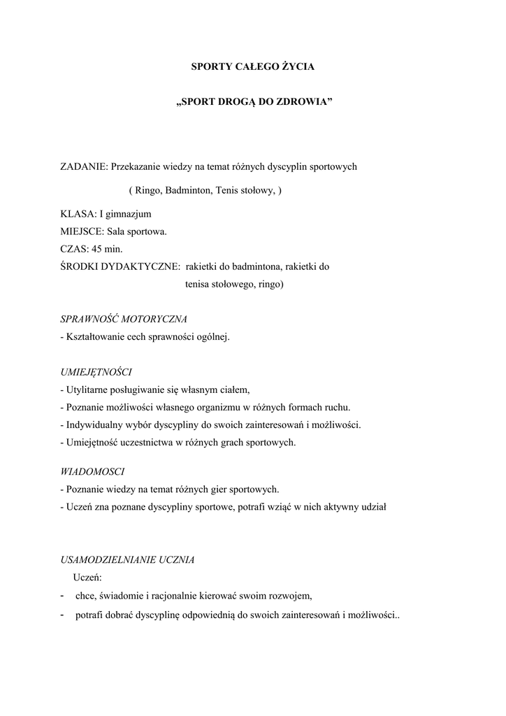 SPORTY CAŁEGO ŻYCIA „SPORT DROGĄ DO ZDROWIA” ZADANIE: Przekazanie wiedzy na temat różnych dyscyplin sportowych ( Ringo, Badminton, Tenis stołowy, ) KLASA: I gimnazjum MIEJSCE: Sala sportowa. CZAS: 45 min. ŚRODKI DYDAKTYCZNE: rakietki do badmintona, rakietki do tenisa stołowego, ringo) SPRAWNOŚĆ MOTORYCZNA - Kształtowanie cech sprawności ogólnej. UMIEJĘTNOŚCI - Utylitarne posługiwanie się własnym ciałem, - Poznanie możliwości własnego organizmu w różnych formach ruchu. - Indywidualny wybór dyscypliny do swoich zainteresowań i możliwości. - Umiejętność uczestnictwa w różnych grach sportowych. WIADOMOSCI - Poznanie wiedzy na temat różnych gier sportowych. - Uczeń zna poznane dyscypliny sportowe, potrafi wziąć w nich aktywny udział USAMODZIELNIANIE UCZNIA Uczeń: - chce, świadomie i racjonalnie kierować swoim rozwojem, - potrafi dobrać dyscyplinę odpowiednią do swoich zainteresowań i możliwości.. Scenariusz zajęć. 1. Część wstępna Powitanie, przedstawienie tematu zajęć. - Pokaz, krótka prezentacja multimedialna na temat dyscyplin sportowych omawianych na dzisiejszej lekcji. Pogadanka dla uczniów o możliwości uprawiania aktywność fizycznej od najmłodszych lat aż do wieku dojrzałego. Rozgrzewka: I.ĆWICZENIA MIĘŚNI RAMION: – obustronne krążenie ramion: na zewnątrz, do wewnątrz; – naprzemianstronne krążenie ramion ( jedna osoba krążenie w przód , druga w tył); - jedna osoba , stojąc, trzyma za stawy skokowe drugą , leżącą w podporze przodem i wykonuje ugięcia i wyprosty ramion. II.ĆWICZENIA MIĘŚNI NÓG: - w ustawieniu przodem do siebie , trzymając się za ręce, o tułowiu odchylonym do tyłu ,ćwiczący wykonują przysiady; - stojąc naprzeciw siebie , ramiona w chwycie skrzyżnym , ćwiczący poruszają się w prawo i w lewo krokiem odstawno- dostawnym; - ćwiczący naprzeciw siebie podają sobie prawe ( lewe ) nogi i prawe (lewe ) ręce , następnie wykonują podskoki w dowolnym kierunku; - w ustawieniu jeden za drugim osoba z tyłu trzyma partnera za ręce , oporując jego bieg do przodu z wysokim unoszeniem kolan; III.ĆWICZENIA MIĘŚNI TUŁOWIA: - ćwiczący ustawieni tyłem do siebie , trzymając się za RR wzniesione w bok i wykonują skłony tułowia w prawa i lewa stronę – skłon tułowia w lewa stronę , wykonany ze skrętem i z jednoczesnym przeniesieniem prawej ręki do lewej stopy; - w ustawieniu przodem do siebie i RR opartych o barki współćwiczącego, wykonujemy skłony tułowia w przód z pogłębieniem; - jeden z ćwiczących wykonuje siad rozkroczny drugi ustawia się za jego plecami i opierając RR o jego łopatki pogłębia wykonanie skłonu do przodu IV ĆWICZENIA MIĘŚNI BRZUCHA: - jeden z ćwiczących w leżeniu tyłem o NN ugiętych i RR ułożonych wzdłuż T wykonuje skłony T w przód , natomiast drugi opiera ręce o jego stopy; - współćwiczący znajduje się w klęku podpartym , natomiast partner siada na jego biodrach i podkładając stopy pod jego ręce wykonuje opady i wznosy T; - ćwiczący stojąc , obejmuje RR partnera za biodra , który oplata nogami jego biodra w ustawieniu przodem do siebie i wykonuje opady i wznosy T. V.ĆWICZENIA ROZCIĄGAJĄCE: - jeden z ćwiczących trzyma stopę odwiedzionej nogi partnera ustawionego bokiem do niego i wykonuje ostrożne wznosy; - ćwiczący w ustawieniu tyłem do siebie , trzymają się za ręce wzniesione do góry , jeden z nich wykonuje półprzysiad i w lekkim skłonie T w przód rozciąga partnera na plecach; - jeden z ćwiczących wykonuje siad prosty wznosząc RR w bok, natomiast drugi stojąc z tyłu opiera kolano o jego plecy i pociąga RR do tyłu; 2. Część główna Podział klasy na trzy grupy, uczniowie zajmują stanowiska: Pierwsza grupa – ringo. Grupa na części Sali sportowej na boisku do piłki siatkowej uczestniczy w meczu ringo. Przed rozpoczęciem meczu jeden uczeń z grupy referuje przygotowaną wcześniej przez wyznaczone osoby informację i ciekawostki na temat gry. Druga grupa – tenis stołowy, a trzecia grupa - badminton. Założenia dla grup 2 i 3 identyczne jak w przypadku grupy1. Po zakończeniu gry na danym stanowisku następuje przejście na następne stanowisko zgodnie z podanym przez nauczyciela kierunkiem. 3. Część końcowa Ćwiczenia uspokajające: - marsz na zew. i wew. krawędziach stóp - długie nabieranie powietrza nosem i wydychanie ustami - w marszu wznos ramion połączony z wdechem , następnie skłon tułowia w przód połączony z wydechem. - Zbiórka, podsumowanie zajęć, wyróżnienie dla najlepszych uczniów, zebranie sprzętu, pożegnanie.