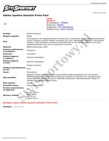 Informacje o produkcie Utworzono 07-03-2017 Adidas Spodnie Damskie Prime Pant Cena : 99,99 zł Nr katalogowy : Z29041 Producent : Adidas Dostępność : Na zamówienie Średnia ocena : brak recenzji Spodnie Damskie Długość nogawki: Długie Krój: Krój regularny czyli najpopularniejszy krój klasyczny, codziennego użytku. Najczęściej spotykany na ulicy. Pasujący zarówno osobom szczupłym, jak i tym o pełniejszych kształtach. Do produkcji odzieży o kroju normalnym używane są wszystkie tkaniny. Na wieszaku modele w tym kroju wyglądają dokładnie tak, jak na to wskazuje ich rozmiar. Materiał: Włókno poliestrowe 100% Systemy zastosowane w produktcie: ClimaLite+ Kieszenie: 2 kieszenie Rodzaj ściągacza w nogawce: Sznurek materiałowy Rodzaj ściągacza w pasie: Sznurek materiałowy or to w y. pl Produkt: Ściągacz gumowy Kolekcja zaprojektowana 2013 na rok: Wiosna/Lato Opis produktu: Wygodne spodnie idealnie nadające się do sportów ogólnorozwojowych jak i do rekreacji. Zastosowanie tkanin i materiałów syntetycznych sprawia, że tworzywo nie rozciąga się, jest wytrzymałe oraz odporne na zużycie. Materiały zastosowane odprowadzają pot i wilgoć na zewnątrz, są również szybko schnące. Kolor główny: Pozostałe kolory: Czarny Szary i jego odcienie M St y Rozmiar prezentowany na zdjęciach: lS p Sezon: Wymiary modela: wzrost: 174 cm biust: 90 cm pas: 62 cm biodra: 90 cm Dostępne opcje Adidas Spodnie Damskie Prime Pant Rozmiar: L, XL, XS, M, S. Wygenerowano w programie www.oscGold.com