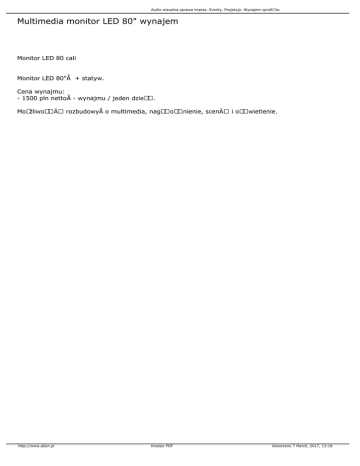 Audio wizualna oprawa imprez. Eventy. Projekcje. Wynajem sprzÄ™tu Multimedia monitor LED 80" wynajem Monitor LED 80 cali Monitor LED 80" + statyw. Cena wynajmu: - 1500 pln netto - wynajmu / jeden dzieÅ„. MoÅźliwość rozbudowy o multimedia, nagÅ‚oÅ›nienie, scenÄ™ i oÅ›wietlenie. http://www.ation.pl Kreator PDF Utworzono 7 March, 2017, 13:18