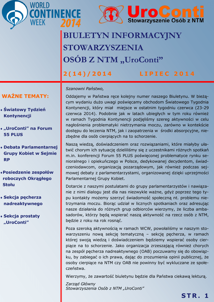 BIULETYN INFORMACYJNY STOWARZYSZENIA OSÓB Z NTM „UroConti” 2(14)/2014 LIPIEC 2014 Szanowni Państwo, WAŻNE TEMATY: Światowy Tydzień Kontynencji „UroConti” na Forum 55 PLUS Debata Parlamentarnej Grupy Kobiet w Sejmie RP Posiedzenie zespołów roboczych Okrągłego Stołu Sekcja pęcherza nadreaktywnego Sekcja prostaty „UroConti” Oddajemy w Państwa ręce kolejny numer naszego Biuletynu. W bieżącym wydaniu dużo uwagi poświęcamy obchodom Światowego Tygodnia Kontynencji, który miał miejsce w ostatnim tygodniu czerwca (23-29 czerwca 2014). Podobnie jak w latach ubiegłych w tym roku również w ramach Tygodnia Kontynencji podjęliśmy szereg aktywności w celu nagłośnienia problematyki nietrzymania moczu, zarówno w kontekście dostępu do leczenia NTM, jak i zaopatrzenia w środki absorpcyjne, niezbędne dla osób cierpiących na to schorzenie. Naszą wiedzą, doświadczeniem oraz rozwiązaniami, które miałyby ułatwić chorym ich sytuację dzieliliśmy się z uczestnikami różnych spotkań m.in. konferencji Forum 55 PLUS poświęconej problematyce rynku senioralnego i opiekuńczego w Polsce, dedykowanej decydentom, świadczeniodawcom, organizacją pozarządowym, jak również podczas sejmowej debaty z parlamentarzystami, organizowanej dzięki uprzejmości Parlamentarnej Grupy Kobiet. Dotarcie z naszymi postulatami do grupy parlamentarzystów i nawiązanie z nimi dialogu jest dla nas niezwykle ważne, gdyż poprzez tego typu kontakty możemy szerzyć świadomość społeczną nt. problemu nietrzymania moczu. Biorąc udział w licznych spotkaniach oraz adresując nasze działania do różnych grup odbiorców wierzymy, że liczba ambasadorów, którzy będą wspierać naszą aktywność na rzecz osób z NTM, będzie z roku na rok rosnąć. Poza szeroką aktywnością w ramach WCW, powołaliśmy w naszym stowarzyszeniu nową sekcję tematyczną – sekcję pęcherza, w ramach której swoją wiedzą i doświadczeniem będziemy wspierać osoby cierpiące na to schorzenie. Jako organizacja zrzeszającą również chorych na zespół pęcherza nadreaktywnego (OAB) poczuwamy się do obowiązku, by zabiegać o ich prawa, dając do zrozumienia opinii publicznej, że osoby cierpiące na NTM czy OAB nie powinny być wykluczane ze społeczeństwa. Wierzymy, że zawartość biuletynu będzie dla Państwa ciekawą lekturą. Zarząd Główny Stowarzyszenia Osób z NTM „UroConti” STR. 1 Światowy Tydzień Kontynencji (23-29/06/2014) po raz szósty w Polsce W tym roku już po raz szósty obchodziliśmy w Polsce Światowy Tydzień Kontynencji (WCW – World Continmence Week) – wydarzenie zainicjowane przez Międzynarodowe Towarzystwo Kontynencji (ICS – Inernational Continence Society), którego celem jest nagłaśnianie problematyki nietrzymania moczu oraz przełamanie tabu, jakie wiąże się z tym problemem. Podejmowane w tym czasie działania mają również zwiększyć zainteresowanie problematyką NTM decydentów oraz media. W trakcie tegorocznego Tygodnia, nasze Stowarzyszenie podjęło się organizacji szeregu działań poświęconych problematyce nietrzymania moczu. Wśród nich znalazły się: udział w konferencji poświęconej rynkowi senioralnemu i opiekuńczemu Forum 55 PLUS, które odbyło się w Konstancinie. W gronie prelegentów Forum znalazła się również prezes naszego stowarzyszenia - Anna Sarbak, która przybliżała uczestnikom problematykę nietrzymania moczu, podkreślając iż stanowi ona poważny problem w opiece długoterminowej nad osobami niesamodzielnymi i przewlekle chorymi. W ramach Światowego Tygodnia Kontynencji, na naszą prośbę, w Sejmie RP została również zorganizowana debata poświęcona problematyce chorych na zespół pęcherza nadreaktywnego (OAB – overactive bladder) w Polsce. Ponadto, pod auspicjami światowej federacji zrzeszającej organizacje osób z NTM (WFIP – World Federation of Incontinent Patients), we współpracy z naszym stowarzyszeniem, powstał raport „Pacjent z NTM w systemie opieki zdrowotnej 2014”, w którym zaprezentowano aktualne dane nt. dostępności do leczenia NTM, kosztów zaopatrzenia w środki absorpcyjne dla osób z NTM oraz dane dotyczące sytuacji w opiece długoterminowej związanej z opieką nad osobami z NTM w Polsce. 2(14)/2014 STR. 2 Światowy Tydzień Kontynencji (23-29/06/2014) po raz szósty w Polsce c.d. Ponadto, jak co roku, zorganizowaliśmy szereg aktywności dedykowanych osobom z NTM. W Gdańsku, Łodzi, Lublinie, Poznaniu, Warszawie oraz Wrocławiu odbyły się bezpłatne konsultacje lekarskie, wykłady edukacyjne oraz warsztaty z ćwiczeniami mięśni Kegla. Łączenie, we wszystkich aktywnościach Światowego Tygodnia Kontynencji, wzięło udział ok. 500 osób. Otwarte, bezpłatne warsztaty z ćwiczeniami mięśni Kegla w Gdańsku Szeroko rozpisywały się o nas media. Informacje na temat Światowego Tygodnia Kontynencji ukazały się w kilku ogólnopolskich tytułach m.in.: w Rzeczpospolitej oraz Gazecie Wyborczej czy Dzienniku Polskim. O naszej aktywności, w ramach WCW, można było również przeczytać w prasie regionalnej t.j. Dziennik Łódzki, Głos Pomorza, Polska Głos Wielkopolski, Express Bydgoski, jak również na wielu portalach internetowych zarówno tych ogólnopolskich, jak i regionalnych. 2(14)/2014 STR. 3 „UroConti” na Forum 55 PLUS 17. czerwca br. w podwarszawskim Konstancinie odbyła się konferencja Forum 55 PLUS – Kierunki rozwoju rynku senioralnego w Polsce. Spotkanie było poświęcone problematyce rozwoju rynku senioralnego i opiekuńczego w naszym kraju, jak również próbą nagłośnienia problemów, z jakimi obecnie boryka się system opieki długoterminowej w Polsce. Konferencja była doskonałą okazją do zaprezentowania międzynarodowych doświadczeń w obszarze opieki długoterminowej polskim świadczeniodawcom, decydentom oraz przedstawicielom organizacji działających na rzecz osób przewlekle chorych, niesamodzielnych oraz sen
