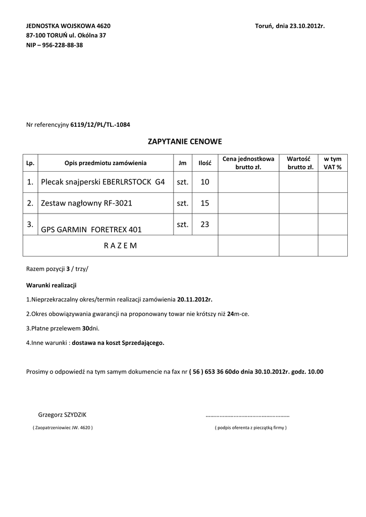 JEDNOSTKA WOJSKOWA 4620 87-100 TORUŃ ul. Okólna 37 NIP – 956-228-88-38 Toruń, dnia 23.10.2012r. Nr referencyjny 6119/12/PL/TL.-1084 ZAPYTANIE CENOWE Lp. Opis przedmiotu zamówienia Jm Ilość 1. Plecak snajperski EBERLRSTOCK G4 szt. 10 2. Zestaw nagłowny RF-3021 szt. 15 3. szt. 23 GPS GARMIN FORETREX 401 Cena jednostkowa brutto zł. Wartość brutto zł. RAZEM Razem pozycji 3 / trzy/ Warunki realizacji 1.Nieprzekraczalny okres/termin realizacji zamówienia 20.11.2012r. 2.Okres obowiązywania gwarancji na proponowany towar nie krótszy niż 24m-ce. 3.Płatne przelewem 30dni. 4.Inne warunki : dostawa na koszt Sprzedającego. Prosimy o odpowiedź na tym samym dokumencie na fax nr ( 56 ) 653 36 60do dnia 30.10.2012r. godz. 10.00 Grzegorz SZYDZIK ( Zaopatrzeniowiec JW. 4620 ) ……………………………………………… ( podpis oferenta z pieczątką firmy ) w tym VAT %