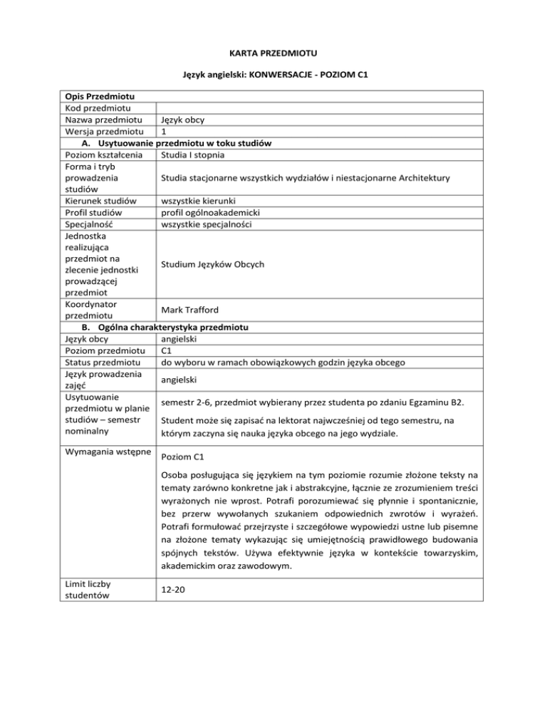 KARTA PRZEDMIOTU Język angielski: KONWERSACJE