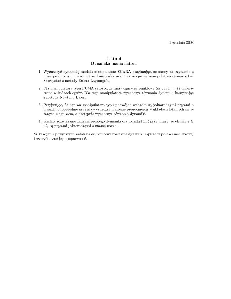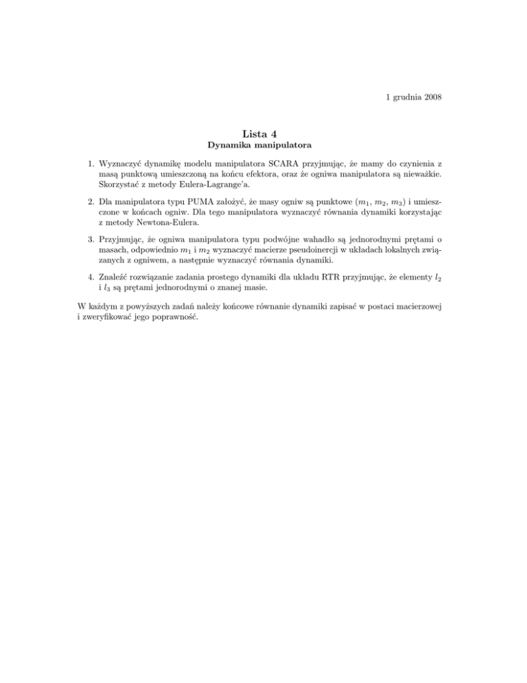 1 grudnia 2008 Lista 4 Dynamika manipulatora 1. Wyznaczyć dynamikę modelu manipulatora SCARA przyjmując, że mamy do czynienia z masą punktową umieszczoną na końcu efektora, oraz że ogniwa manipulatora są nieważkie. Skorzystać z metody Eulera-Lagrange’a. 2. Dla manipulatora typu PUMA założyć, że masy ogniw są punktowe (m1 , m2 , m3 ) i umieszczone w końcach ogniw. Dla tego manipulatora wyznaczyć równania dynamiki korzystając z metody Newtona-Eulera. 3. Przyjmując, że ogniwa manipulatora typu podwójne wahadło są jednorodnymi prętami o masach, odpowiednio m1 i m2 wyznaczyć macierze pseudoinercji w układach lokalnych związanych z ogniwem, a następnie wyznaczyć równania dynamiki. 4. Znaleźć rozwiązanie zadania prostego dynamiki dla układu RTR przyjmując, że elementy l2 i l3 są prętami jednorodnymi o znanej masie. W każdym z powyższych zadań należy końcowe równanie dynamiki zapisać w postaci macierzowej i zweryfikować jego poprawność.
