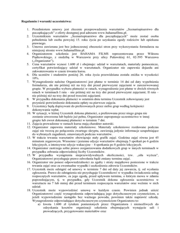 Regulamin i warunki uczestnictwa: 1. Przedmiotem umowy jest zlecenie przeprowadzenia warsztatów „Scenariopisarstwo dla początkujących” z oferty dostępnej pod adresem www.bahamafilms.pl. 2. Uczestnikiem warsztatów „Scenariopisarstwo dla początkujących” może zostać osoba pełnoletnia lub osoba powyżej 15. roku życia po uzyskaniu zgody rodziców lub opiekuna prawnego. 3. Umowa zawierana jest bez jednoczesnej obecności stron przy wykorzystaniu formularza na niniejszej stronie www.bahamafilms.pl. 4. Organizatorem szkolenia jest BAHAMA FILMS reprezentowana przez Wiktora Piątkowskiego, z siedzibą w Warszawie przy ulicy Puławskiej 61, 02-595 Warszawa („Organizator”). 5. Cena warsztatów wynosi 1.600 zł i obejmuje: udział w warsztatach, materiały pomocnicze, certyfikat potwierdzający udział w warsztatach. Organizator nie zapewnia dojazdu ani zakwaterowania w czasie trwania kursu. 6. Dla uczniów i studentów poniżej 26. roku życia przewidziana została zniżka w wysokości 10%. 7. Wynagrodzenie należne Organizatorowi jest płatne w terminie 14 dni od daty wypełnienia formularza, ale nie później niż na trzy dni przed pierwszymi zajęciami w zarezerwowanej grupie. W przypadku wyboru płatności w ratach, wynagrodzenie jest płatne w dwóch równych ratach w terminach I rata – nie później niż na trzy dni przed pierwszymi zajęciami; II rata – nie później niż na trzy dni przed trzecimi zajęciami. 8. W przypadku dokonania płatności w ostatnim dniu terminu Uczestnik zobowiązany jest przynieść potwierdzenie dokonania opłaty na pierwsze zajęcia. 9. Uczestnicy będą dopisywani do preferowanych przez siebie grup według kolejności dokonywania wpłat. 10. W sytuacji, w której Uczestnik dokona płatności, a preferowana przez niego grupa nie zostanie utworzona lub będzie już pełna, Organizator zaproponuje uczestnictwo w innej grupie lub zwrot dokonanej płatności w terminie 7 dni. 11. Zajęcia prowadzone w ramach kursu mają charakter autorski. 12. Organizator zapewnia materiały szkoleniowe. Materiały szkoleniowe rozdawane podczas zajęć nie tworzą po połączeniu zwartego skryptu, zawierają jedynie informacje uzupełniające do wybranych zagadnień, omawianych podczas warsztatów. 13. W trakcie trwania warsztatów obowiązuje stały grafik zajęć. Godzina zajęć równa jest 45 minutom zegarowym. Wiosenne i jesienne edycje warsztatów obejmują 5 spotkań po 6 godzin lekcyjnych, a intensywne edycje wakacyjne – 4 spotkania po 8 godzin lekcyjnych. 14. Organizator zastrzega sobie prawo zorganizowania dodatkowych grup w innych terminach w przypadku zebrania odpowiedniej liczby Uczestników. 15. W przypadku wystąpienia nieprzewidywalnych okoliczności, tzw. „siła wyższa”, Organizatorowi przysługuje prawo odwołania bądź zmiany terminu zajęć. 16. Organizator nie ponosi odpowiedzialności za zguby i straty majątkowe poniesione w trakcie trwania zajęć oraz za ewentualne wypadki i uszkodzenia zdrowia Uczestników. 17. Uczestnik może odstąpić od umowy w terminie 7 dni od daty jej zawarcia, tj. od wysłania zgłoszenia. Prawo do odstąpienia nie przysługuje Uczestnikowi w wypadku świadczenia usług rozpoczętych warsztatów, za jego zgodą, przed upływem terminu, o którym mowa w zdaniu poprzedzającym, tj. w przypadku, gdy Uczestnik dokona zgłoszenia uczestnictwa w warsztacie na 7 lub mniej dni przed terminem rozpoczęcia warsztatów oraz weźmie w nich udział. 18. Uczestnik może wypowiedzieć umowę w każdym czasie. Powinien jednak uiścić Organizatorowi część wynagrodzenia odpowiadającą jego dotychczasowym czynnościom, a jeżeli wypowiedzenie nastąpiło bez ważnego powodu, powinien także naprawić szkodę. Wynagrodzenie odpowiadające dotychczasowym czynnościom Organizatora to: a) kwota 1.600 zł tytułem poniesionych przez Organizatora i niemożliwych do odzyskania kosztów organizacji szkolenia obejmujących wynajęcie sali i prowadzących, przygotowanie materiałów oraz 19. 20. 21. 22. 23. 24. 25. 26. b) kwota stanowiąca iloczyn stawki 40zł za każdy dotychczasowy dzień warsztatów, które miały miejsce przed dokonaniem wypowiedzenia. Jeżeli Uczestnik dokona wypowiedzenia (niezależnie od powodu wypowiedzenia) najpóźniej na miesiąc przed terminem początkowym warsztatów, nie zostanie pobrane żadne wynagrodzenie ani kary. Za ważny powód uznaje się powód usprawiedliwiony wystąpieniem zdarzenia losowego takiego jak: a) choroba; b) śmierć osoby bliskiej (małżonka, wstępnego, zstępnego, rodzeństwa, powinowatego w tej samej linii lub stopniu, osoby pozostającej w stosunku przysposobienia oraz jej małżonka, a także osoby pozostającej we wspólnym pożyciu). Administratorem danych osobowych jest Organizator. Organizator informuje, że osobom, których dane są zbierane przysługuje prawo dostępu do treści swoich danych oraz ich poprawiania. Dane przetwarzane są w celu wykonania umowy, a w przypadku wyrażenia dodatkowej zgody na przetwarzanie danych osobowych w celach marketingowych, dane przetwarzane są również w celach marketingowych. Podanie wszystkich danych wskazanych w niniejszym formularzu jest dobrowolne, jednakże podanie danych oznaczonych gwiazdką jest konieczne w celu prawidłowego wykonania umowy. Podanie danych do faktury jest konieczne w przypadku, gdy stroną umowy z Organizatorem jest przedsiębiorca. Adres e-mail oraz numer telefonu będą wykorzystywane do przesyłania bieżących informacji dotyczących kursu, a na podany adres pocztowy Uczestnika zostaną wysłane materiały kursowe. Uczestnik warsztatów ma obowiązek zgłosić Organizatorowi zaistniałe zmiany w danych kontaktowych. BAHAMA FILMS nie ponosi odpowiedzialności za wynikające z ich nie zgłoszenia konsekwencje. Po otrzymaniu wypełnionego formularza zgłoszeniowego BAHAMA FILMS niezwłocznie prześle potwierdzenie udziału w szkoleniu. Osoby, które nie zrezygnują pisemnie z warsztatów, a ni