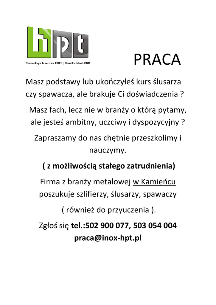 PRACA Masz podstawy lub ukończyłeś kurs ślusarza czy spawacza, ale brakuje Ci doświadczenia ? Masz fach, lecz nie w branży o którą pytamy, ale jesteś ambitny, uczciwy i dyspozycyjny ? Zapraszamy do nas chętnie przeszkolimy i nauczymy. ( z możliwością stałego zatrudnienia) Firma z branży metalowej w Kamieńcu poszukuje szlifierzy, ślusarzy, spawaczy ( również do przyuczenia ). Zgłoś się tel.:502 900 077, 503 054 004 [email protected]
